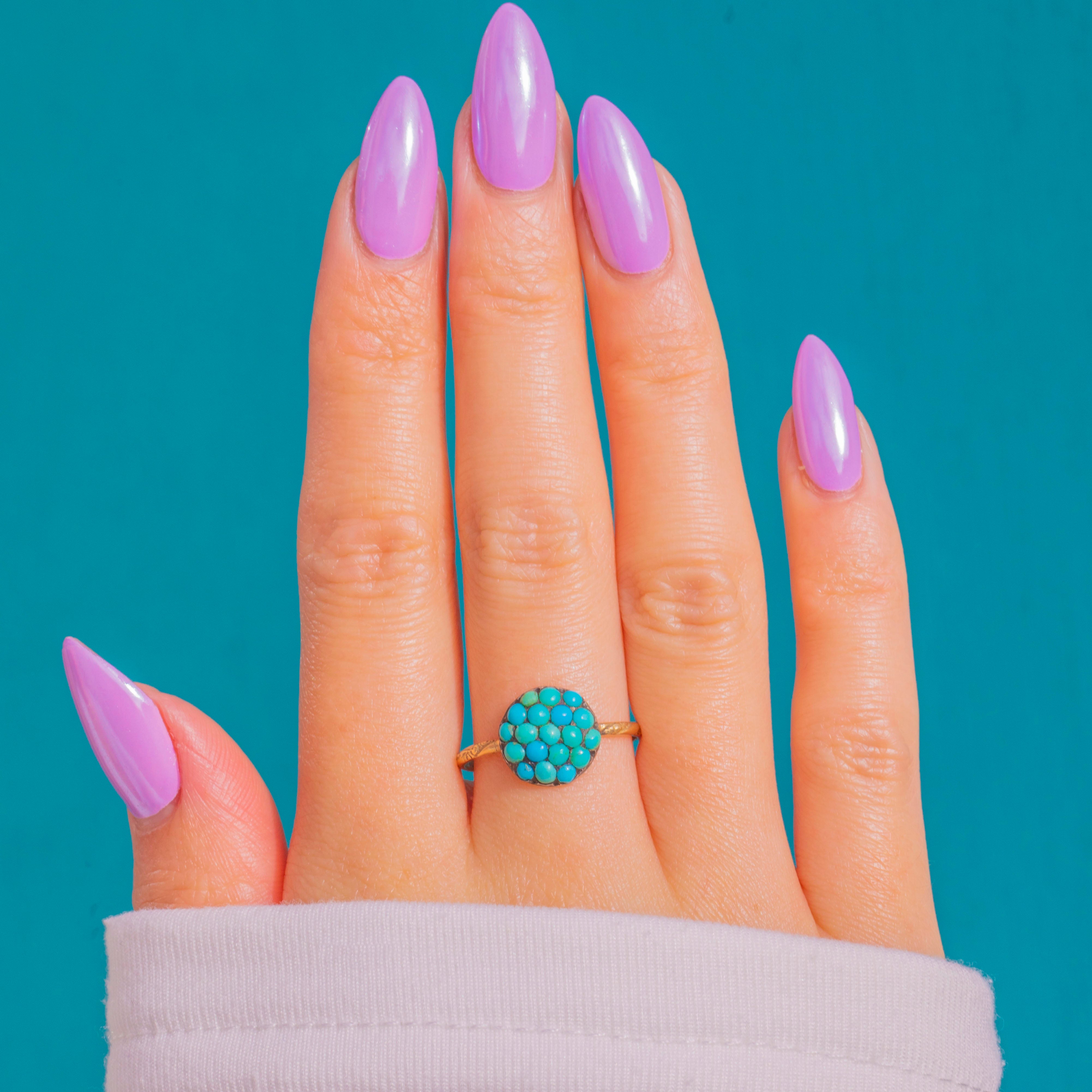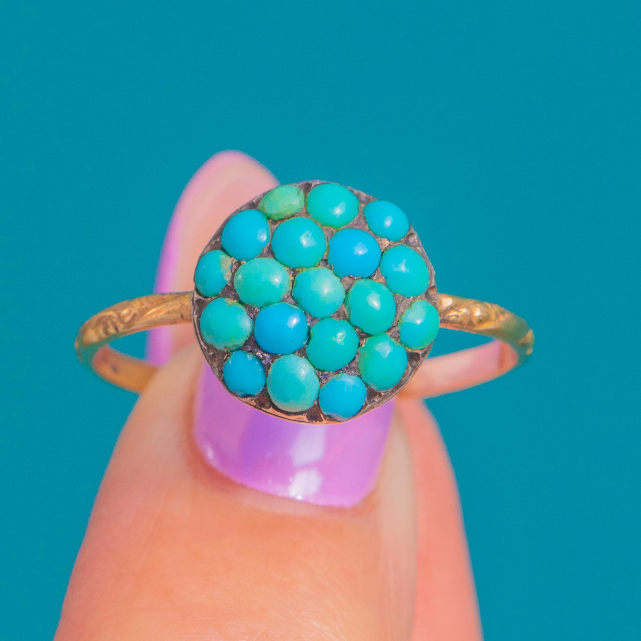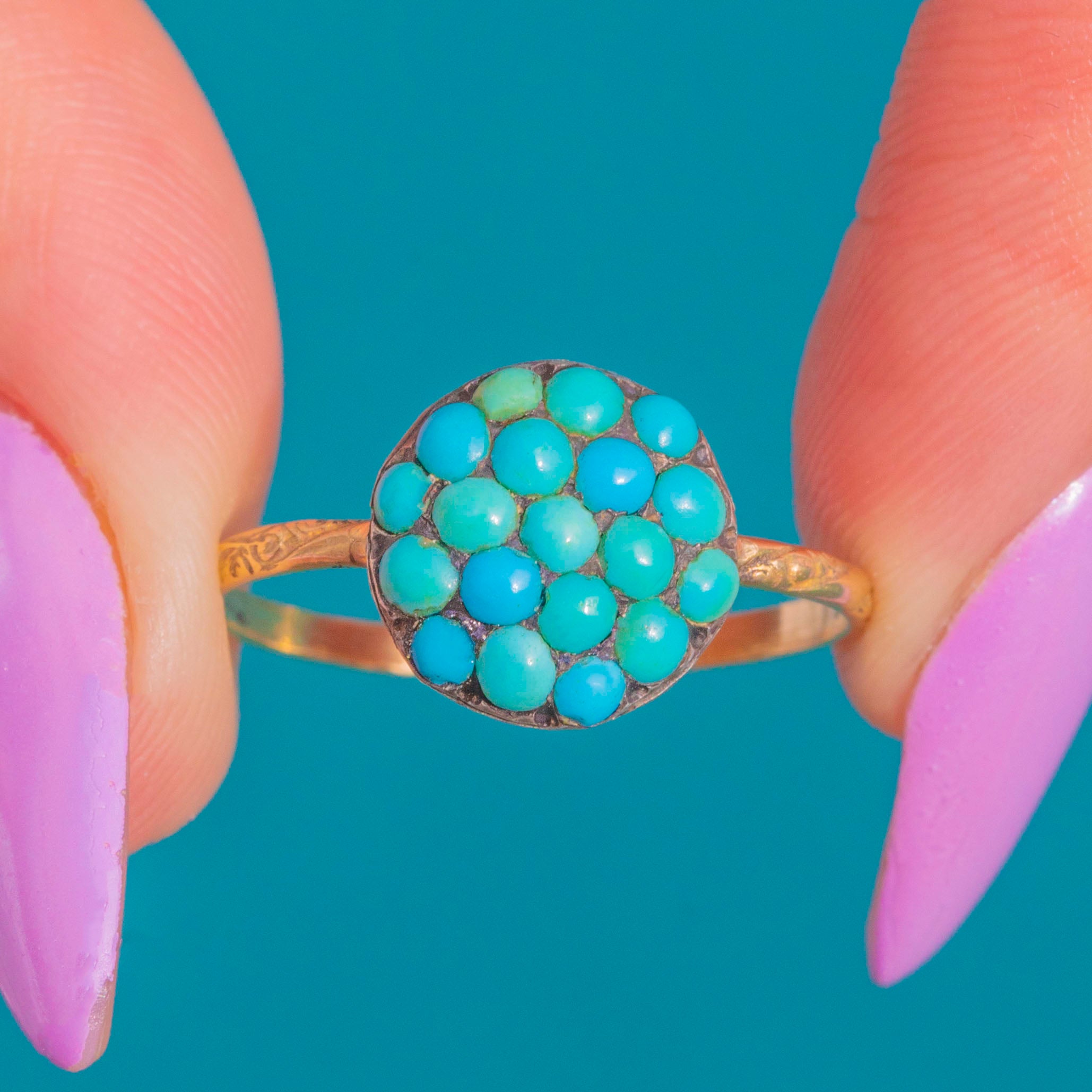 A dainty delight from the Victorian era, this 18ct Gold bombe ring blooms with a circular rosette of Turquoise cabochons. The gently domed cluster creates a pretty pop of blue-green, each cabochon nestled in neat settings for a timeless floral look.