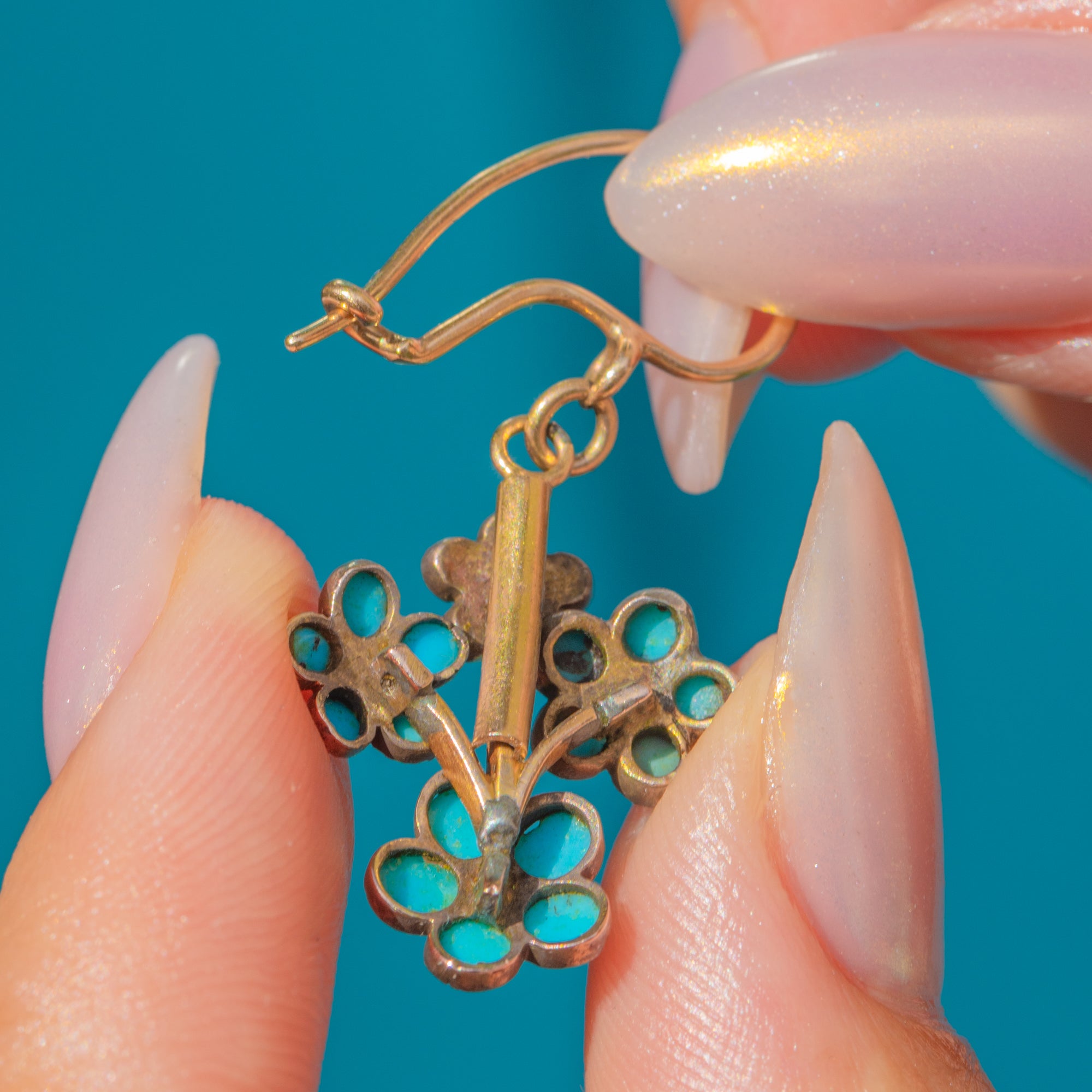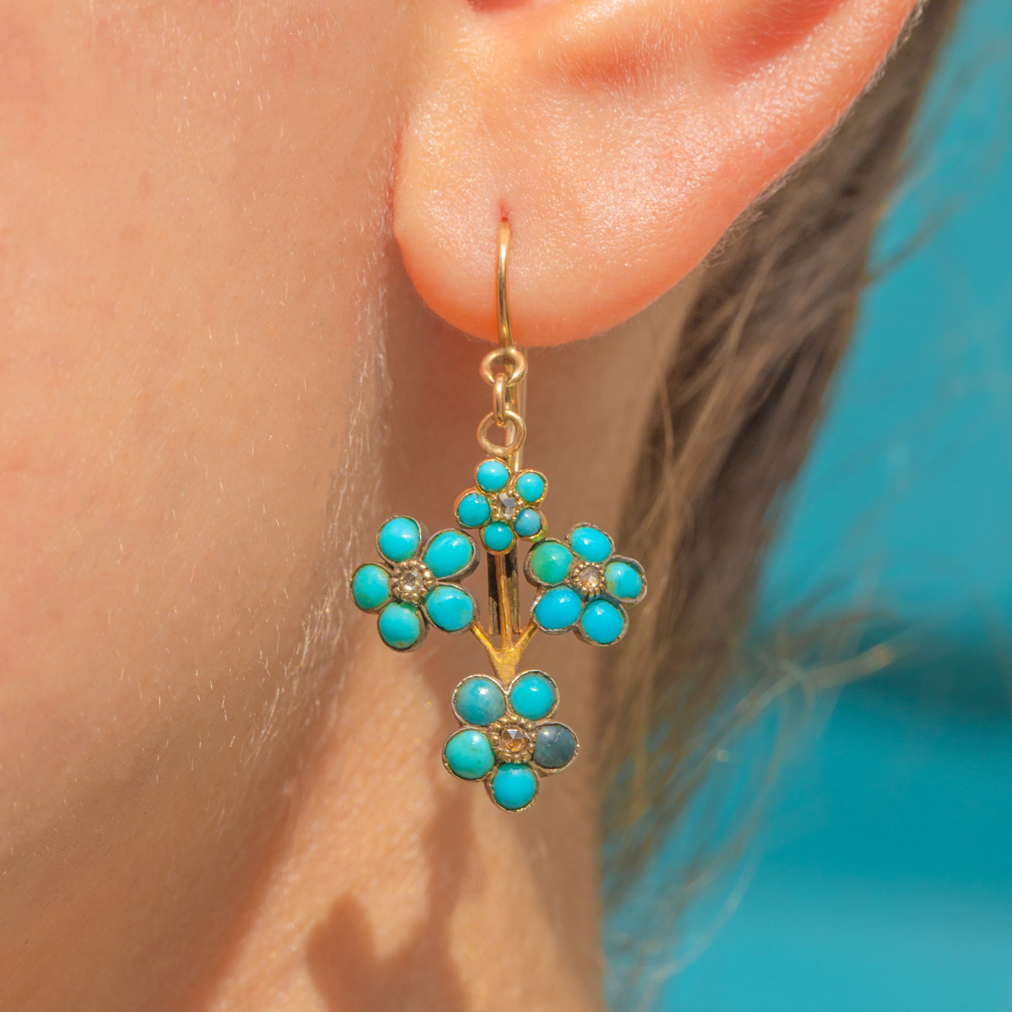 Delicate Victorian forget-me-not flower earrings set with Turquoise and Rose-Cut Diamonds in 18ct Gold and Silver, c.1880. Each earring is designed as a charming flowerhead, the vibrant Turquoise petals encircling a sparkling Rose-Cut Diamond centre, symbolising love and remembrance in the Victorian era.