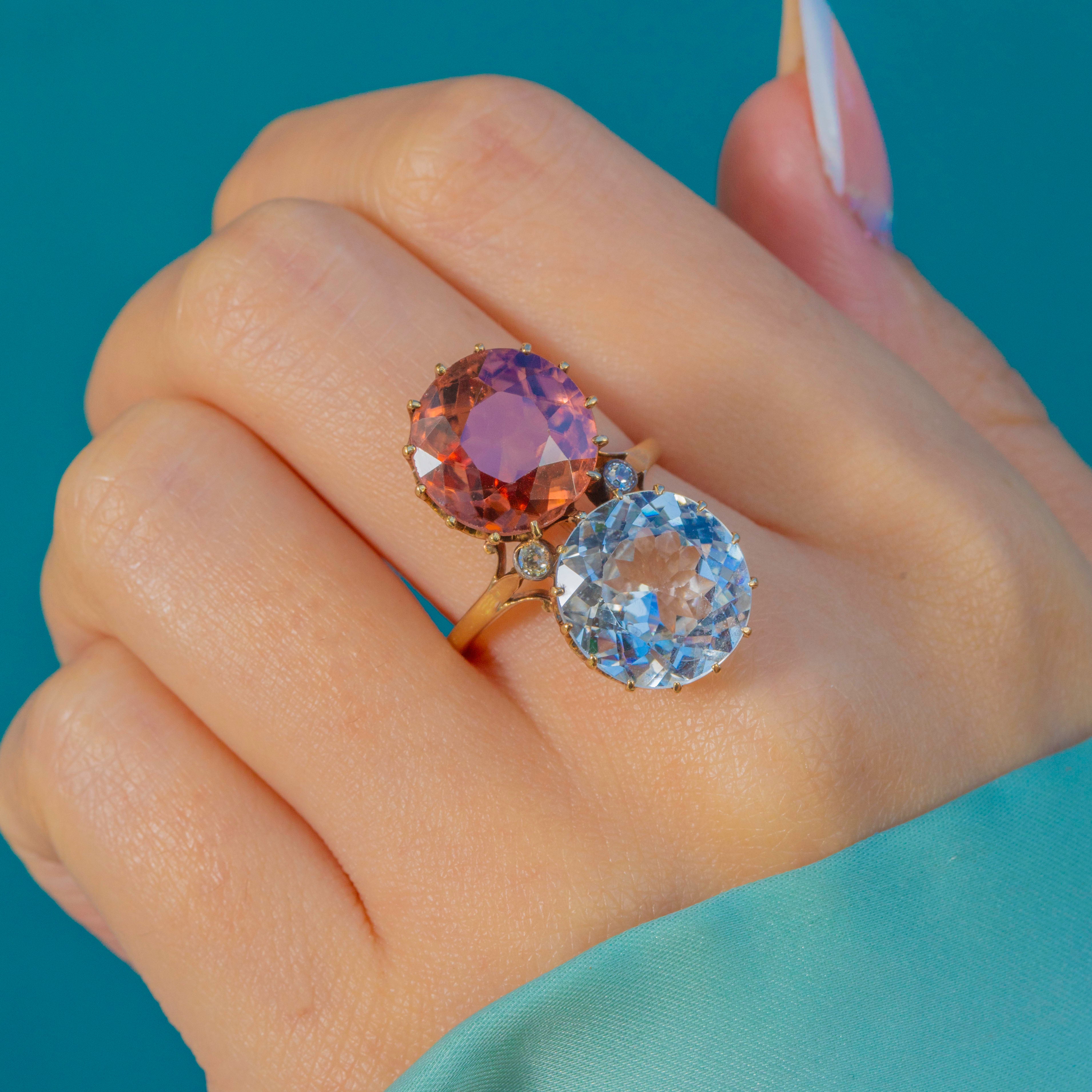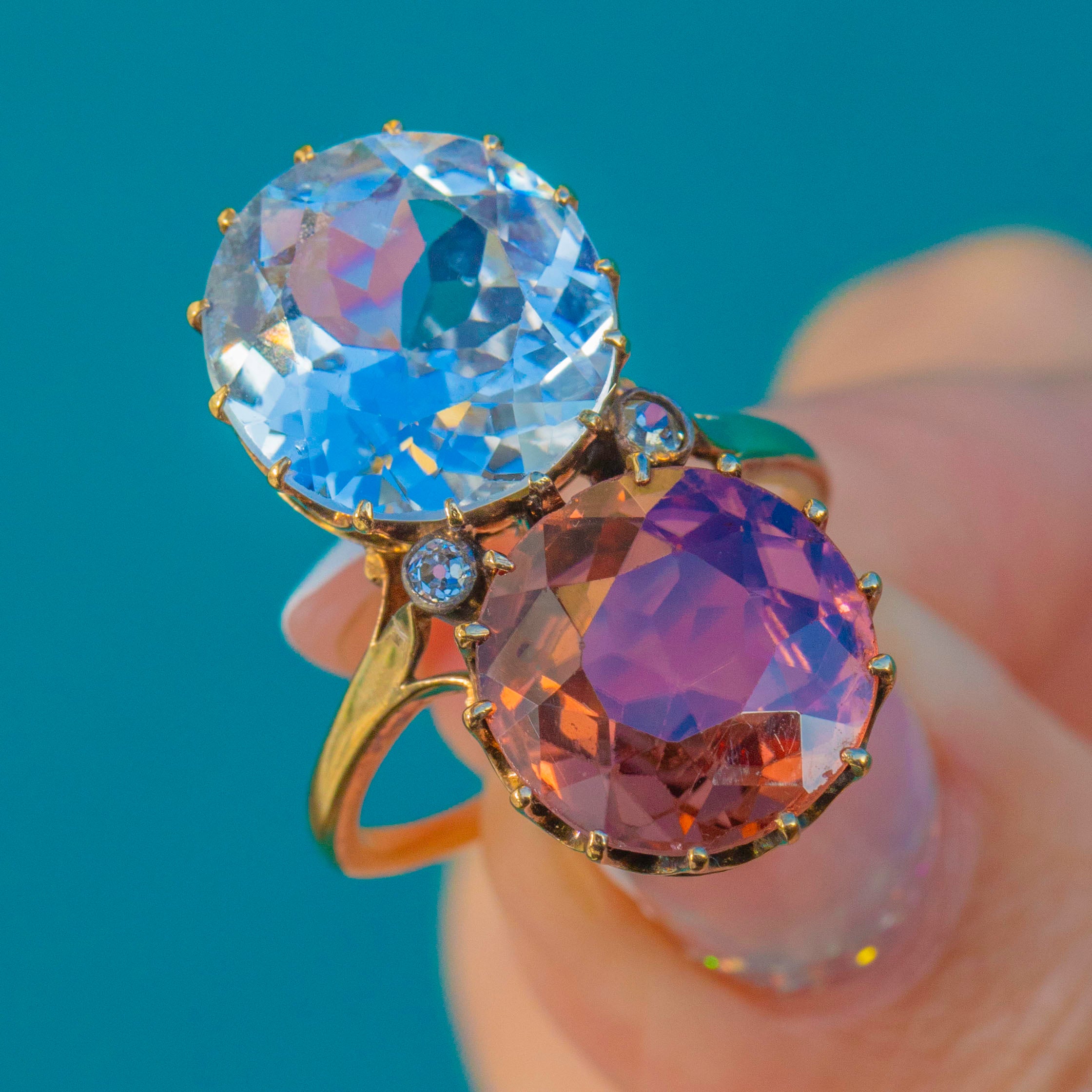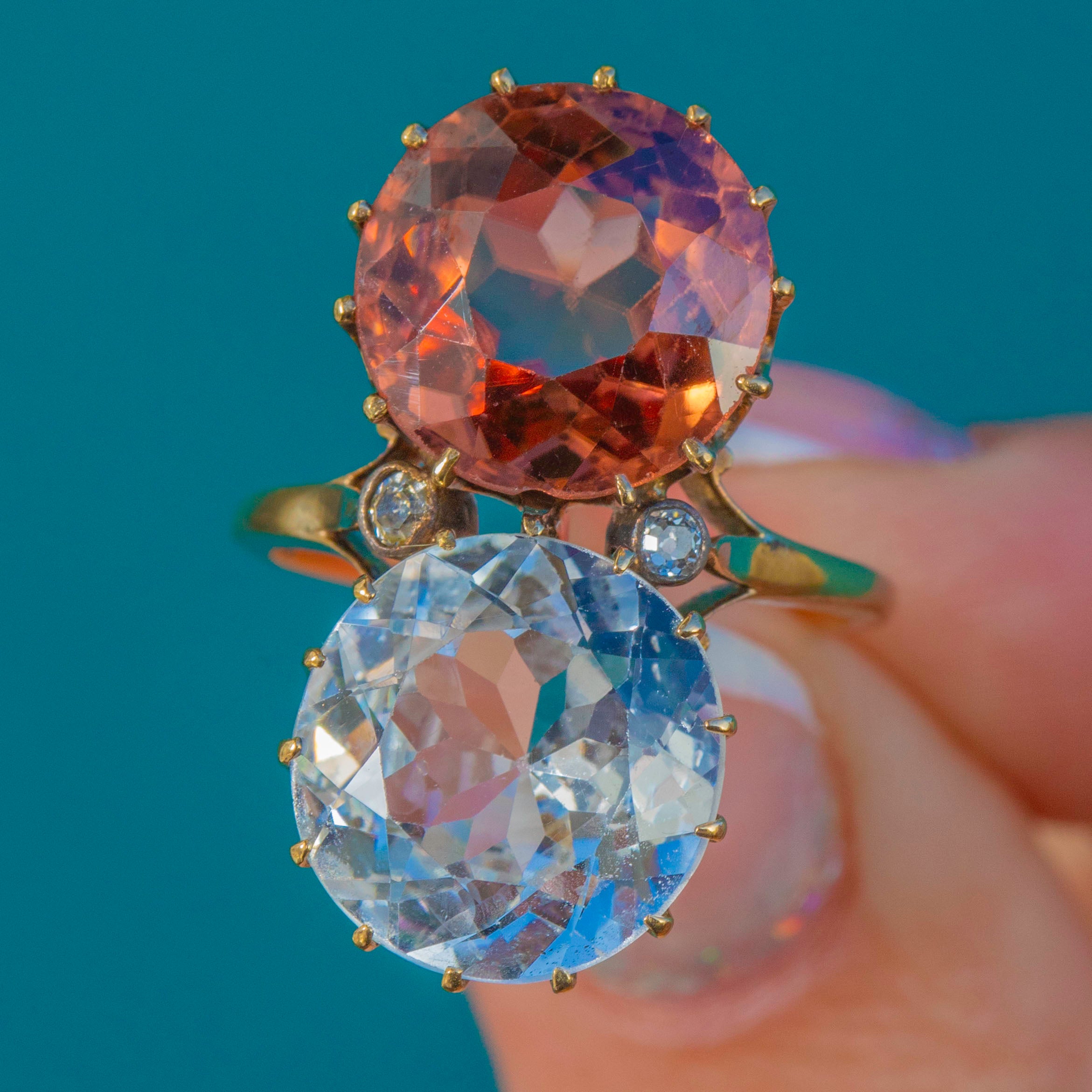 A striking Victorian toi et moi ring marrying colour, romance and scale. Twin antique round-cut Zircons—one an icy blue, the other a warm peach‑pink—rise proudly in tall coronet claw settings atop an 18ct Gold mount. Their open backs and airy, scalloped galleries invite the light, creating a vivid duet that dances across the finger.