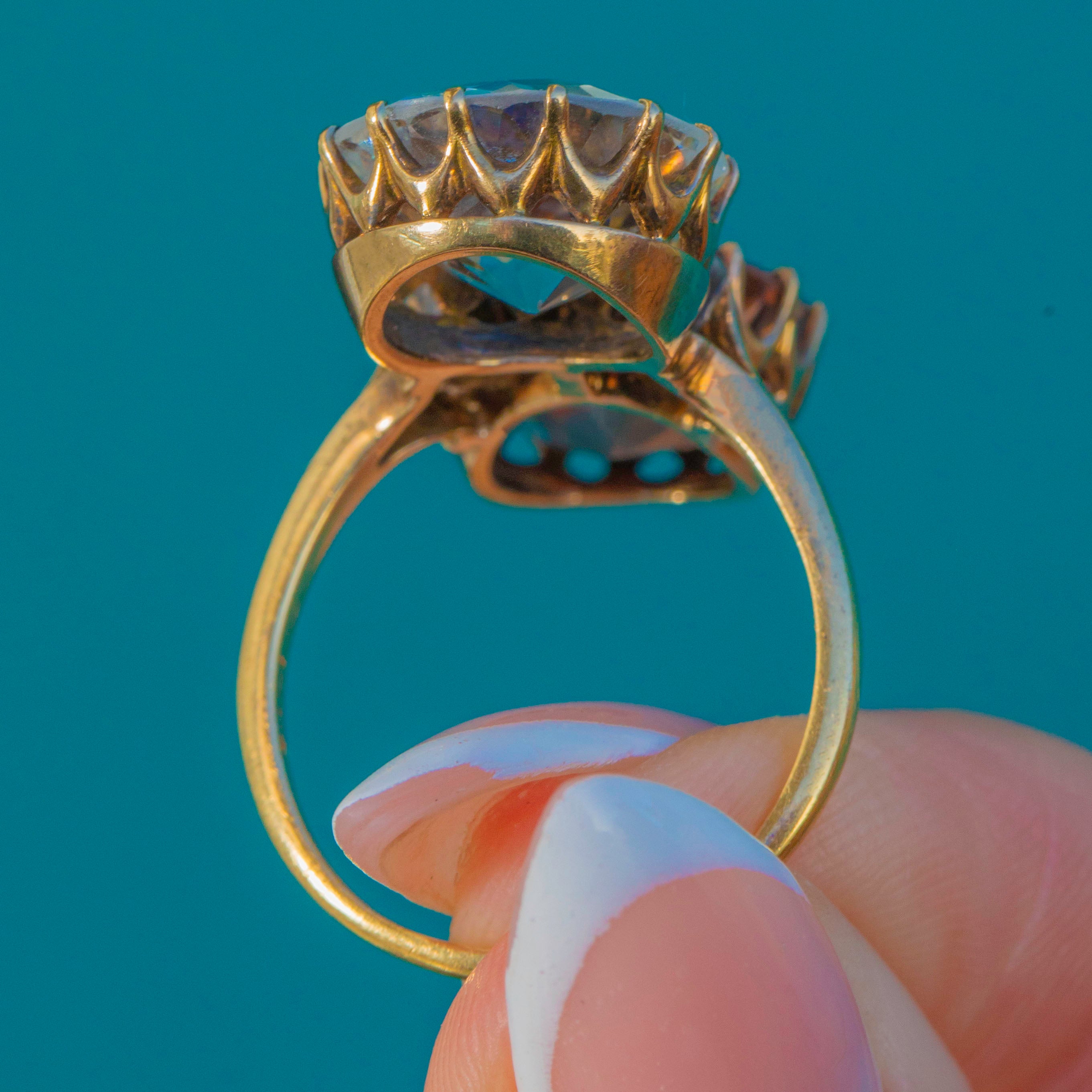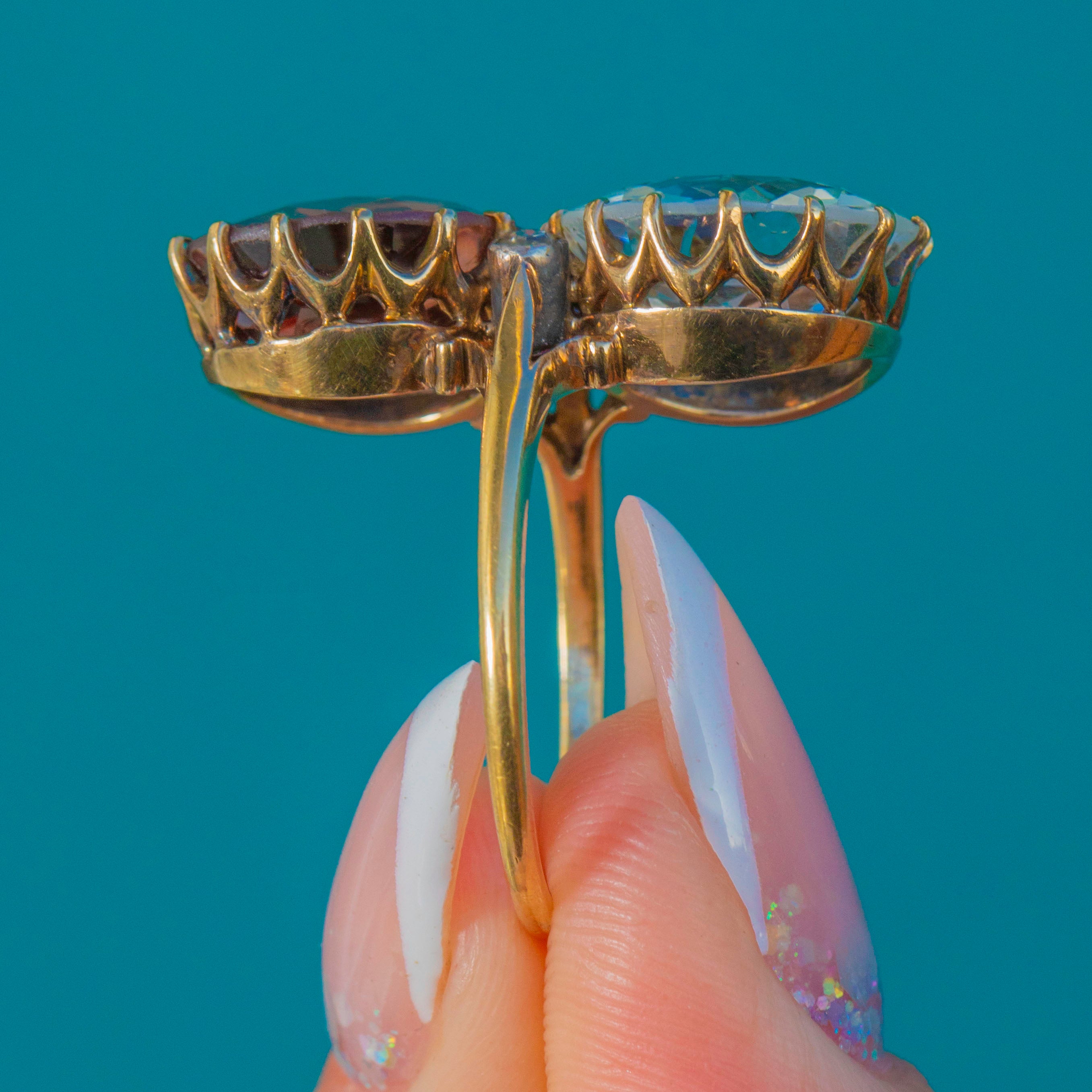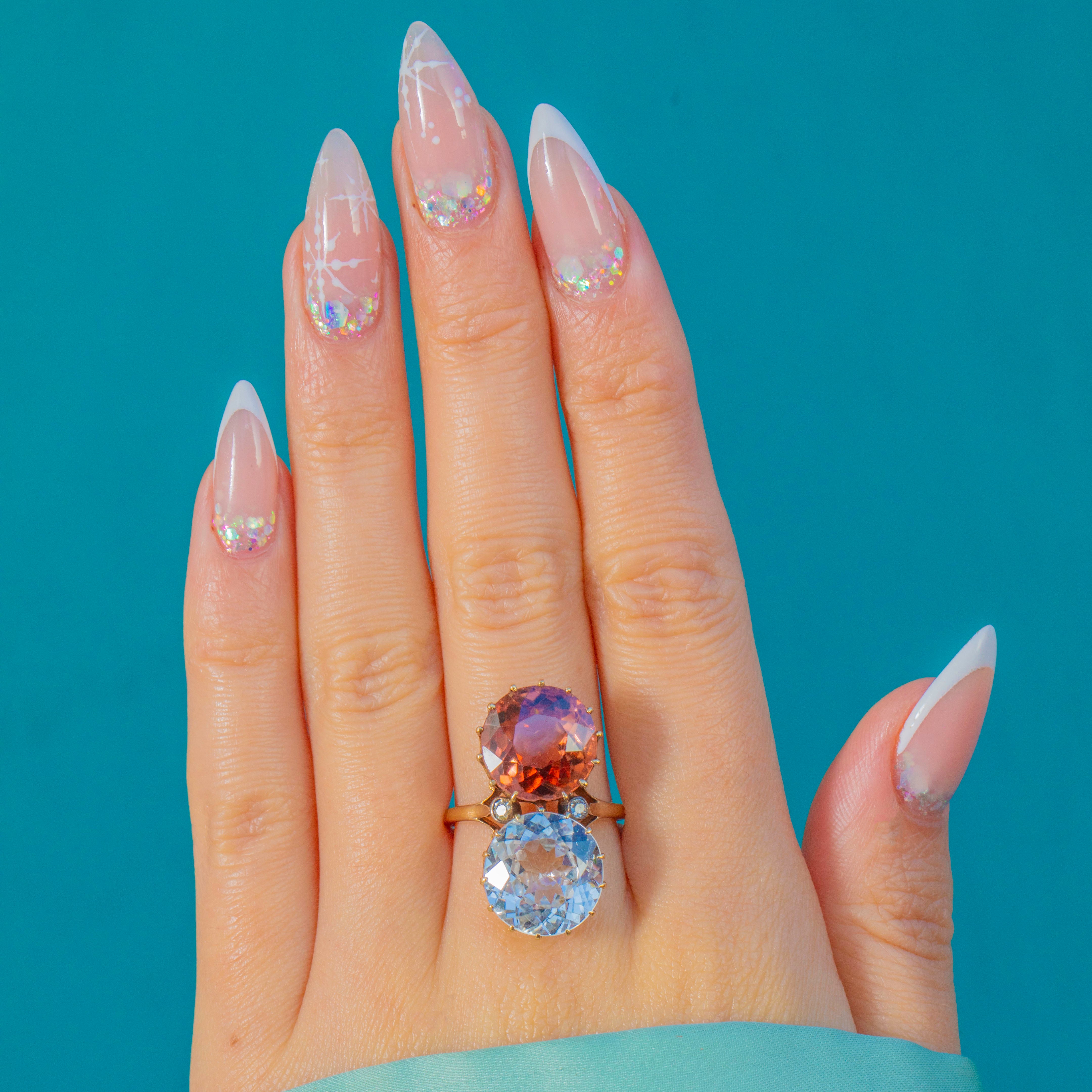 A striking Victorian toi et moi ring marrying colour, romance and scale. Twin antique round-cut Zircons—one an icy blue, the other a warm peach‑pink—rise proudly in tall coronet claw settings atop an 18ct Gold mount. Their open backs and airy, scalloped galleries invite the light, creating a vivid duet that dances across the finger.