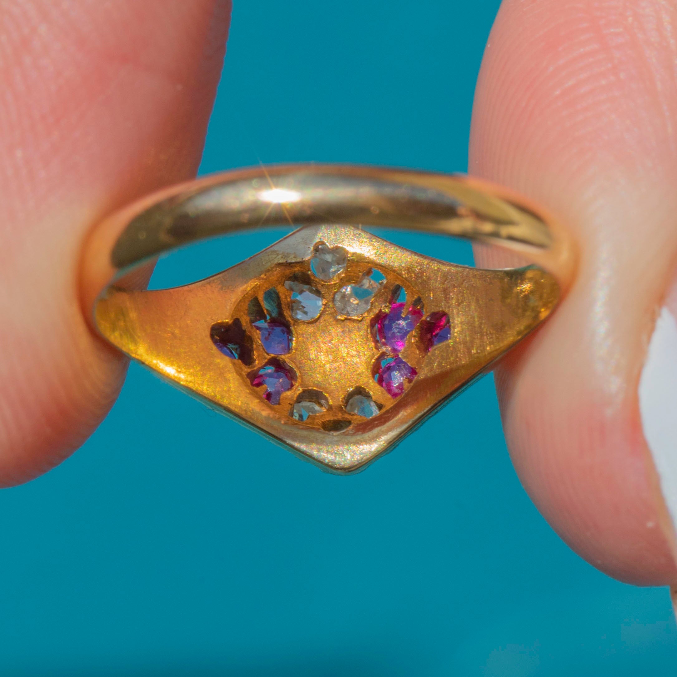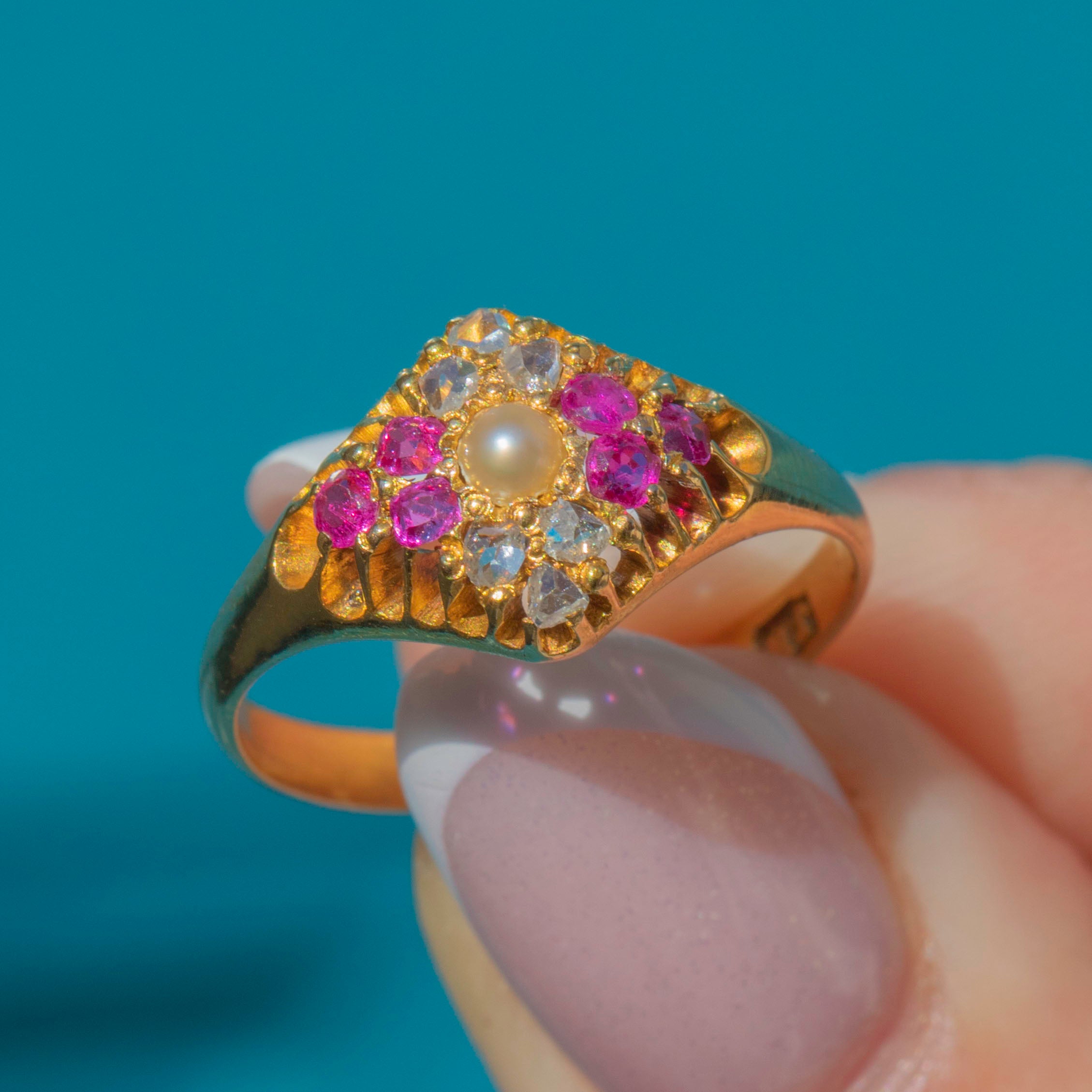 EXCELLENT: This Victorian 18ct Gold Ruby Diamond Pearl lozenge ring is in excellent condition. Each gemstone is radiant and secure in its claw settings, with very little signs of wear. Fully hallmarked and dated to 1876 and with a robust, chunky band, you'll be able to enjoy wearing this authentic piece of Victorian jewellery for many more years to come!