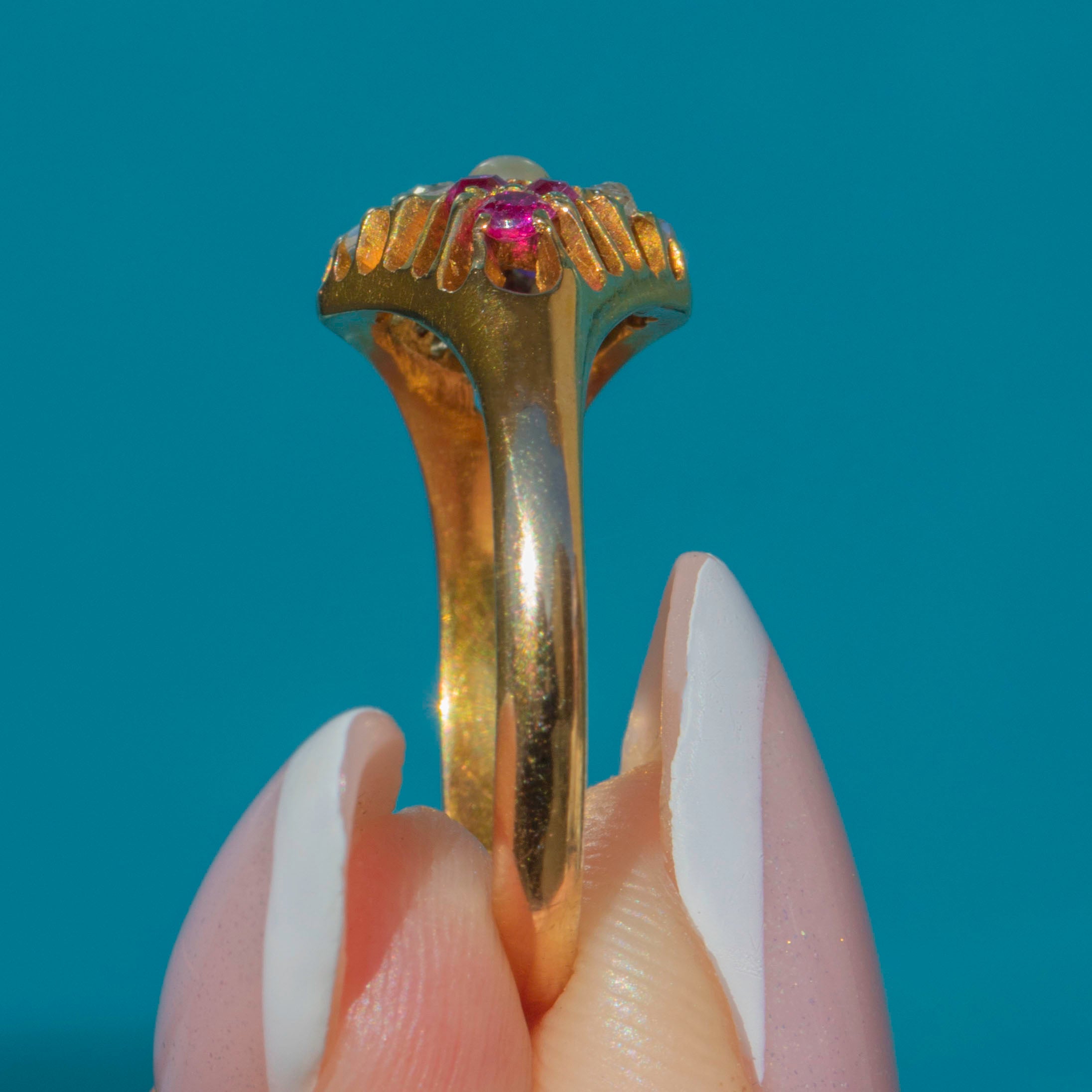 This Victorian 18ct Gold Ruby & rose-cut Diamond Pearl lozenge ring is an antique delight! Displaying a luxurious selection of gemstones, this Victorian ring boasts six fuchsia Rubies and six scintillating Diamonds surrounding an iridescent Pearl -what a treat!