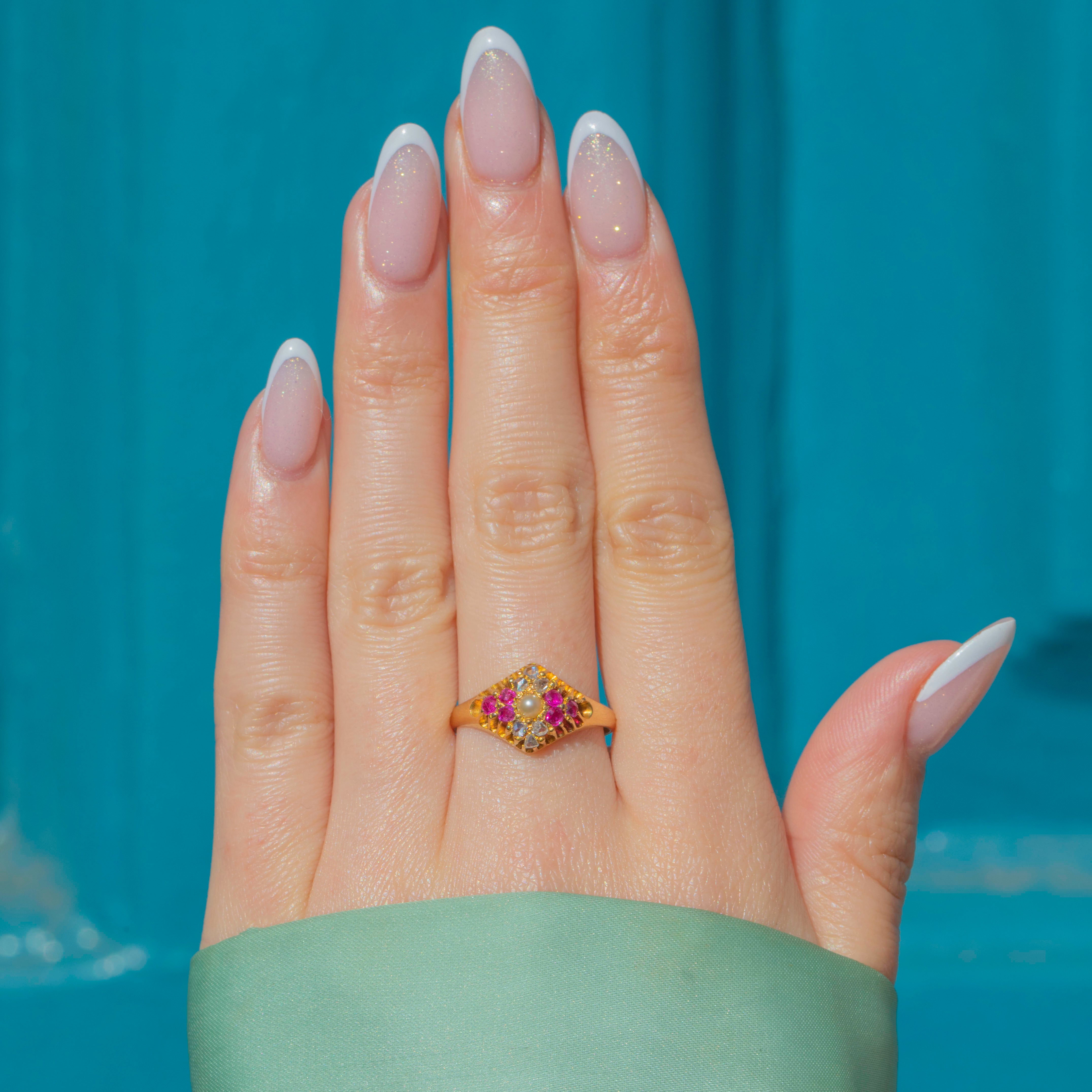 Victorian 18ct Gold Ruby Rose-Cut Diamond Pearl Lozenge Ring, c.1876