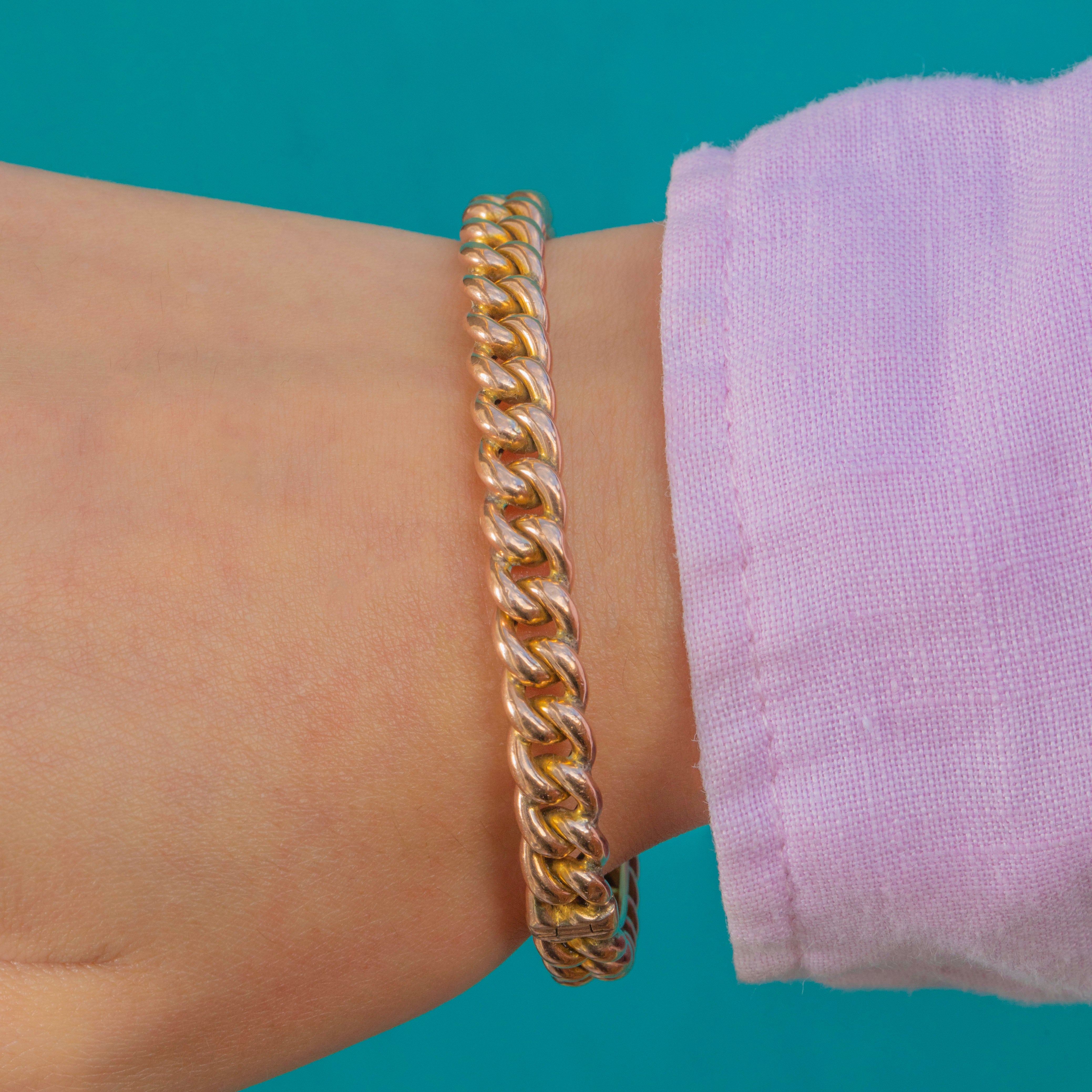 This antique 9ct Gold curb bangle is a gorgeous Victorian classic, dating to c.1900. The rounded curb links form a smooth, continuous row of Gold around the wrist, giving it a sleek yet substantial feel.