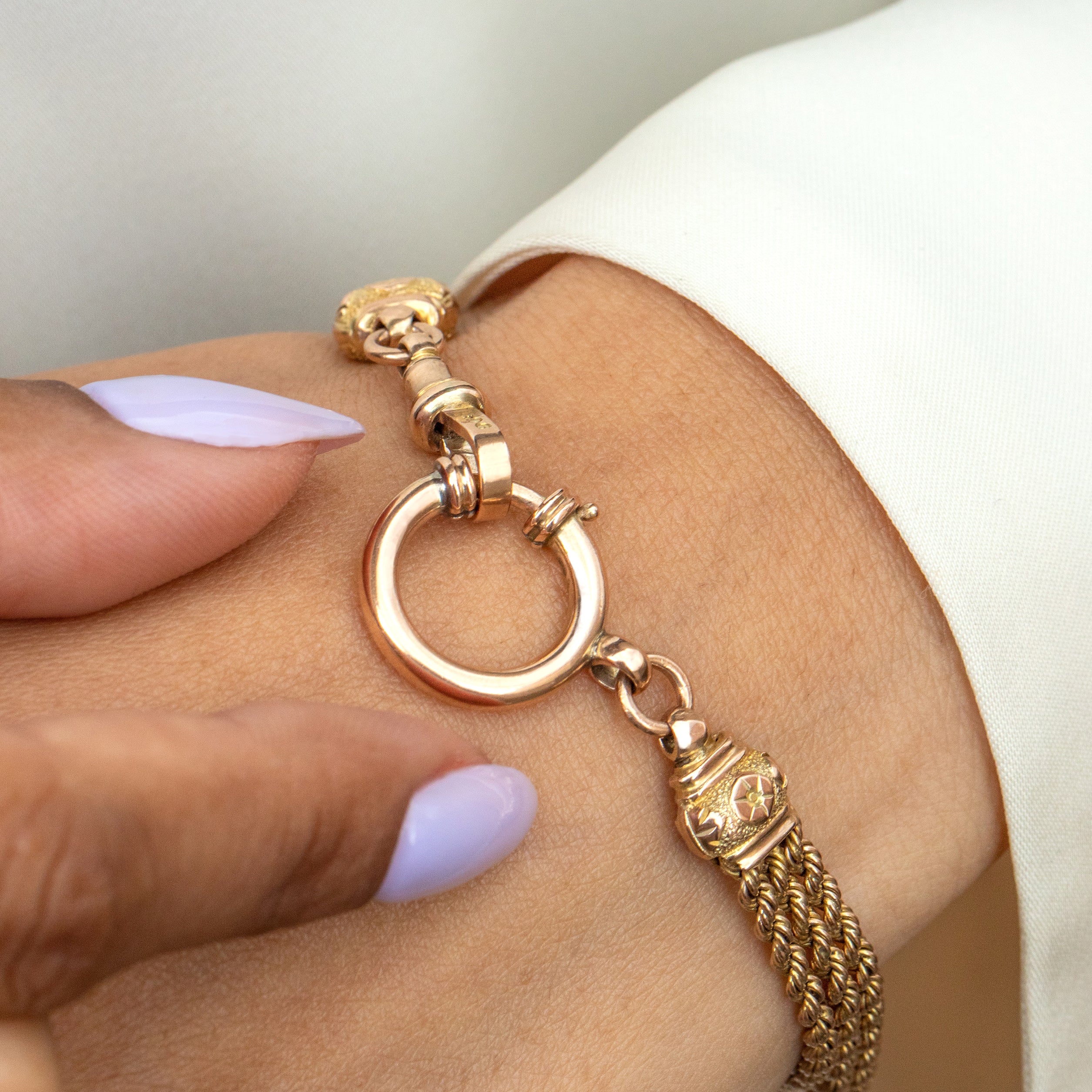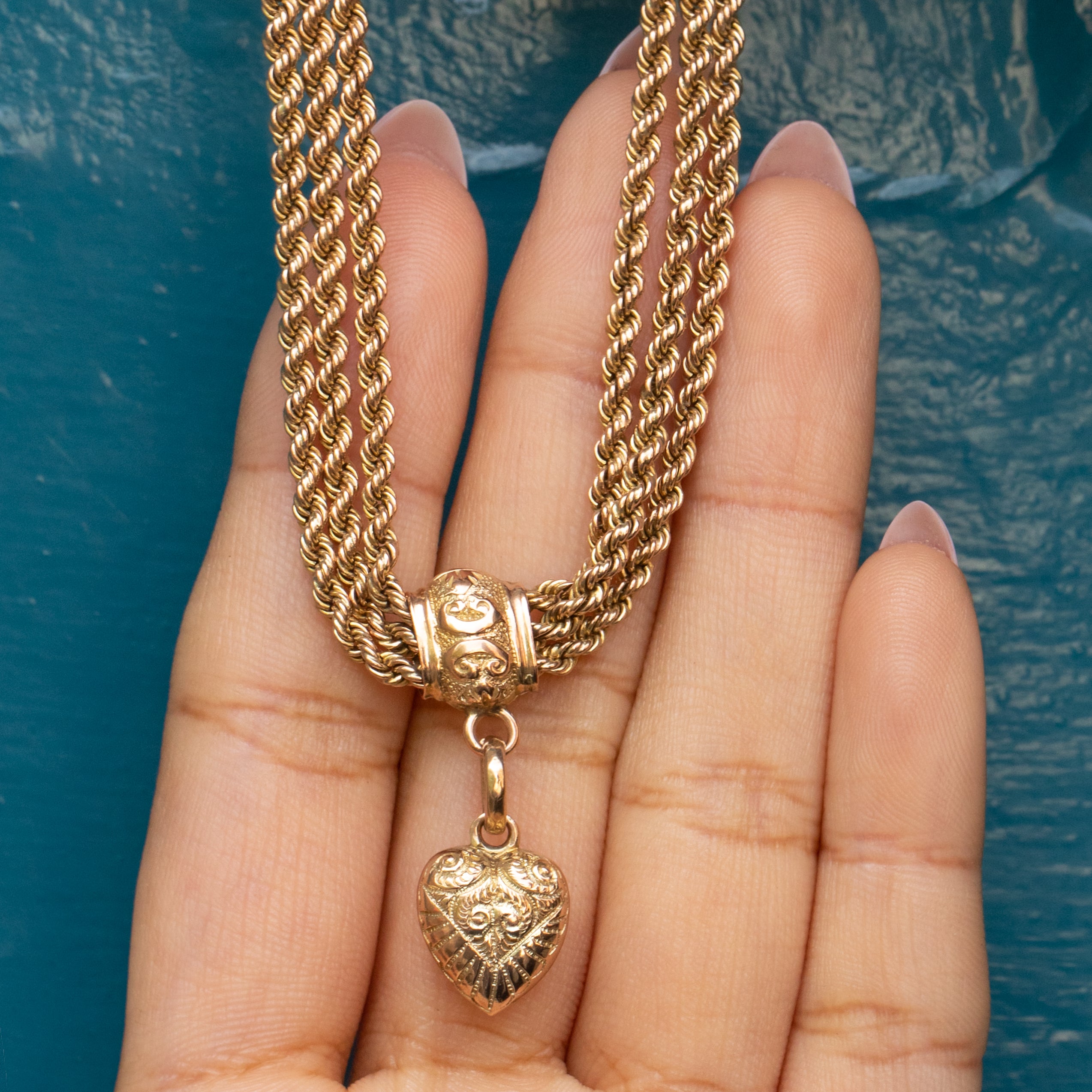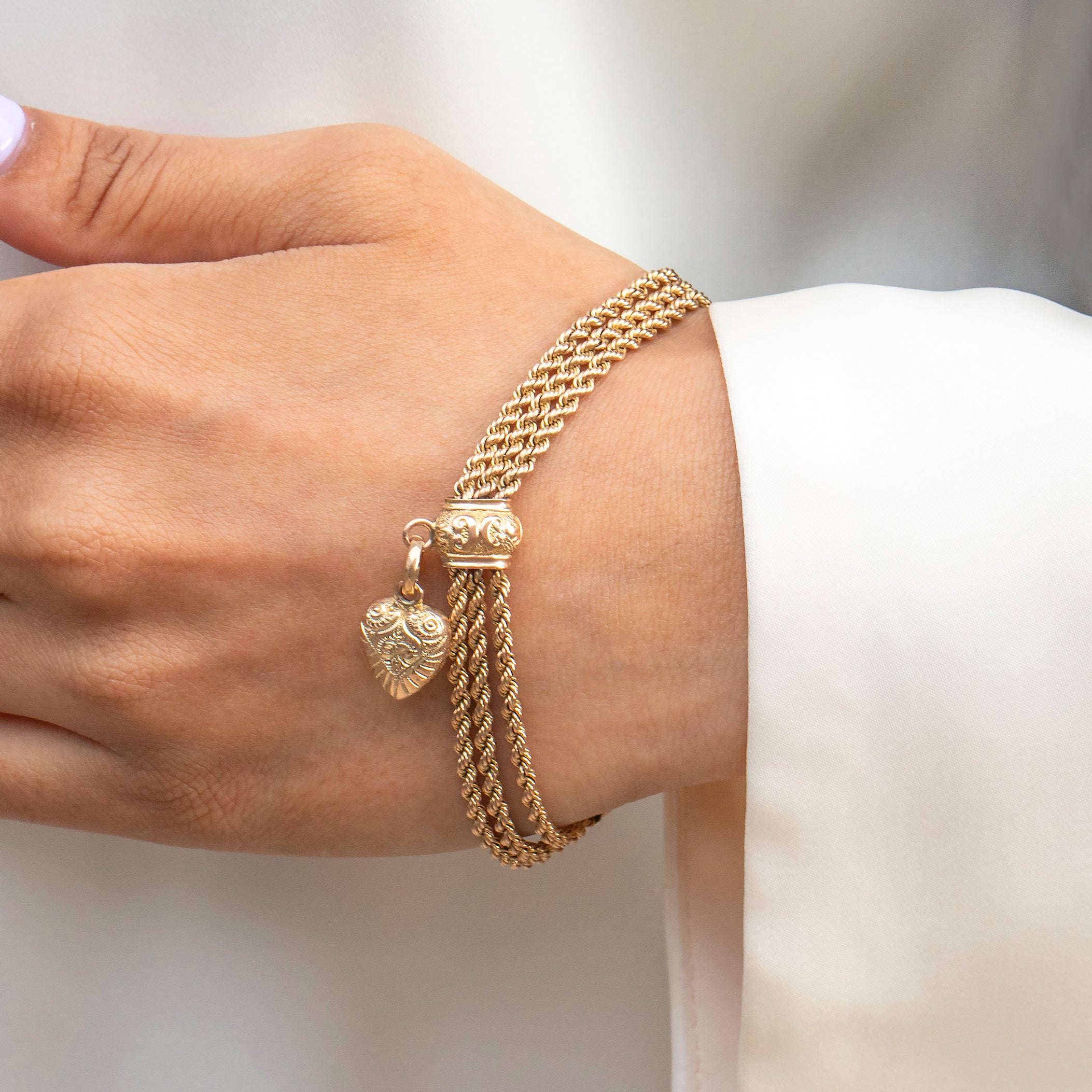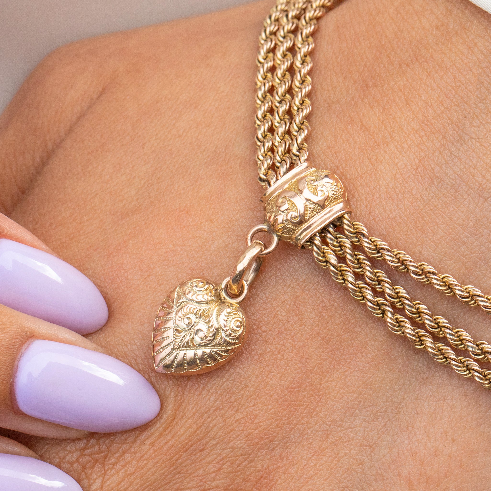 At the centre of attention hangs a puffy heart charm, delicately engraved with swirling patterns, suspended between three strands of chunky rope chains. Crafted from solid 9ct Gold throughout, this antique Albertina bracelet will bring undeniable luxury to your attire!
