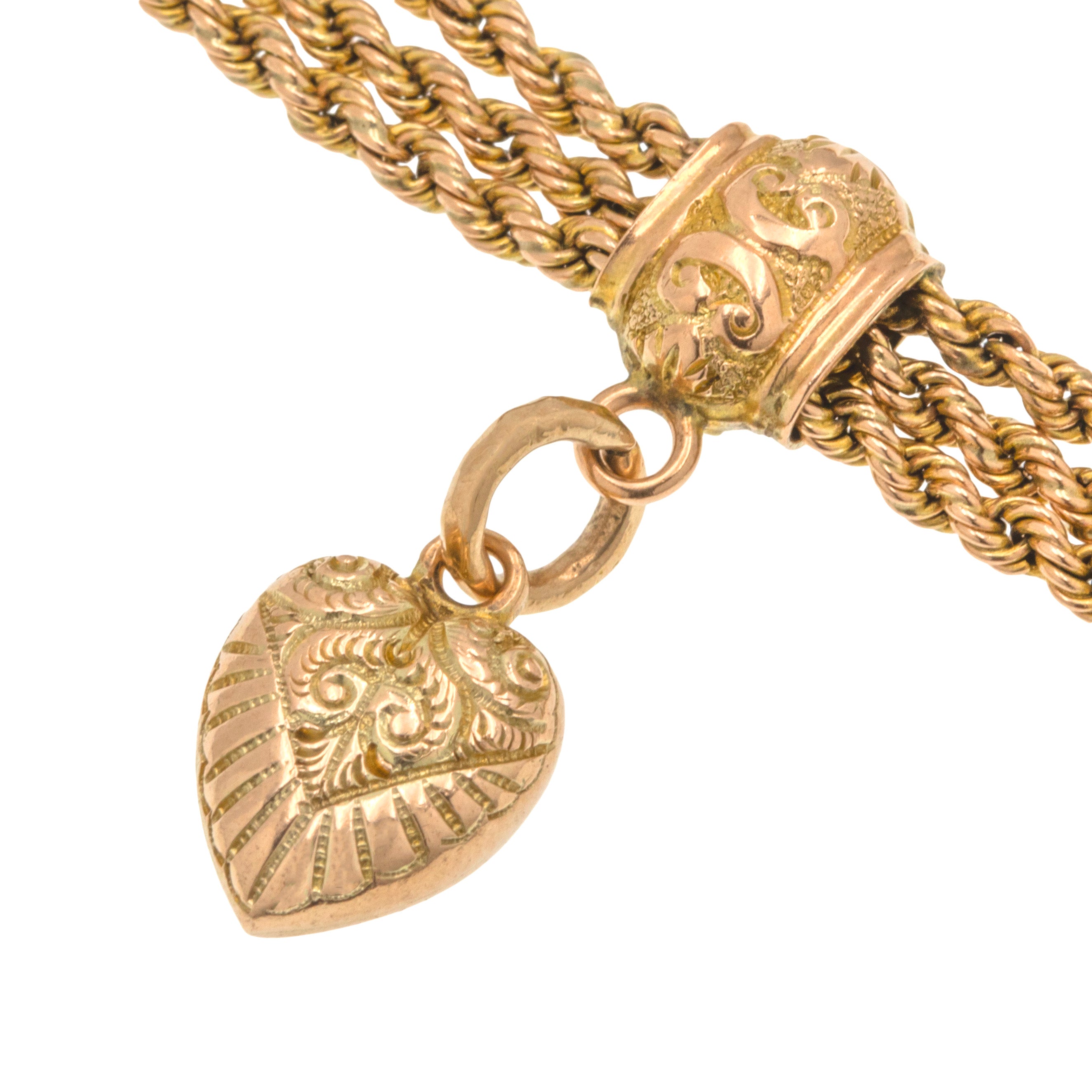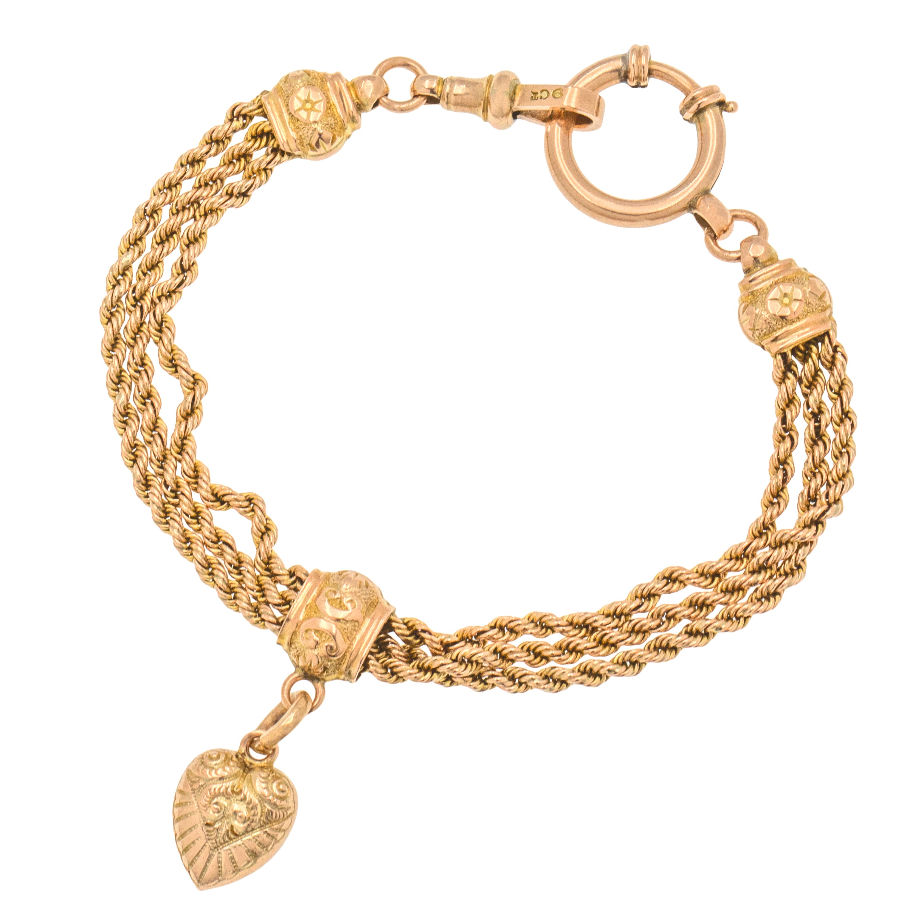 EXCELLENT. This Victorian 9ct Gold Albertina bracelet is offered in excellent condition. The heart charm has retained its puffy form impeccably well and is securely affixed to the bracelet. The 9ct Gold is buttery throughout and the rope chains are securely interlinked. The dog clip and bolt ring are in perfect working condition allowing you to wear this phenomenal Victorian bracelet confidently!