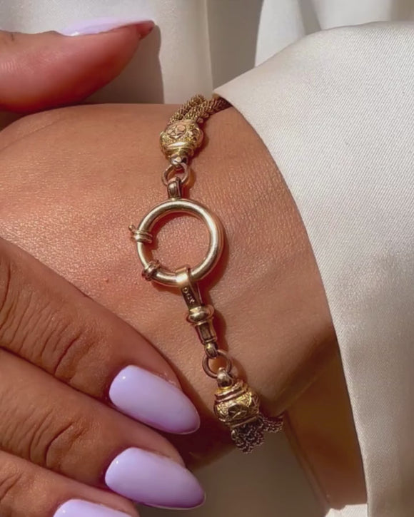 This exquisite Victorian 9ct Gold Albertina bracelet, complete with an engraved puffy heart, has been made with meticulous attention to detail and drapes across the wrist with elegance. The gentle curves and intricate detailing perfectly capture the craftsmanship of the Victorian era, closing with no less than a bolt-ring and dog-clip.