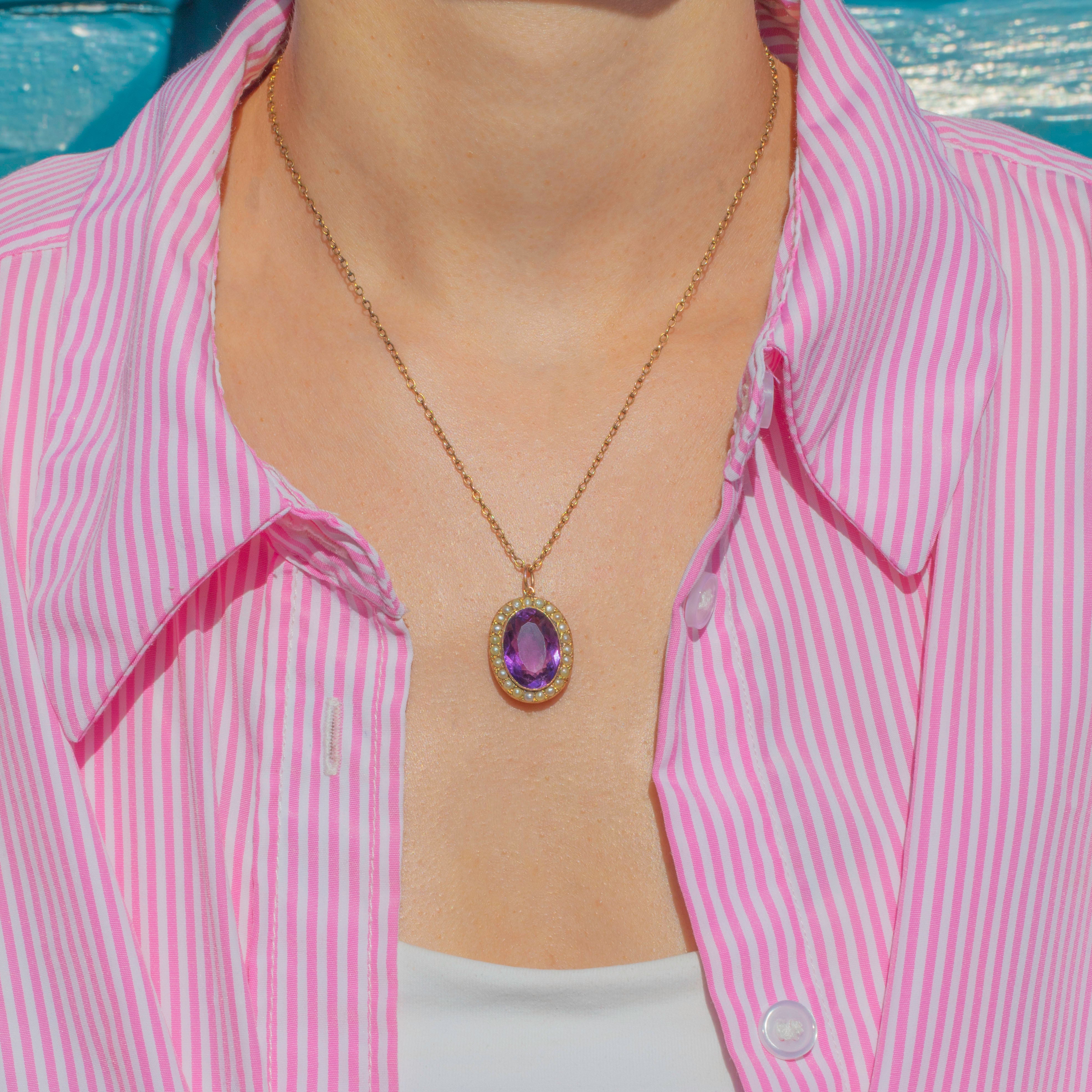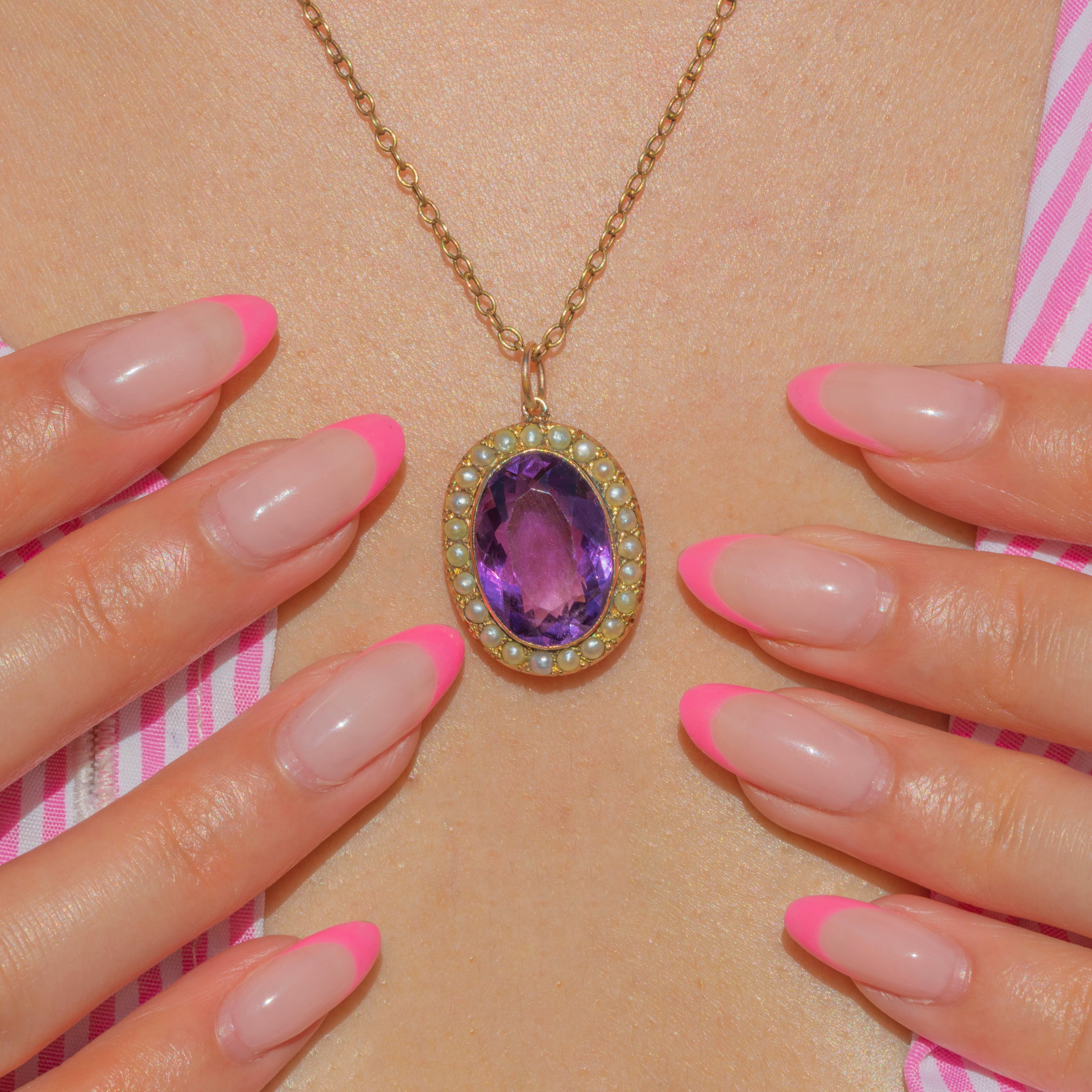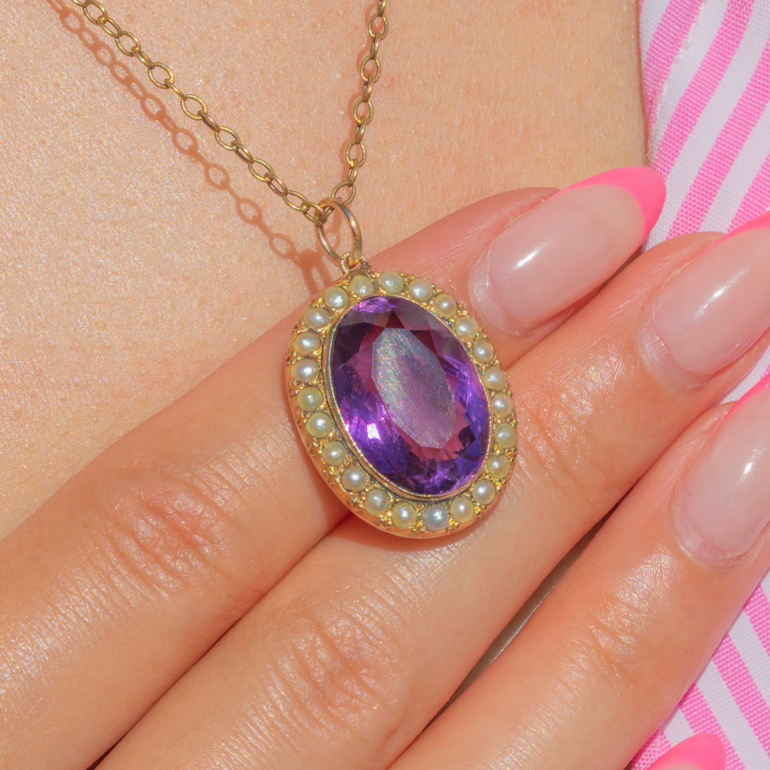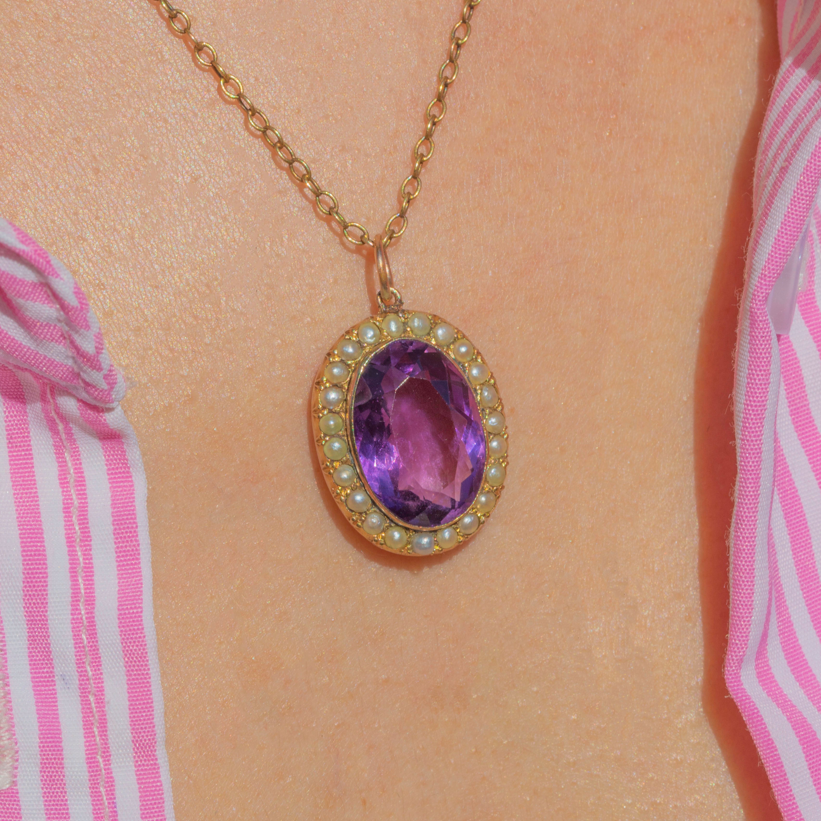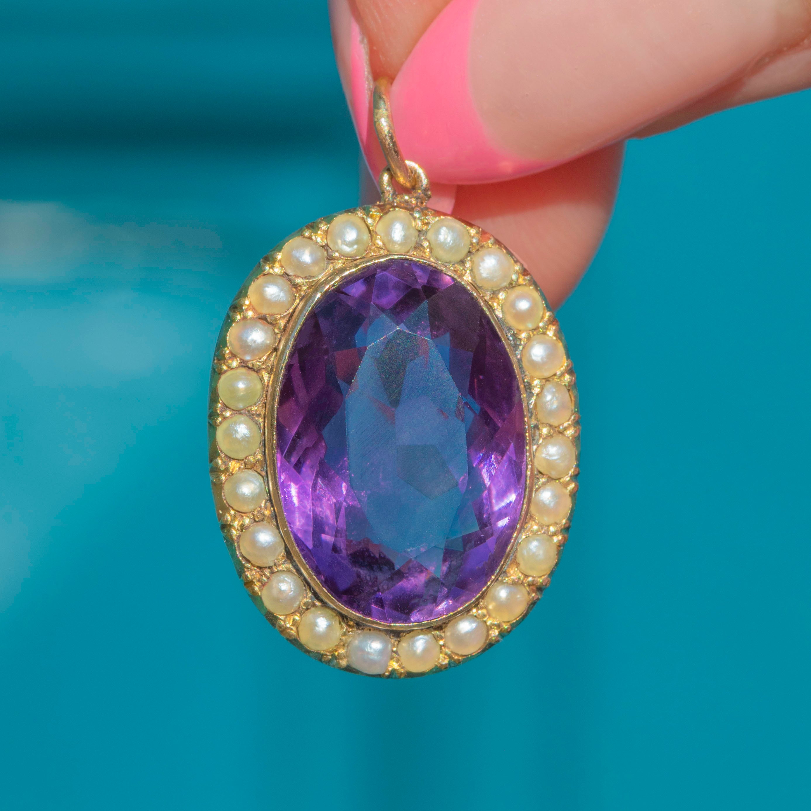 Liven up your collection with this regal Victorian 9ct Gold 6.30ct Amethyst and Pearl cluster pendant!