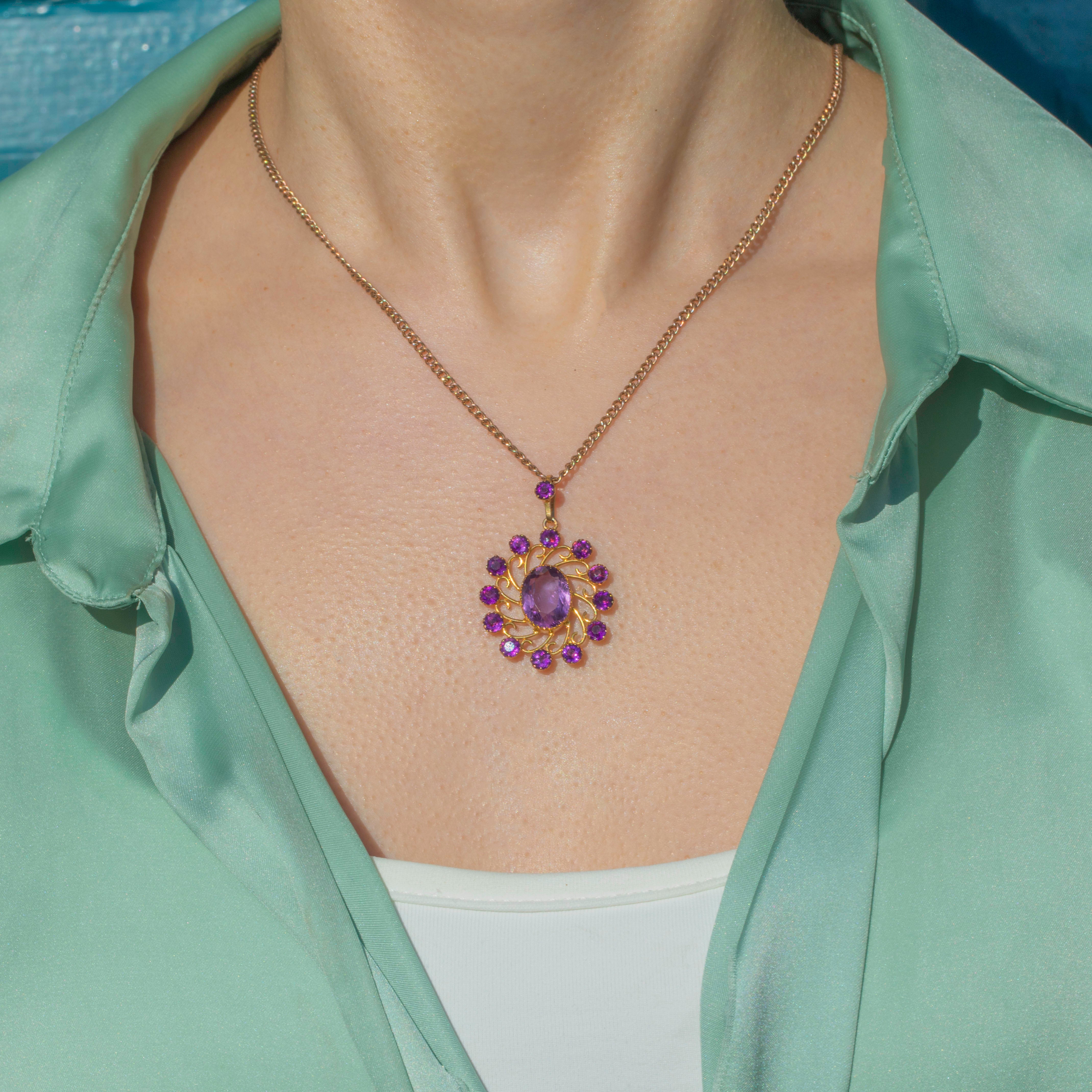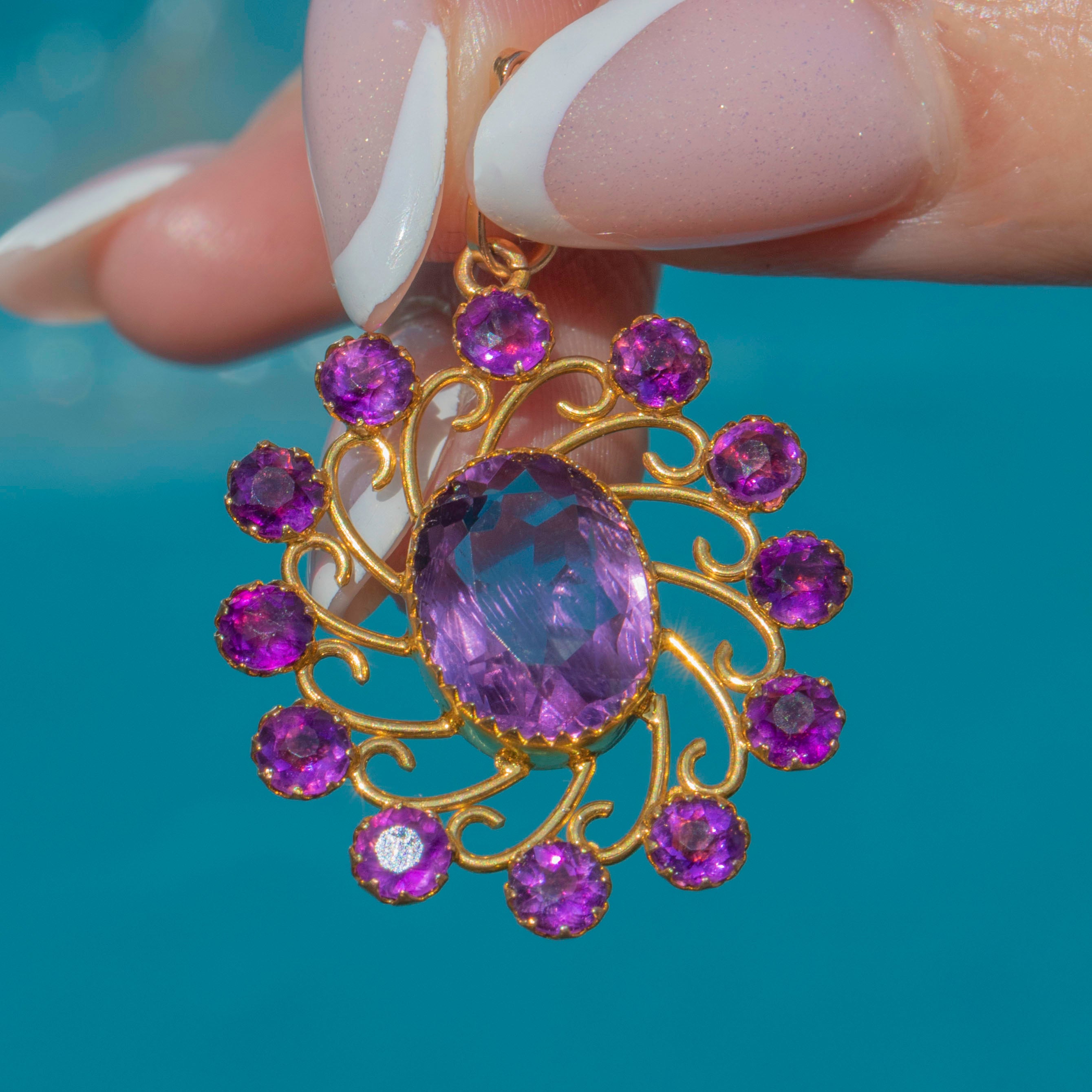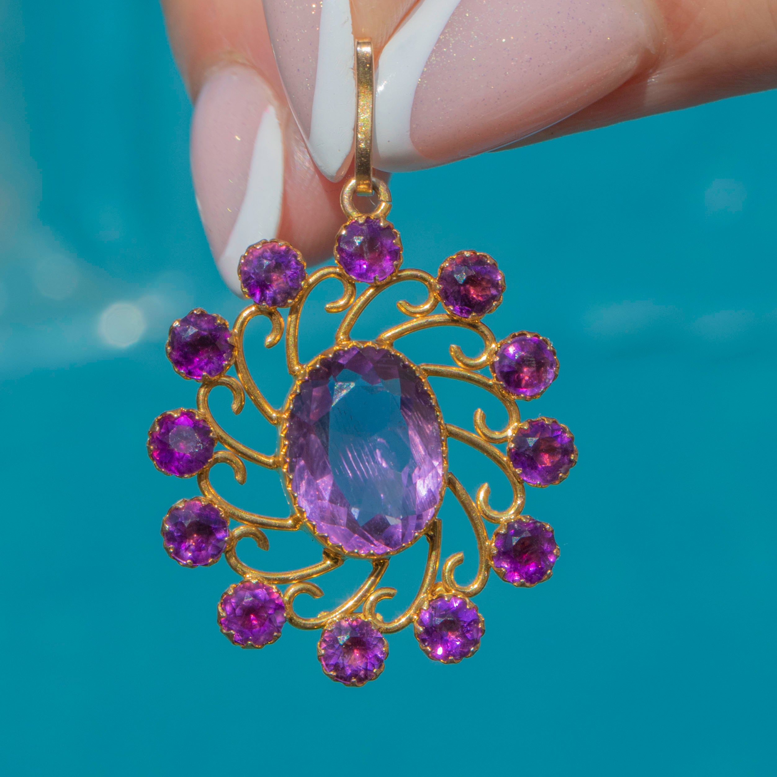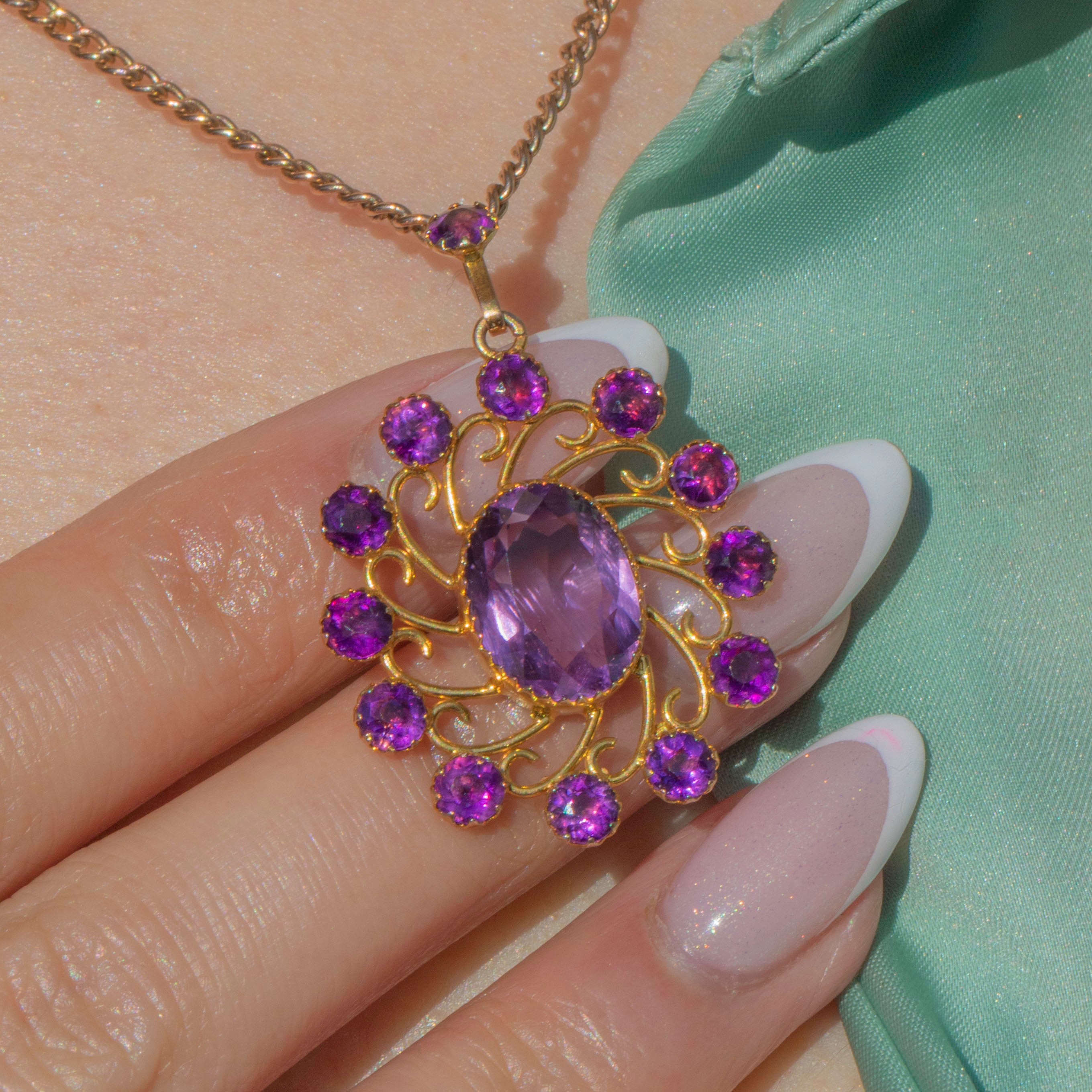 EXCELLENT. An excellently presented early Victorian 9ct Gold Amethyst swirl pendant! This piece has gorgeous Amethysts with deep purple hues. Each stone is securely set and the central Amethyst has a lovely natural inclusion, paying homage to Mother Nature and adding to her antique charm. The piece is in impeccable condition for its age with a clear "9CT" stamp and beautiful plump closed-back settings that are smooth all along the border making this pendant comfortable to wear.