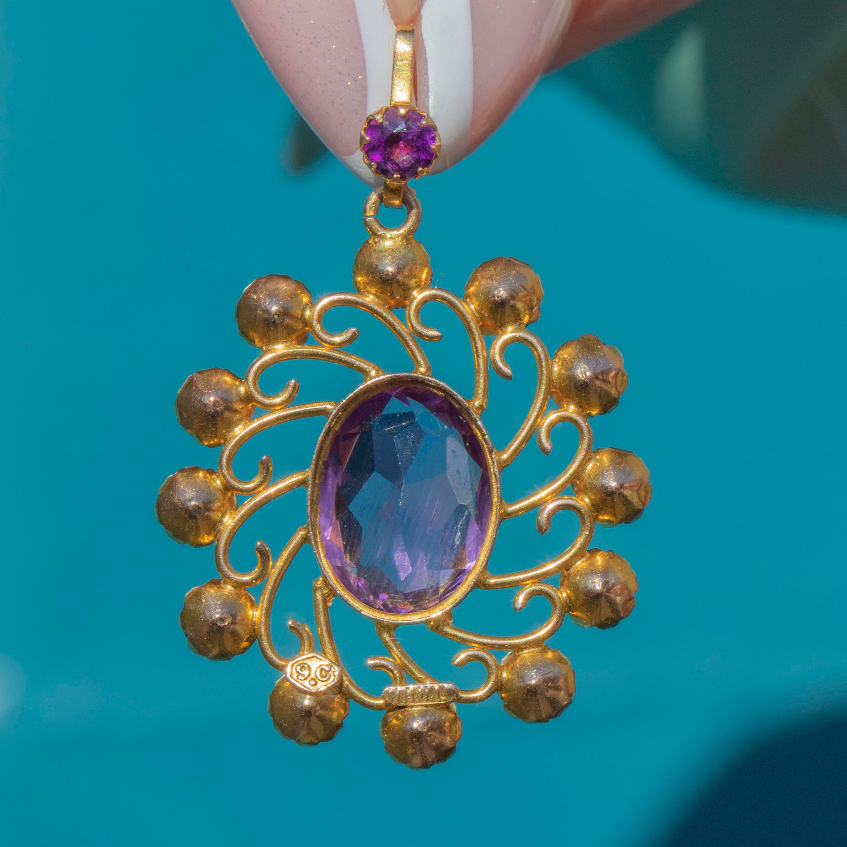 This Victorian 9ct Gold Amethyst swirl pendant is a standout piece! The rich purple Amethysts will instantly grab your attention, marrying beautifully with the bright 9ct yellow Gold to create a luxurious colour palette.