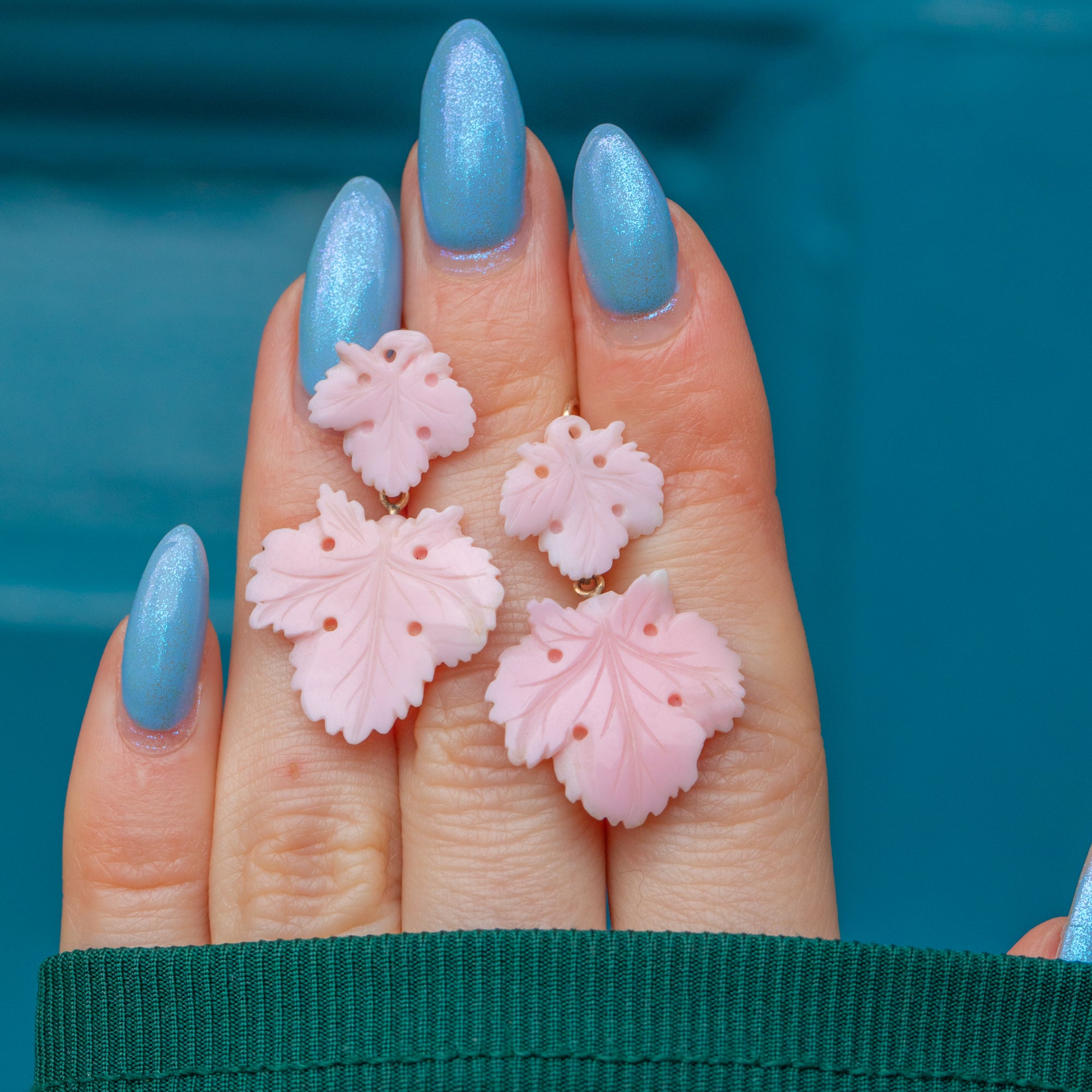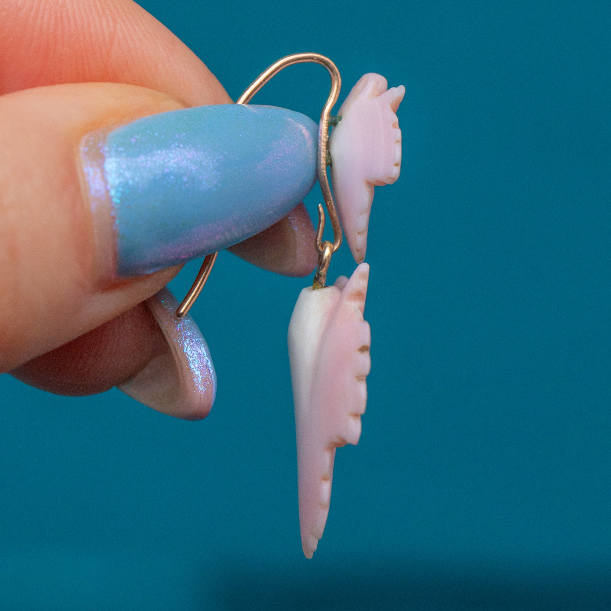 These Victorian 9ct Gold angel skin Coral leaf drop earrings are divine! With buttery 9ct Gold hooks, each drop earring features two maple leaves, crafted meticulously from delicate angel skin Coral. Each boasts a stunning soft pink saturation, with intricate leafy detailing.