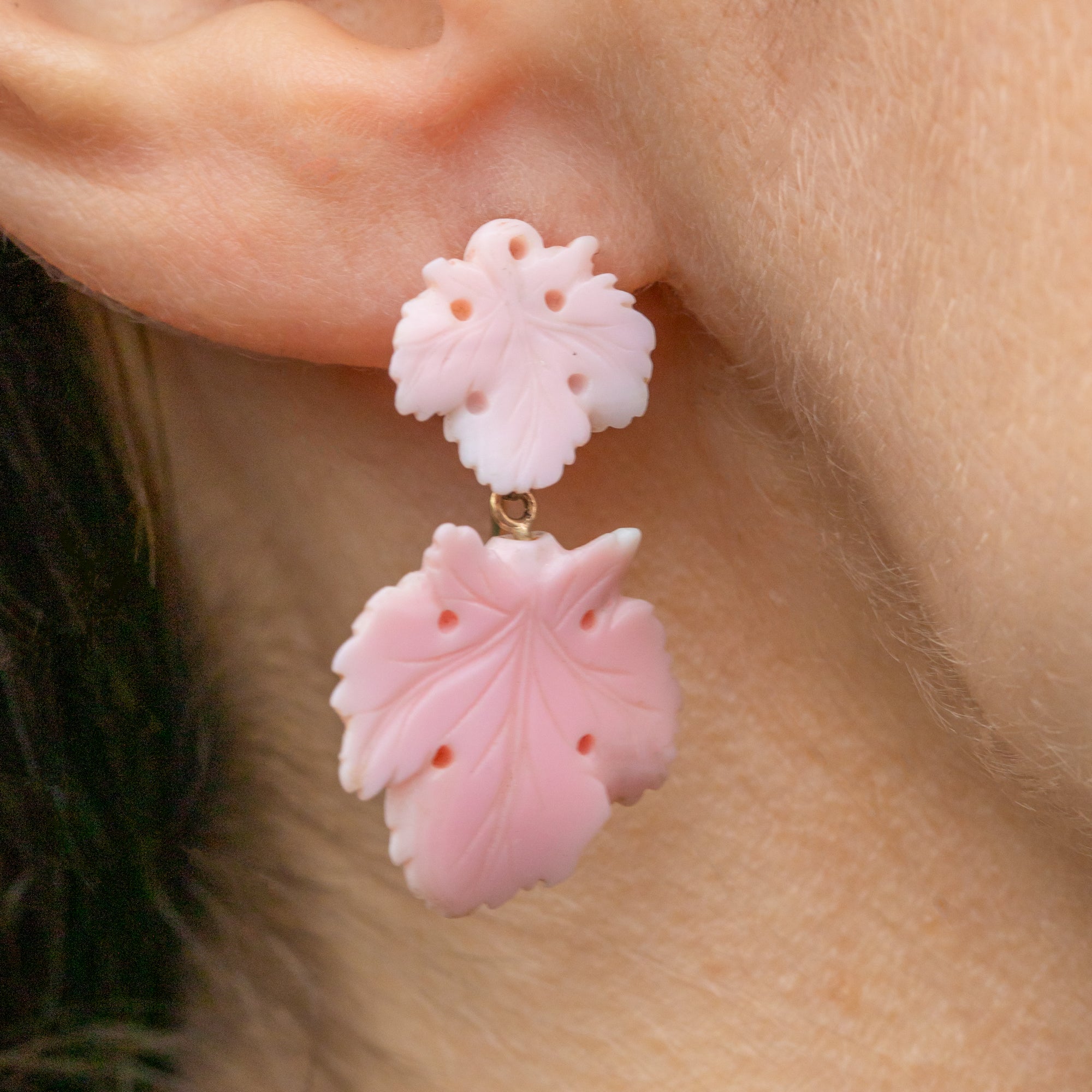 VERY GOOD. These Victorian 9ct Gold angel skin Coral leaf drop earrings are in very good condition. The angel skin Coral has a lovely rose hue and the details have remained defined. There are some signs of wear and discolouration on the back of the Coral, however this is not visible while the earrings are worn. With securely attached hooks, you can wear them with the utmost confidence!
