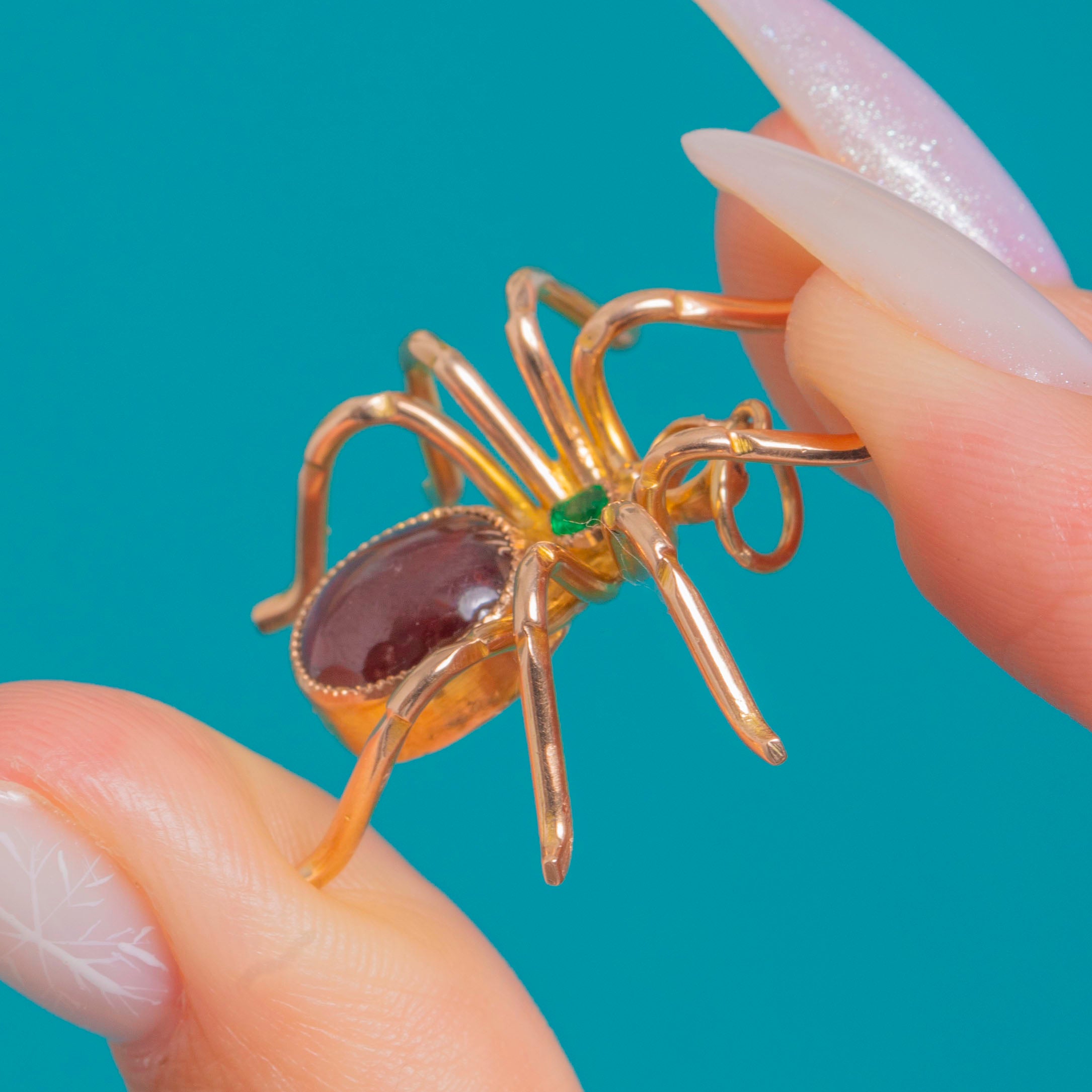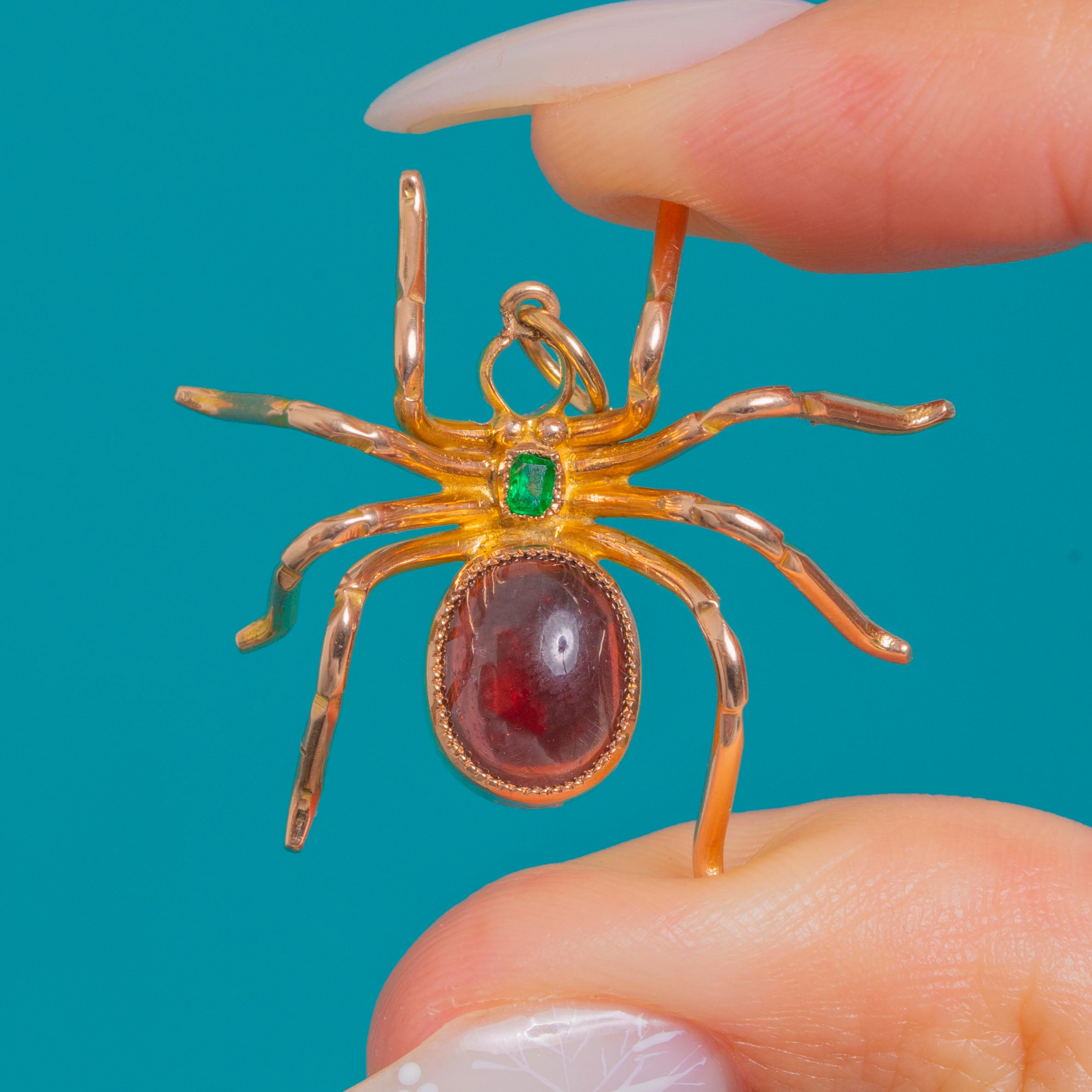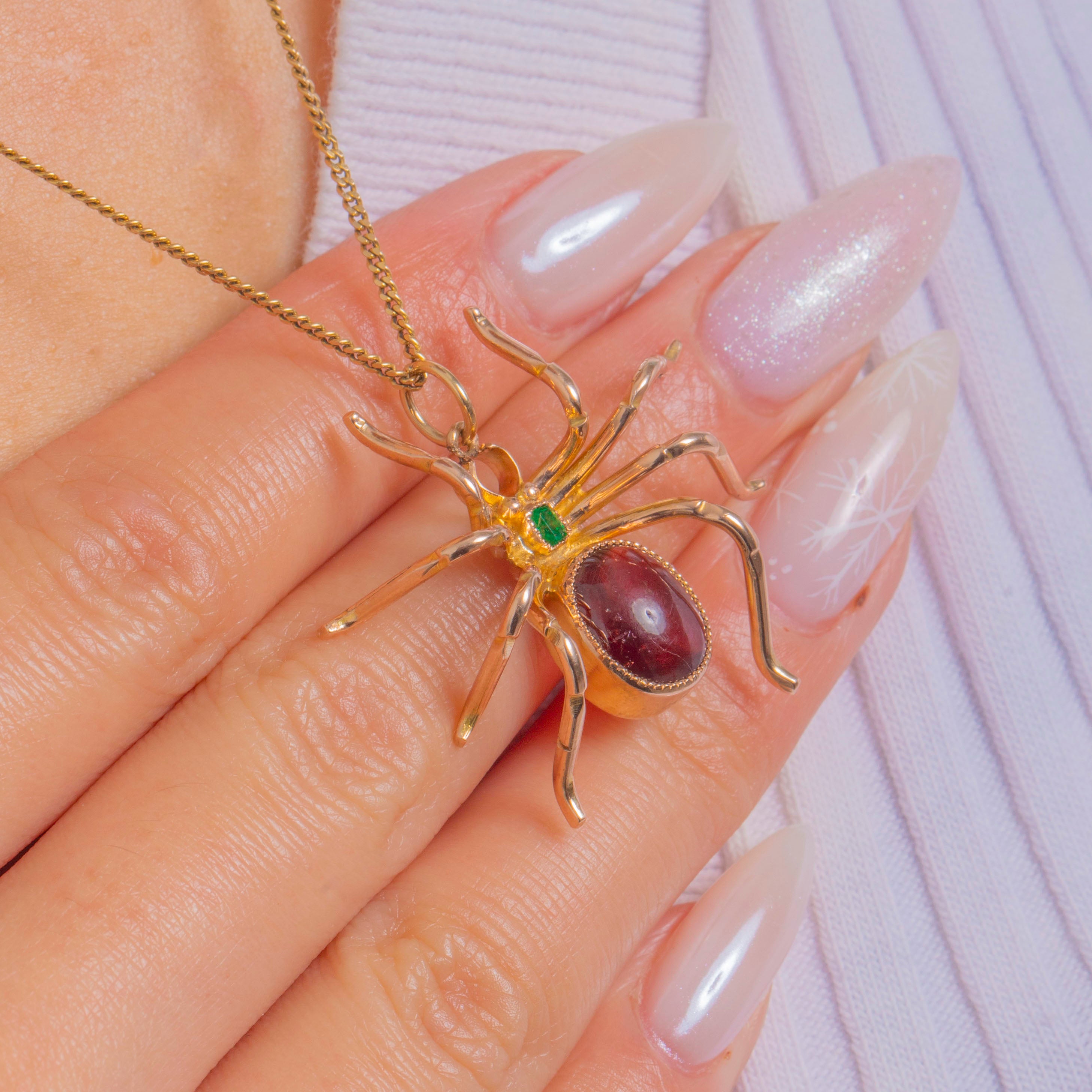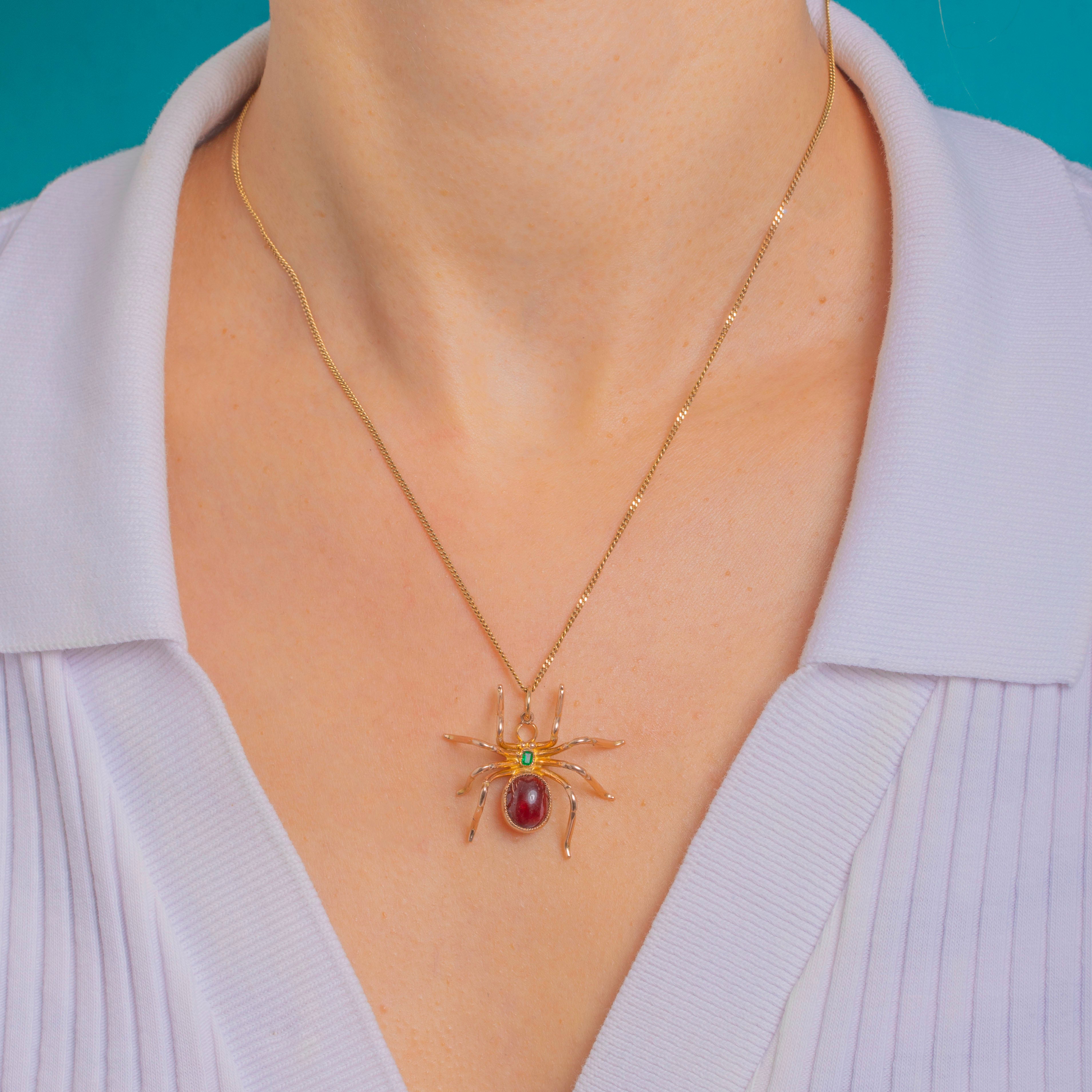 A charismatic Victorian spider pendant, crafted in warm 9ct Gold with a luscious deep-red Garnet cabochon forming the abdomen and a bright step-cut Emerald at the head. The gems sit in neat, textured bezels, while eight slender, curving legs lend a wonderfully naturalistic silhouette with a dash of gothic whimsy.