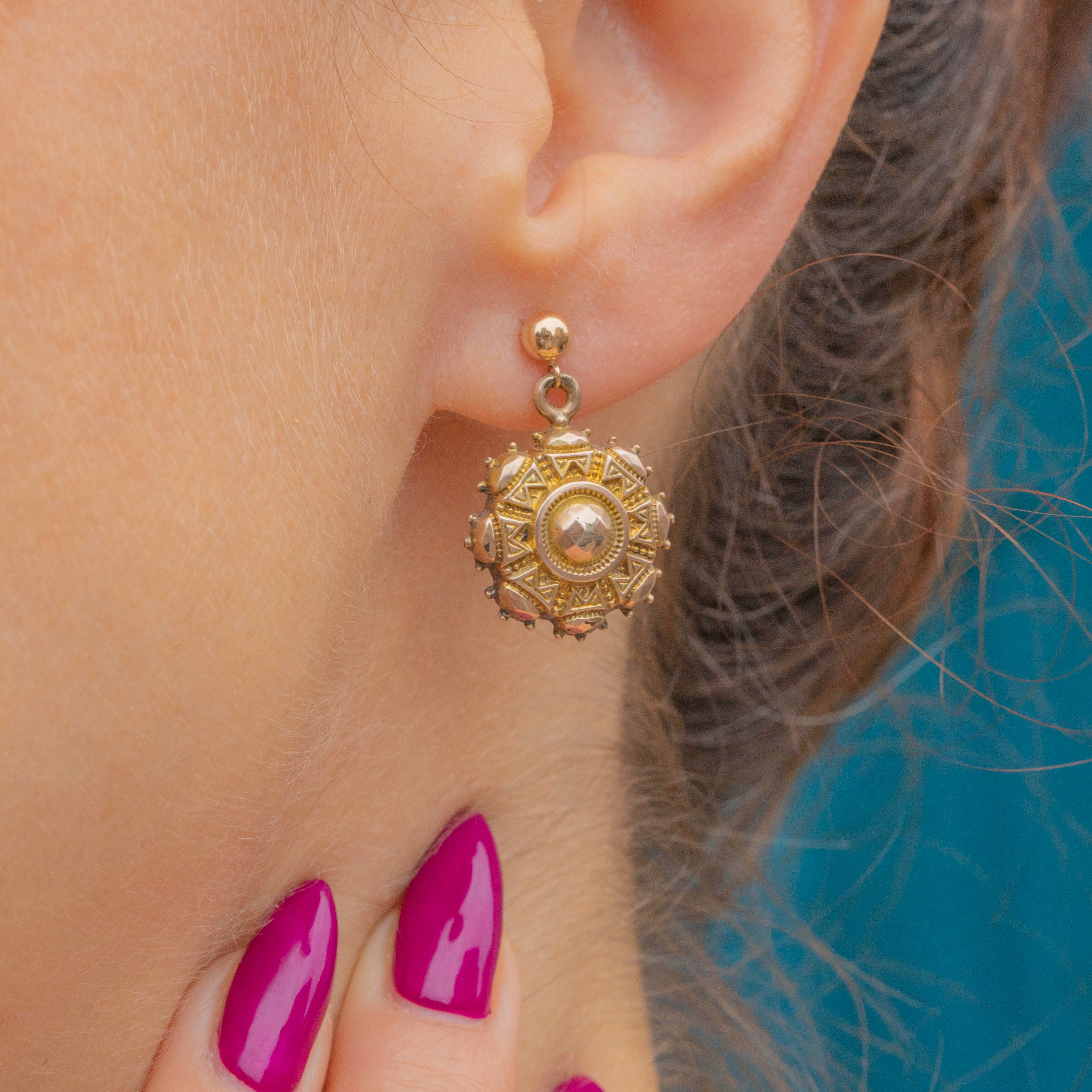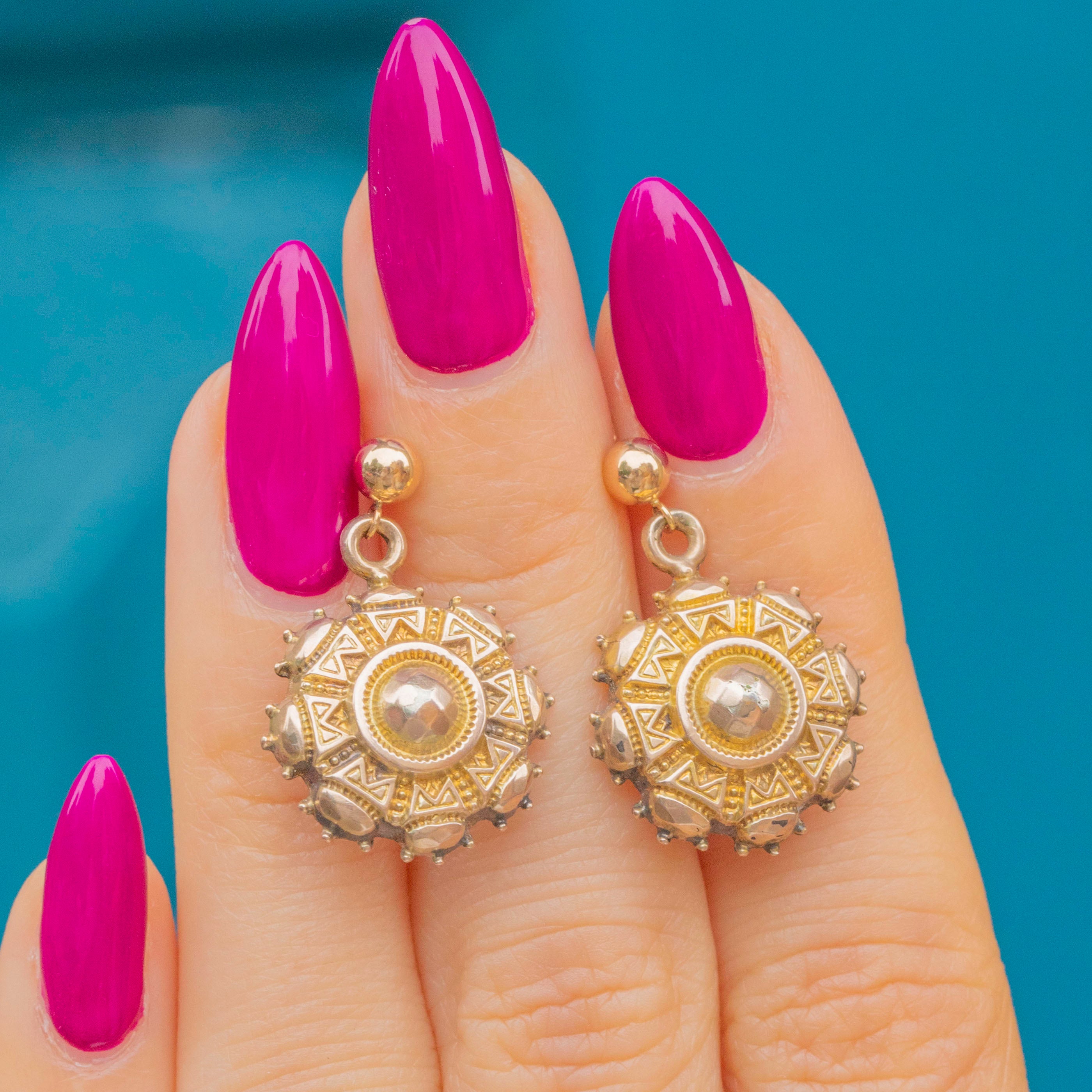 These antique Etruscan earrings feature round drops composed of brightly textured 9ct Gold attached to beaming 9ct Gold studs, they are a glossy treat to grace your lobes with!