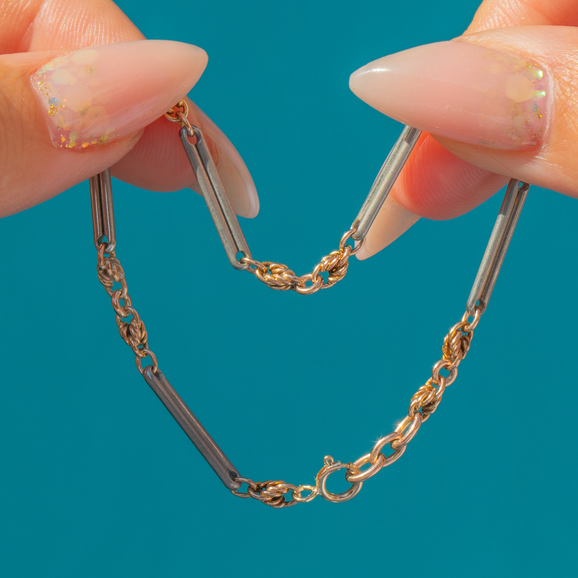 This antique bracelet is a charming blend of metals and symbolism, featuring alternating 9ct Gold lover’s knot links and Sterling Silver trombone links. The warm glow of Gold against the cooler tones of Silver creates a subtle yet eye-catching two-tone effect.