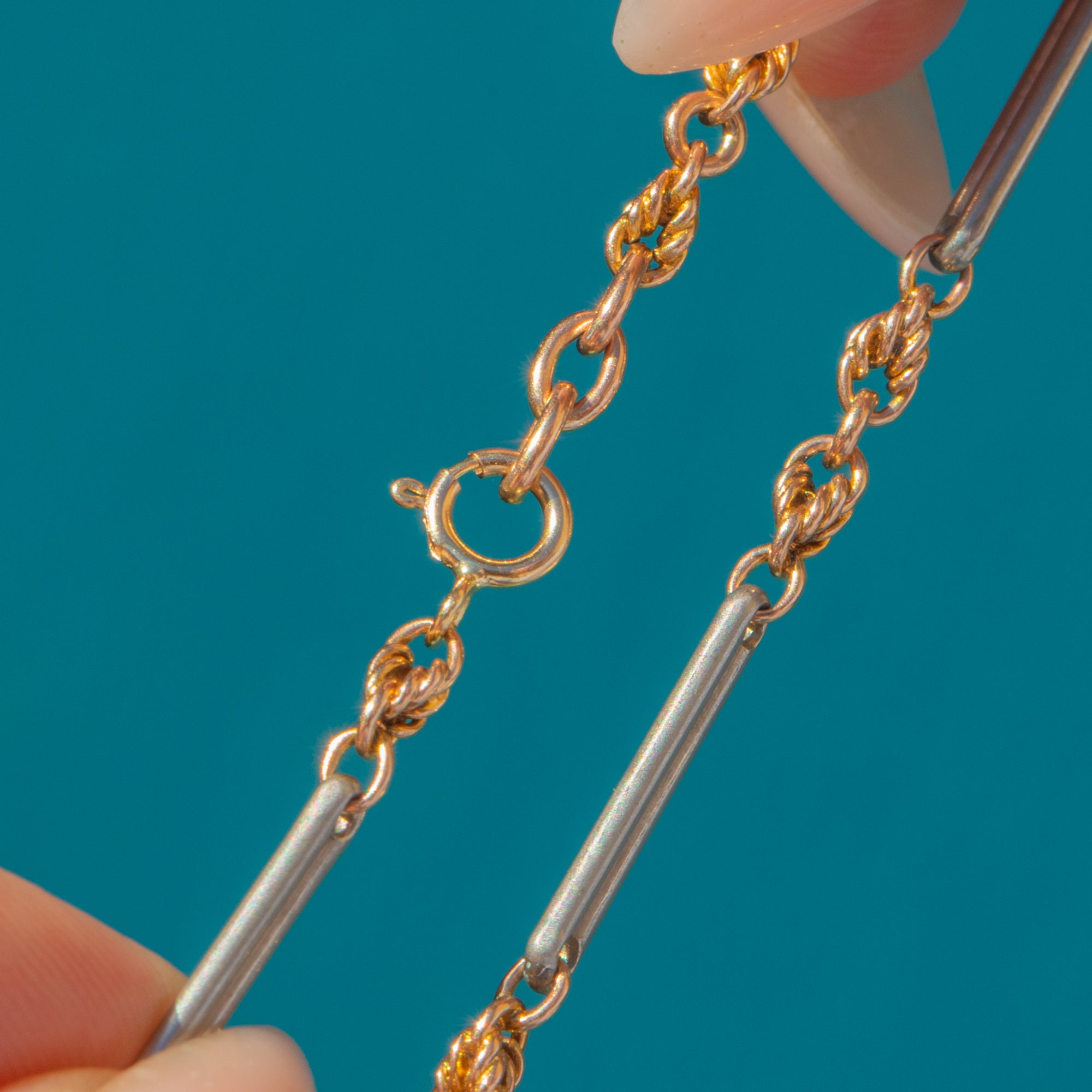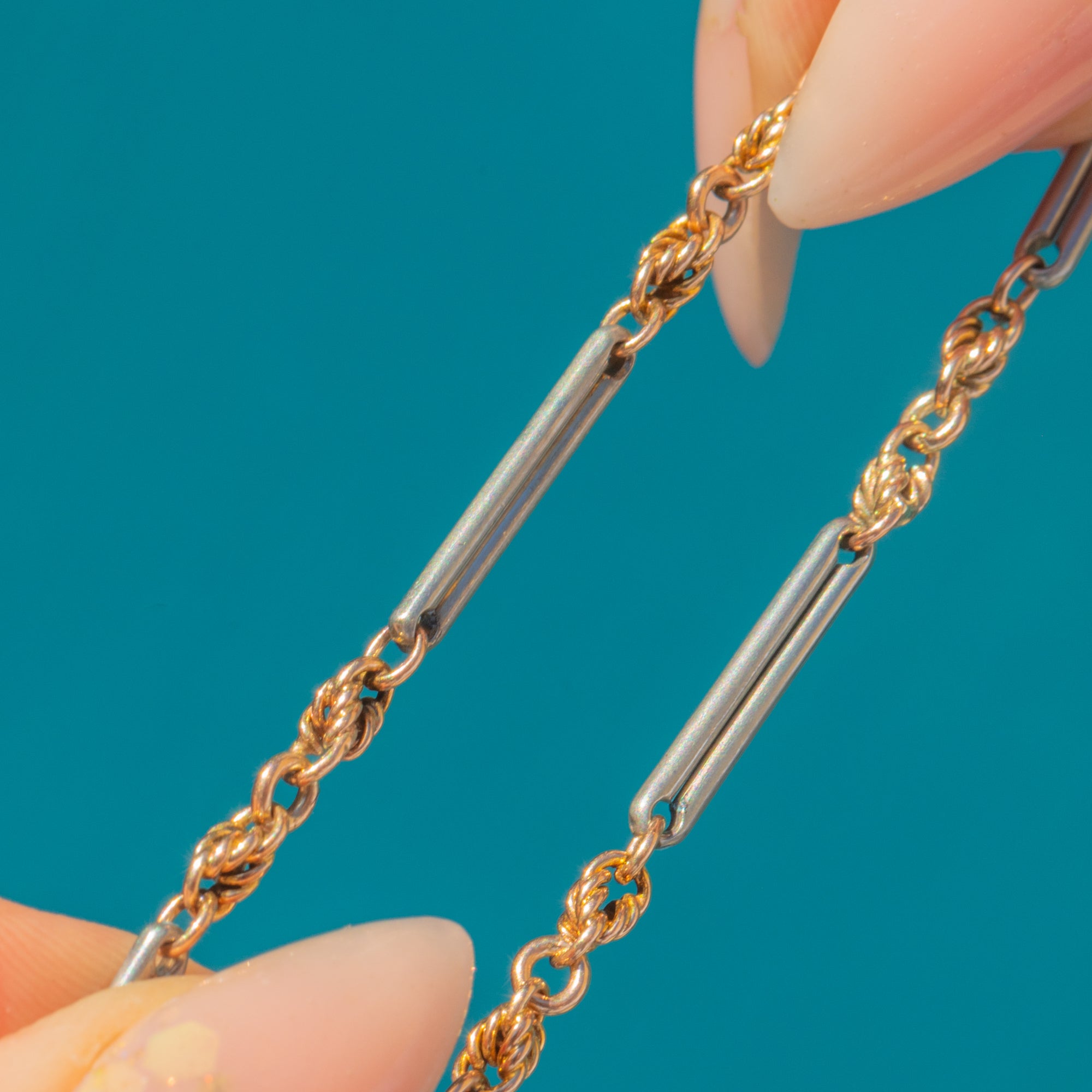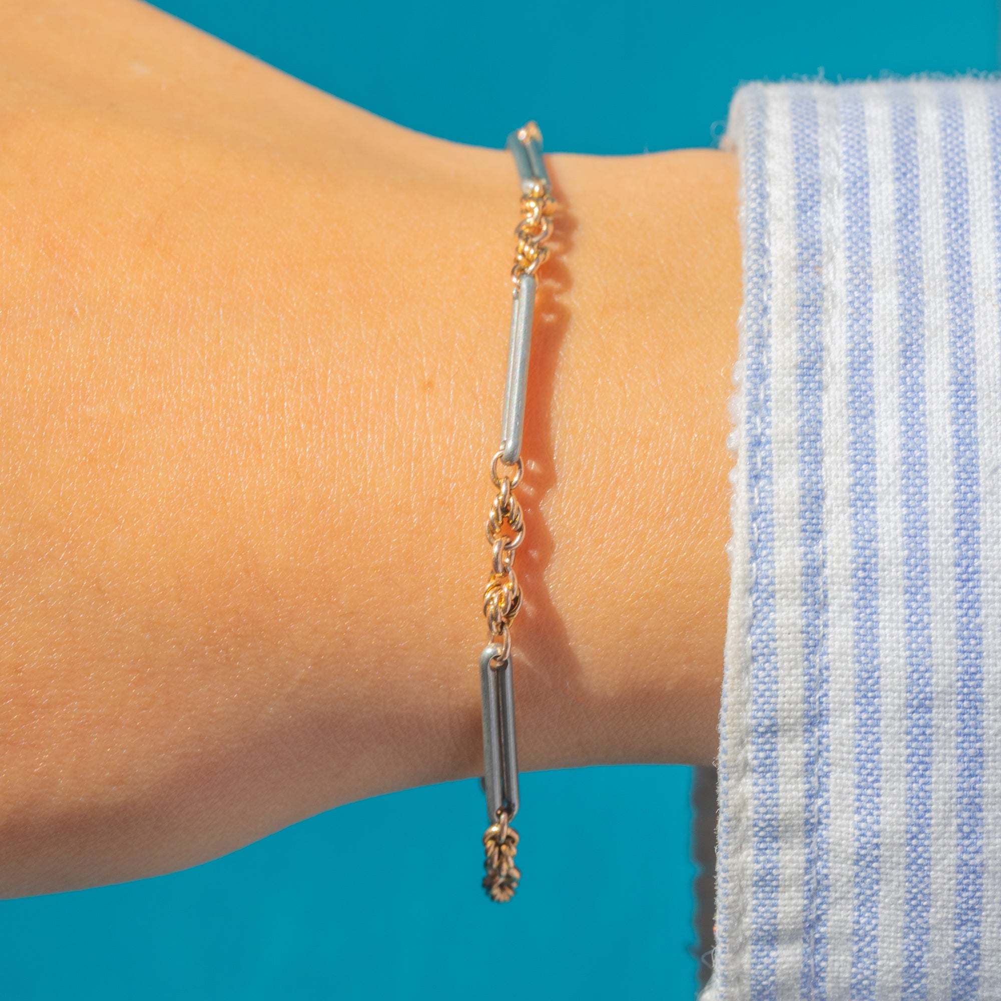 VERY GOOD: The bracelet is in very good antique condition, with all links secure and showing only light signs of age. The Gold links retain a lovely warm colour, while the Silver links display an attractive natural patina. Clasp will be replaced in workshop for secure wear.