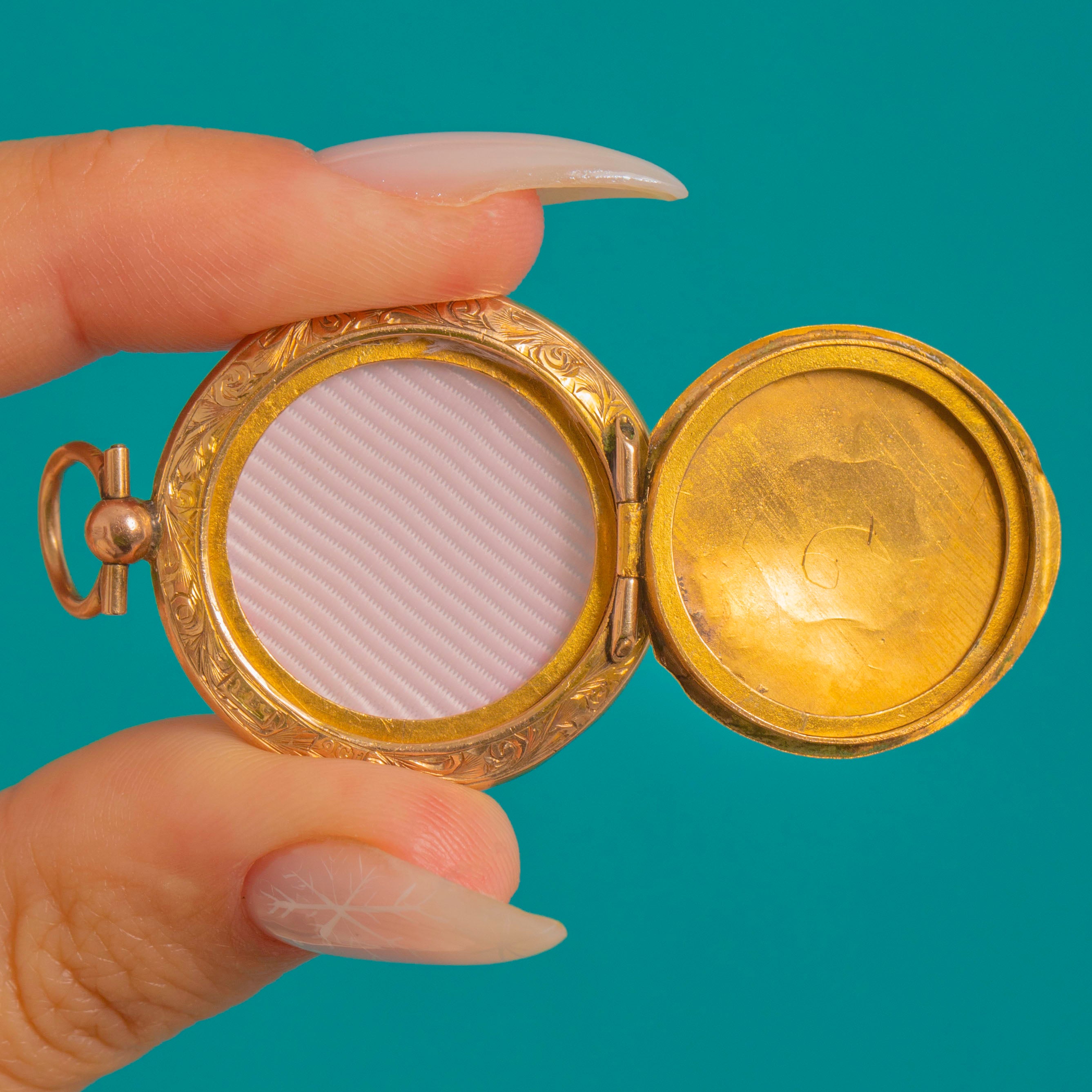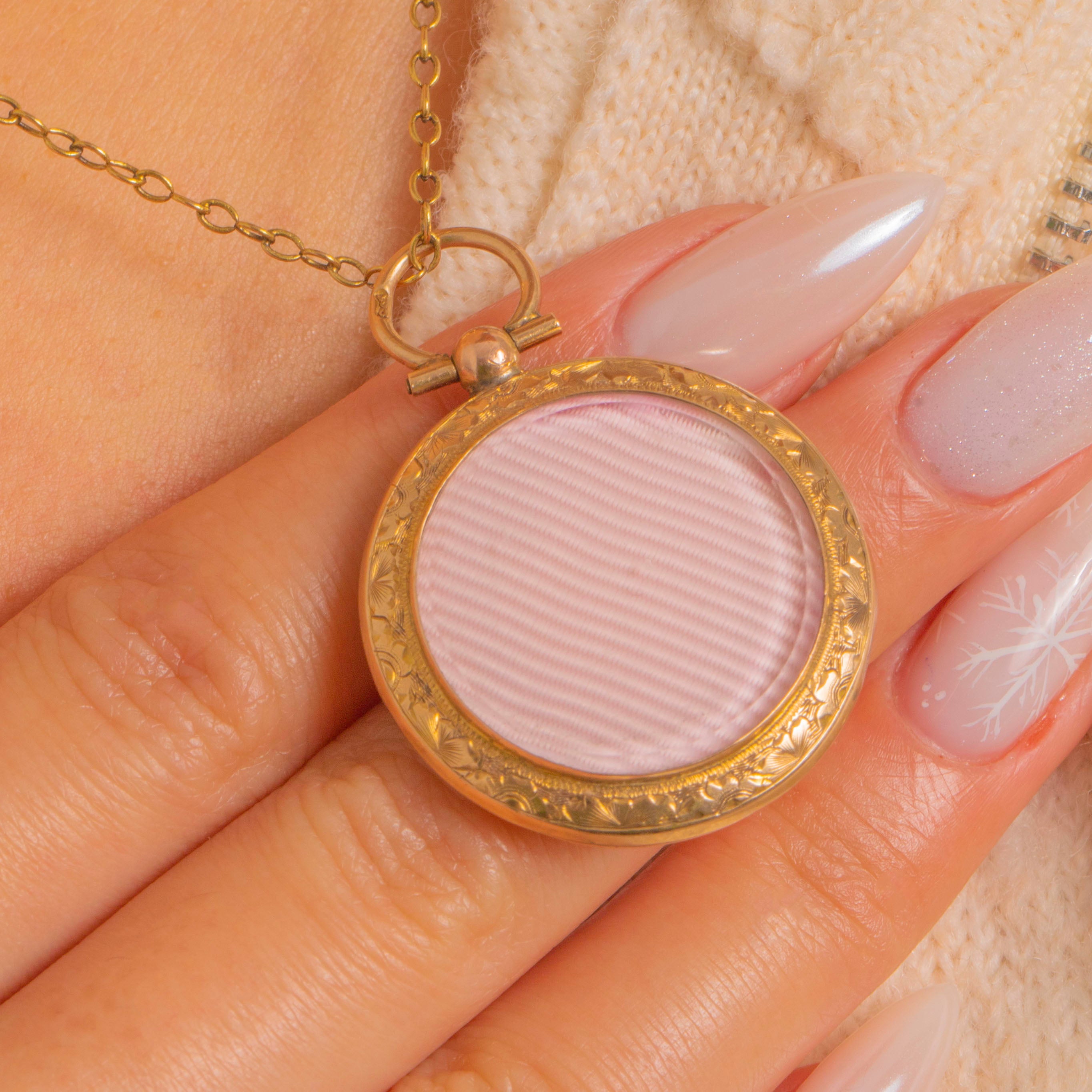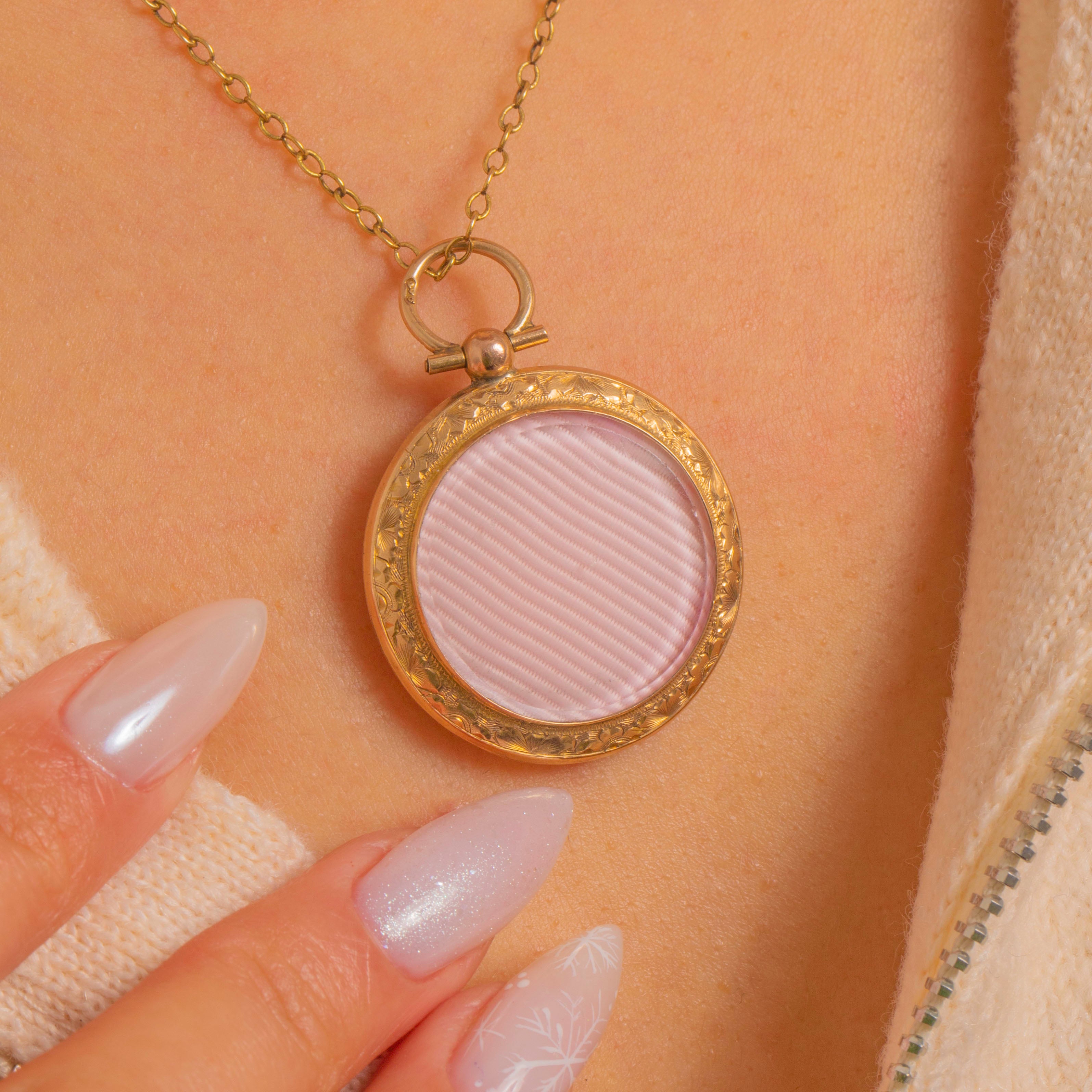 Inside, twin photo compartments with retaining frames are ready to cradle cherished portraits. The locket opens on a sturdy knuckle hinge and closes with a satisfying snap, while the generous round bail lends an elegant, timeless silhouette. A gentle patina completes its refined, romantic character.