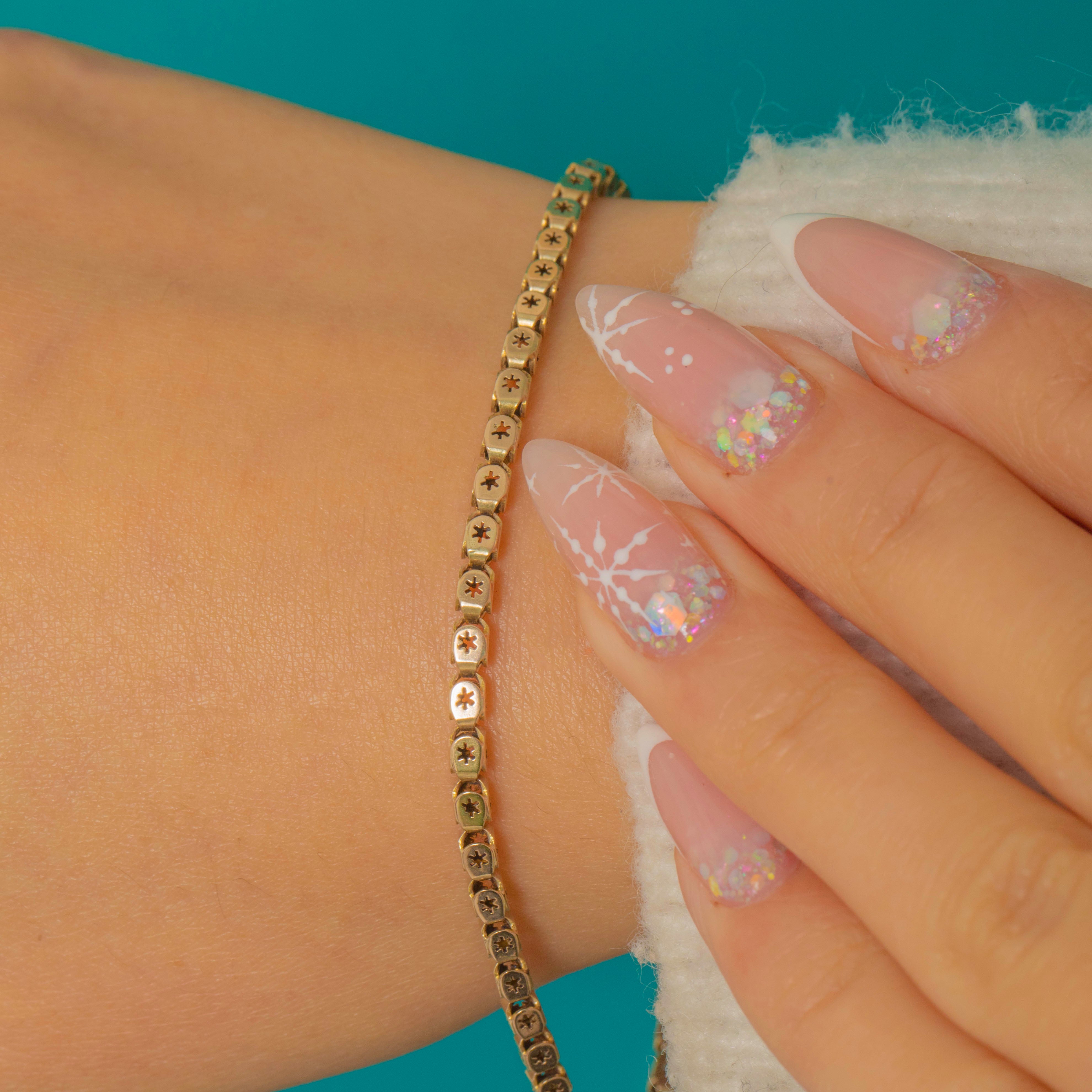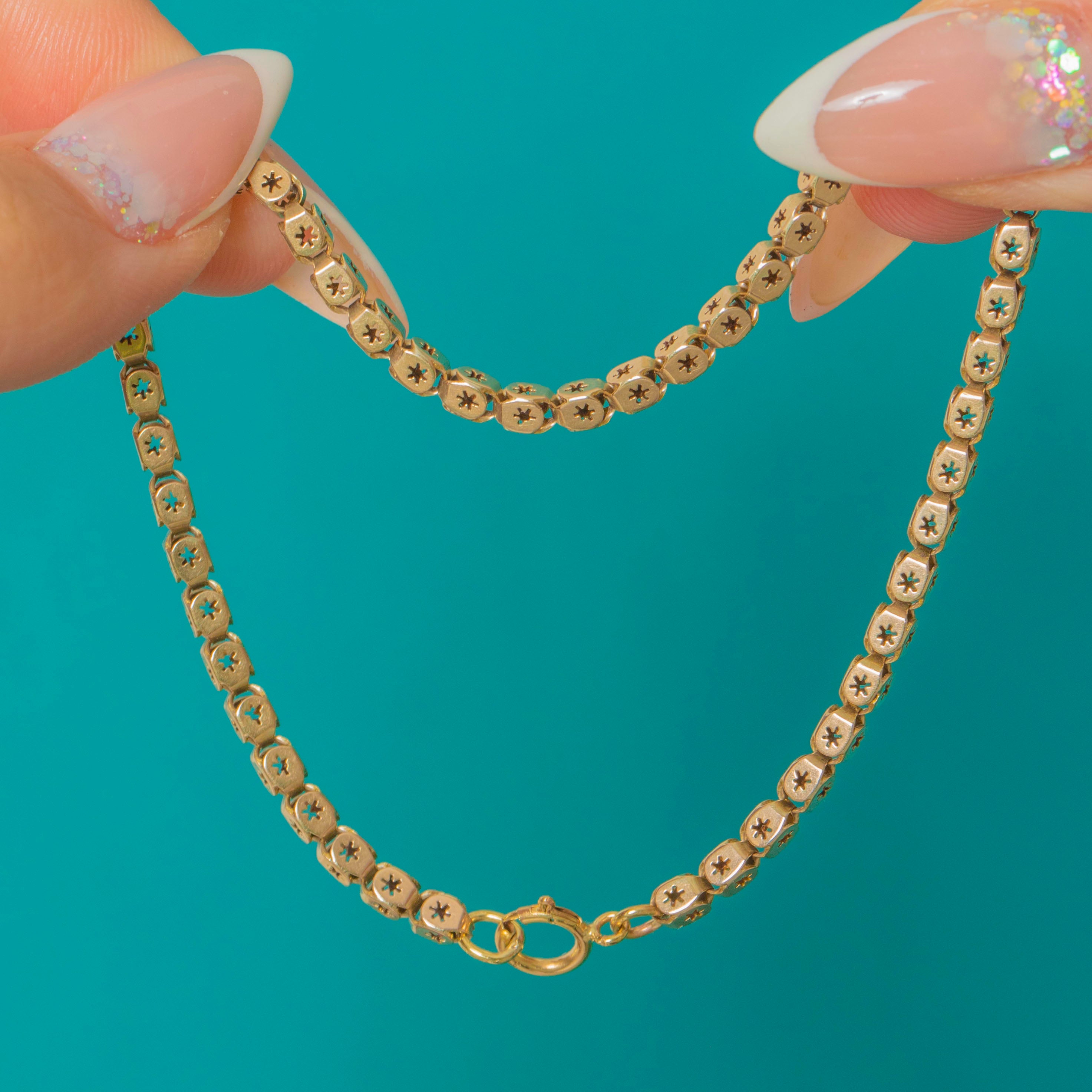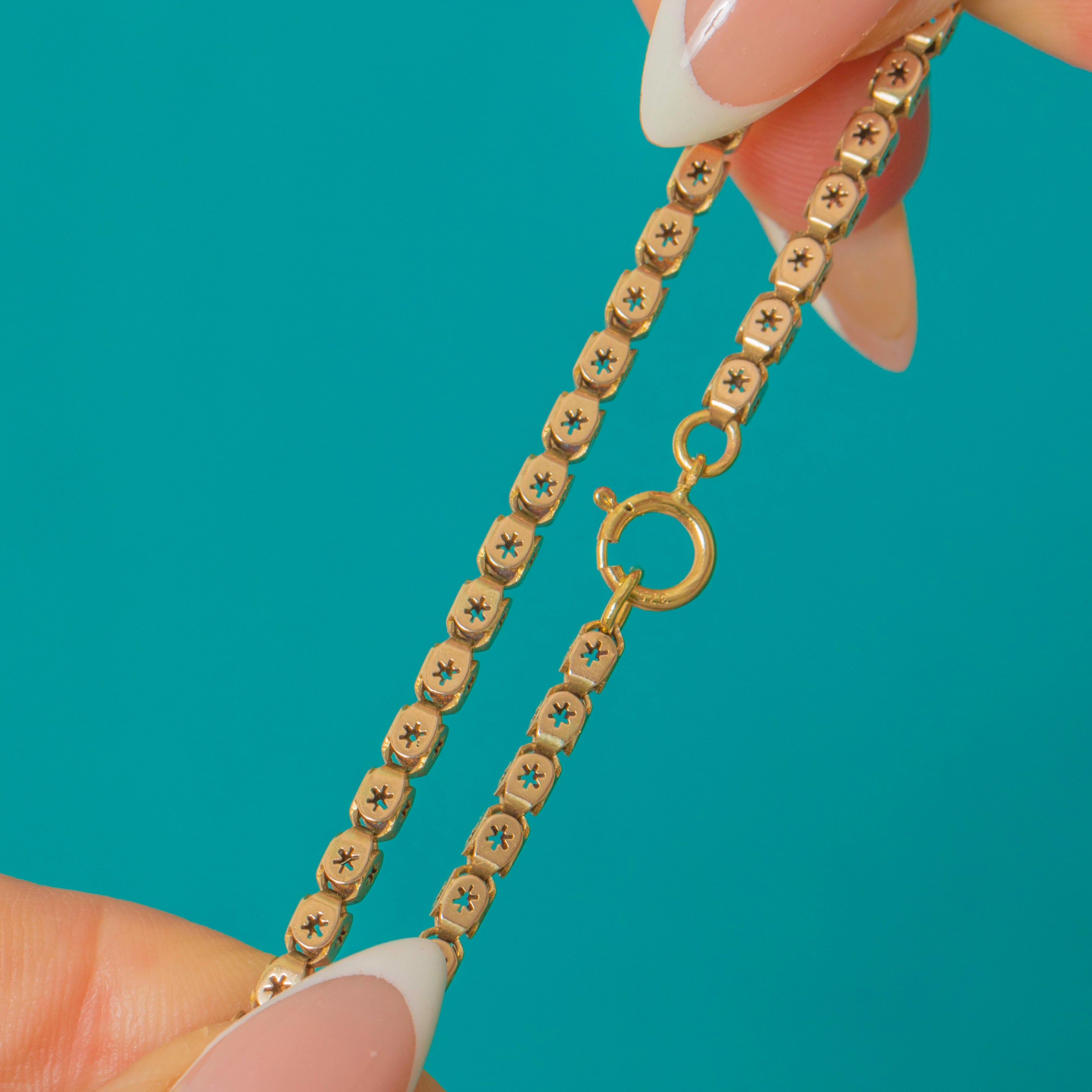 The classic book-link style gives beautiful fluidity and a refined, geometric rhythm, while the soft patina and bright surfaces highlight the craftsmanship of the starburst motif. A timeless layer with antique poise, effortless alone or stacked.