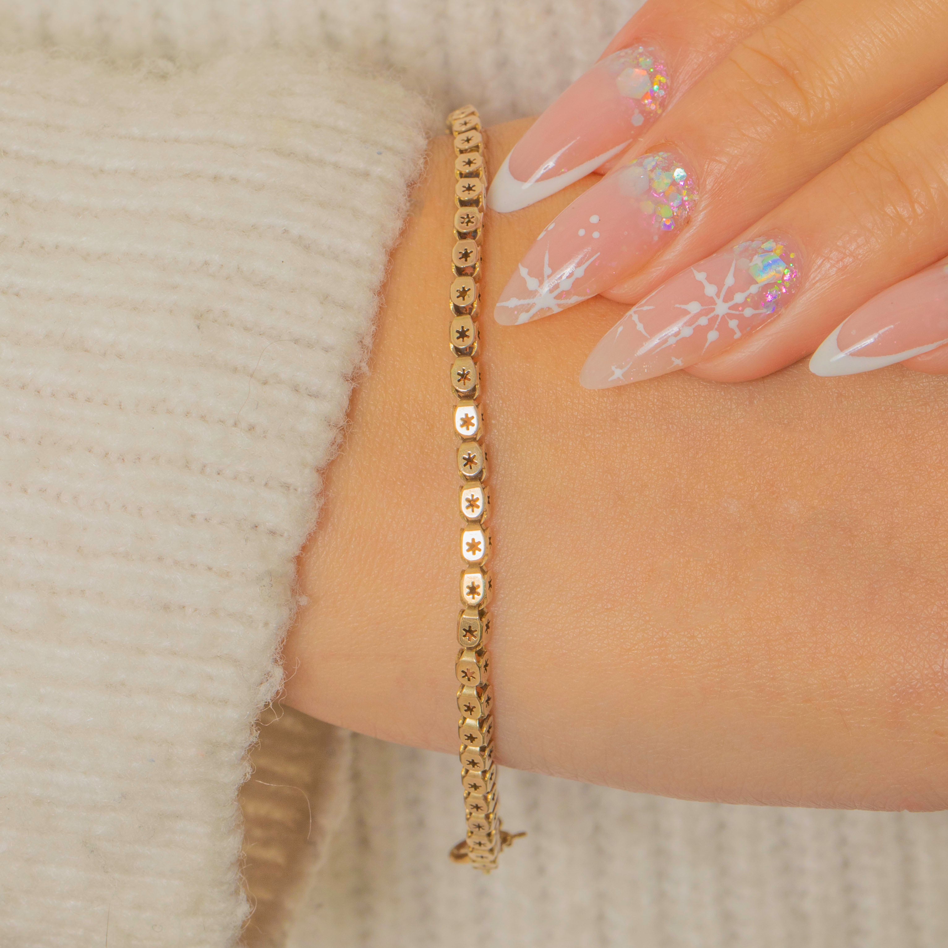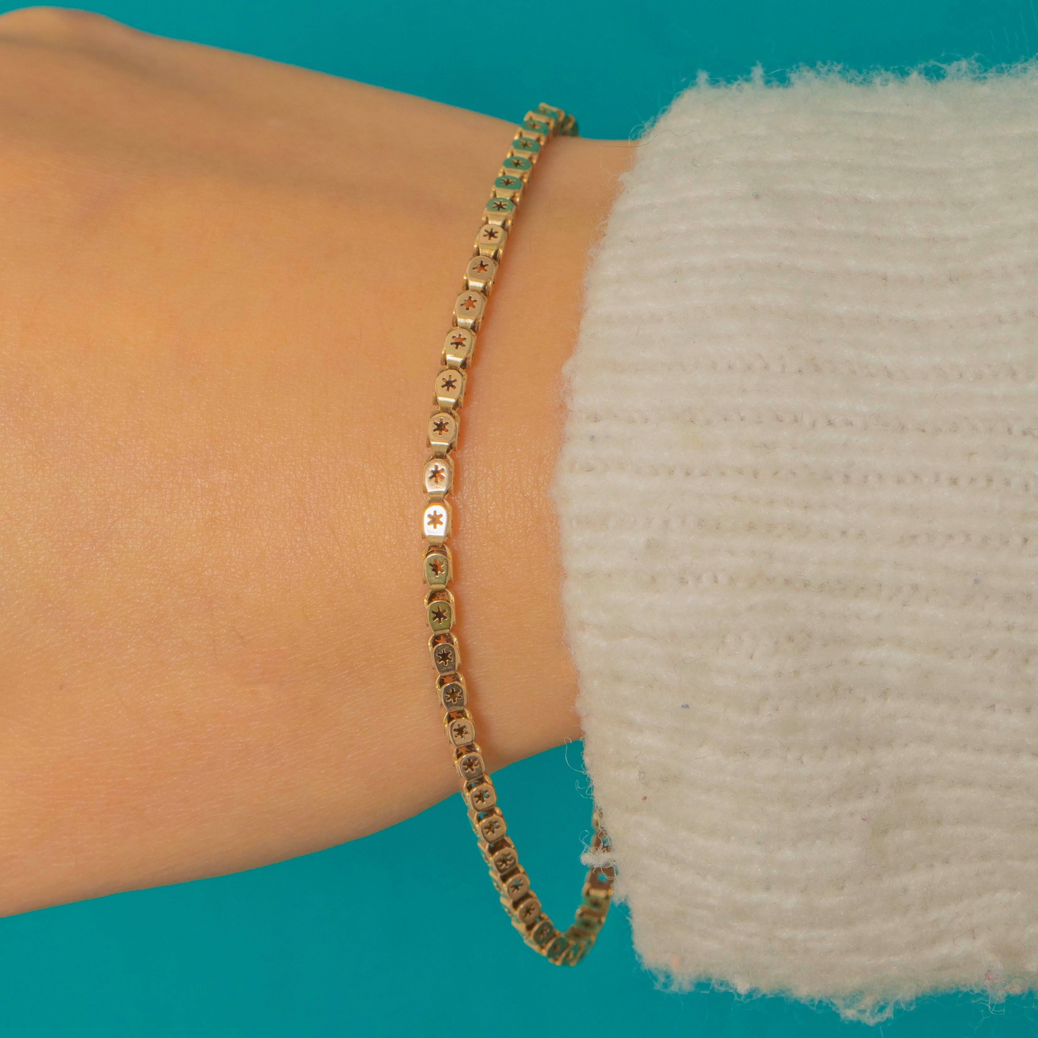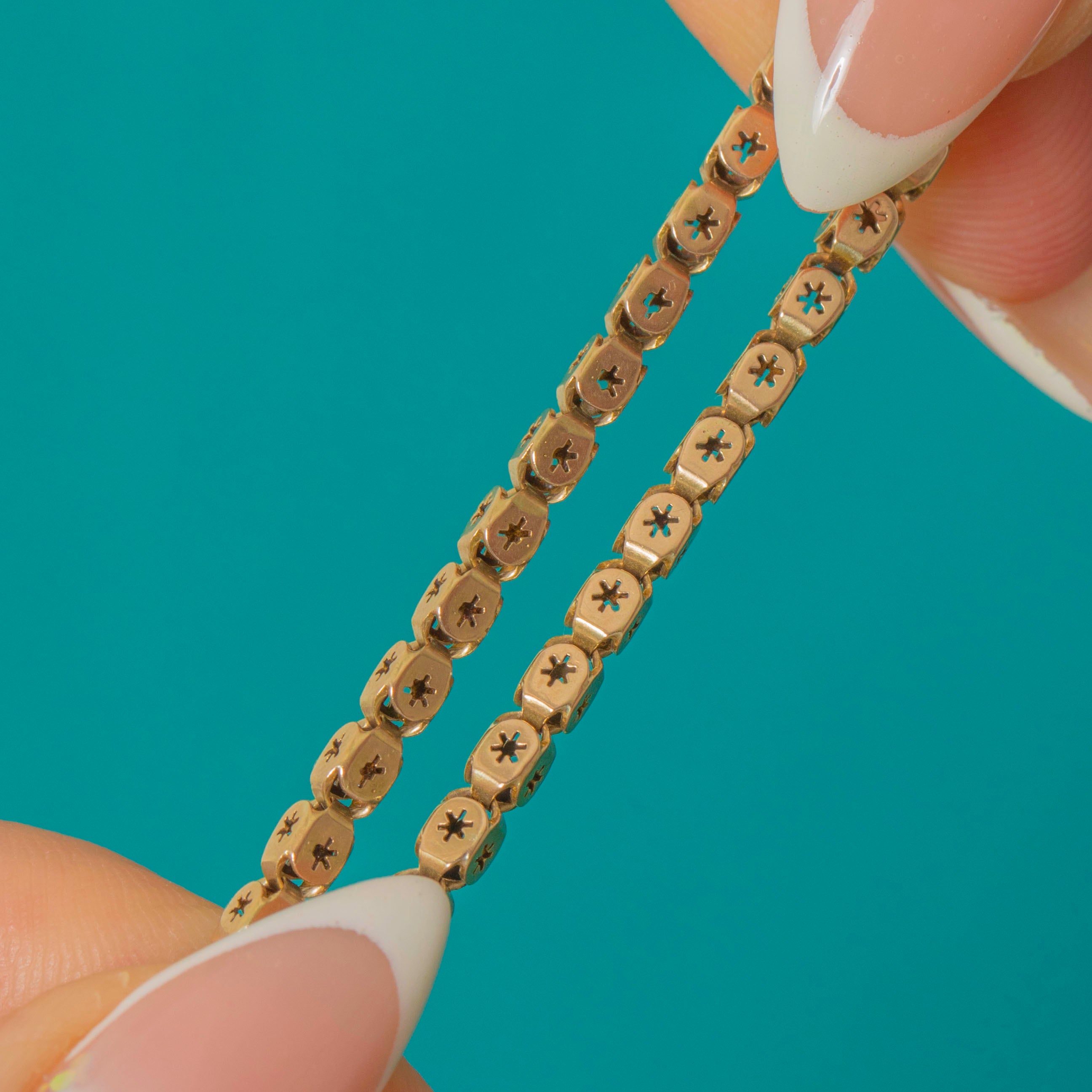 Delicate and deliciously detailed, this Victorian 9ct Gold bracelet is fashioned from a fine run of articulated plaques, each crisply pierced with an eight-point star. Together they create a slender, shimmering ribbon that sits low and sleek against the wrist.
