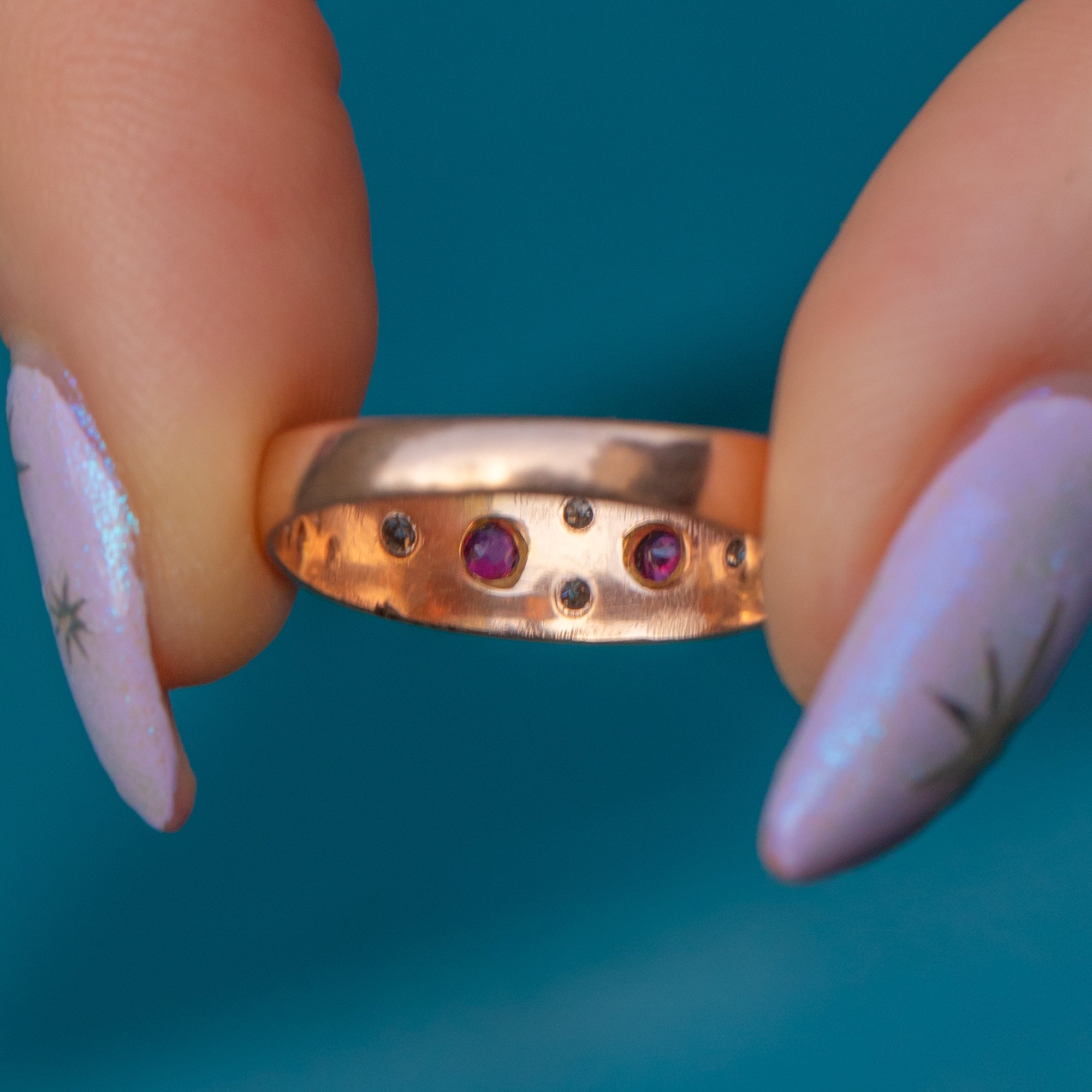 "Gypsy" rings were a favourite during the late Victorian era, beloved for their timeless elegance which remains today. Her 9ct Gold band is buttery and bright with elegant engraved shoulders framing her gemstones!