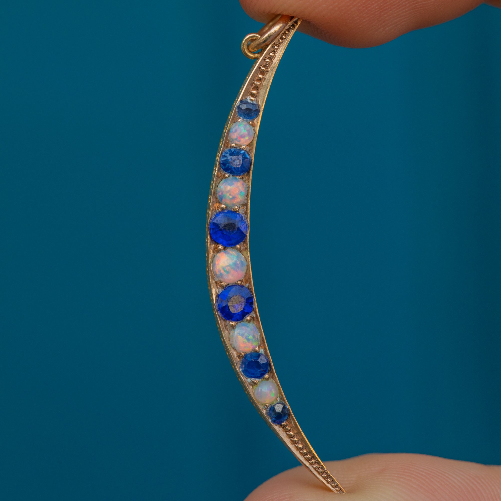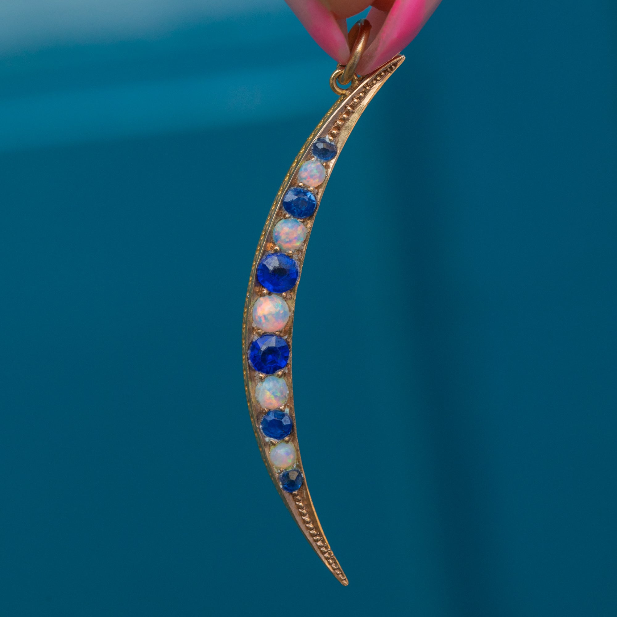 This eye-catching Victorian 9ct Gold Sapphire Opal crescent moon pendant will instantly add celestial allure to your outfit! Crafted from buttery 9ct Gold and inlaid with alternating Sapphires and Opals, the decadence of this antique pendant exudes from its every crevice.