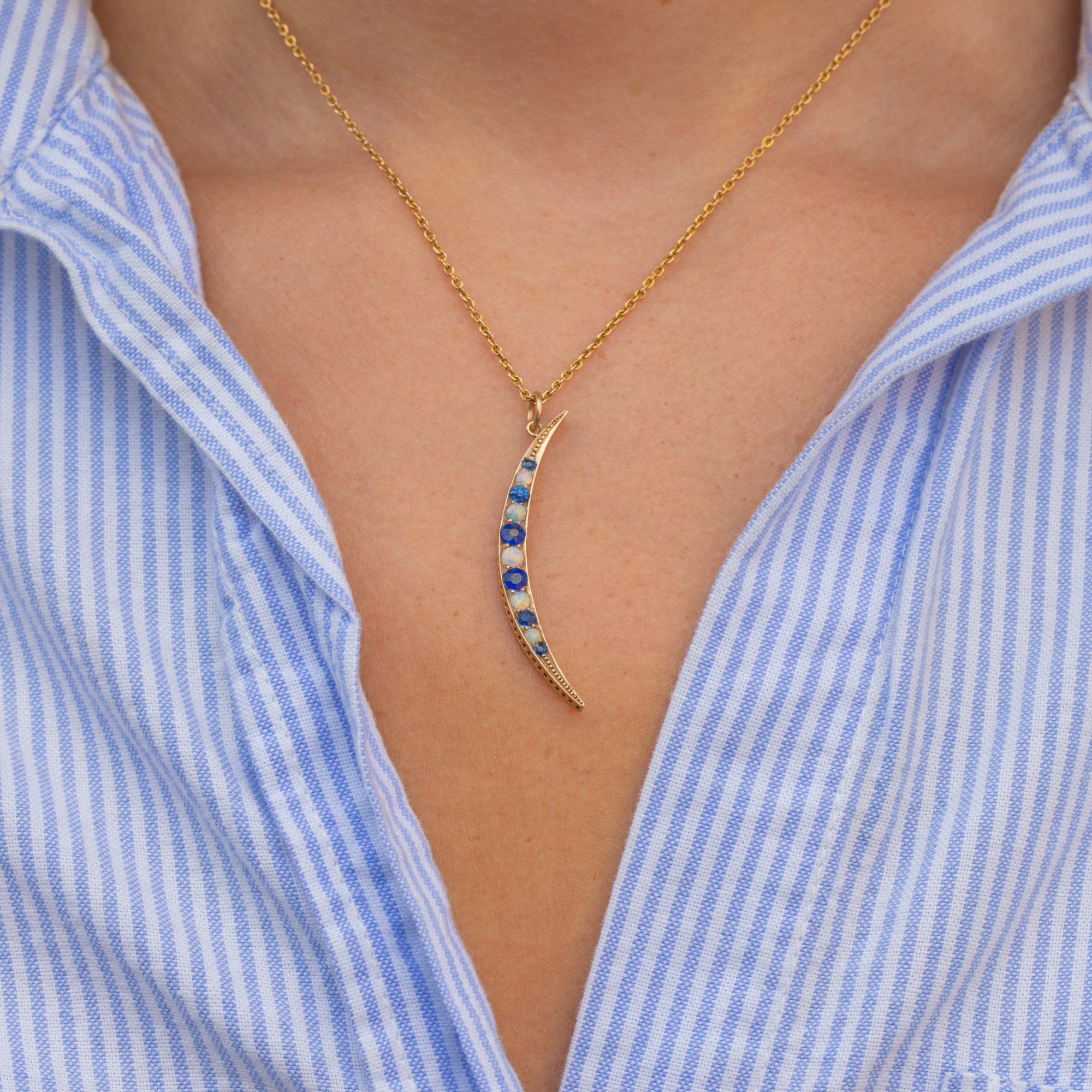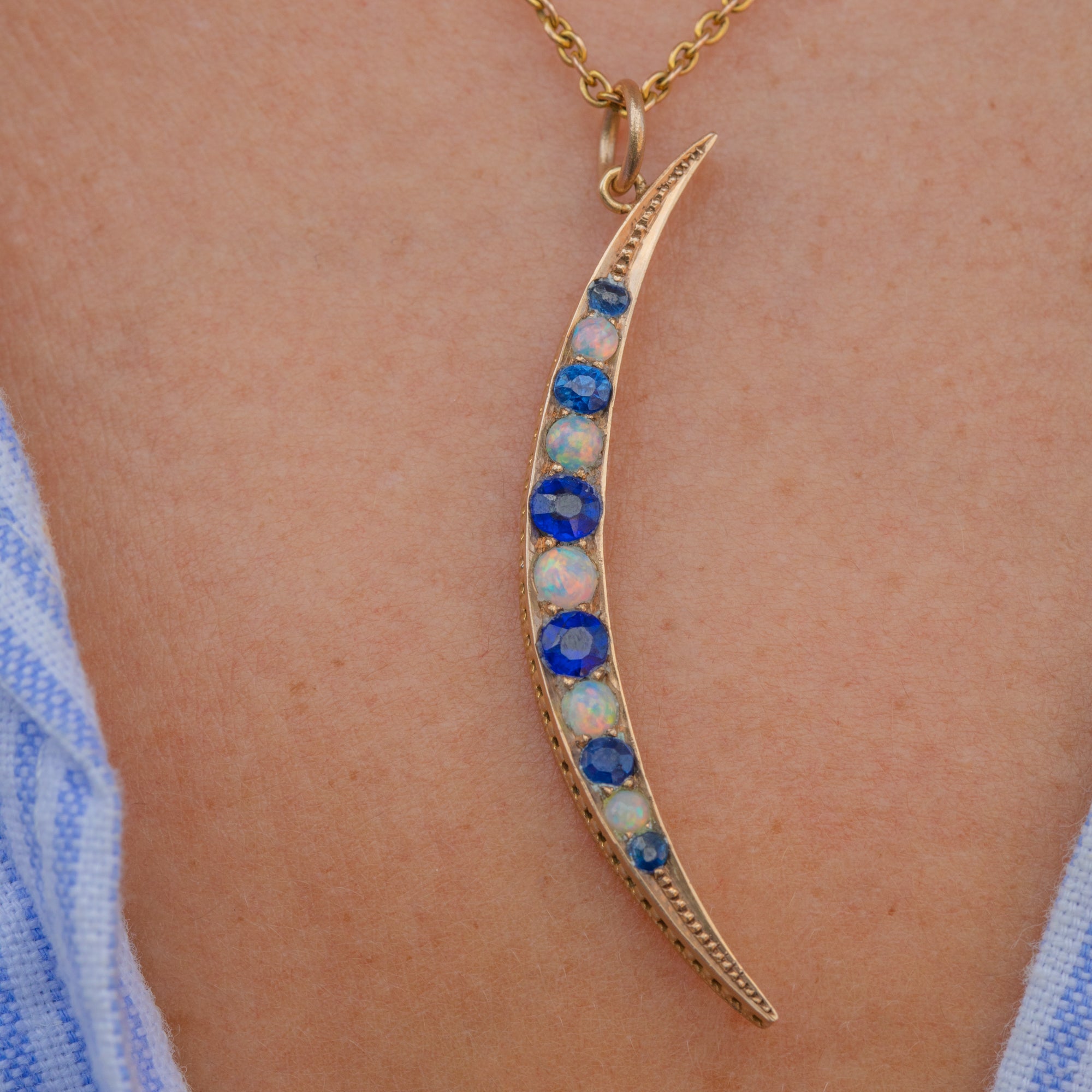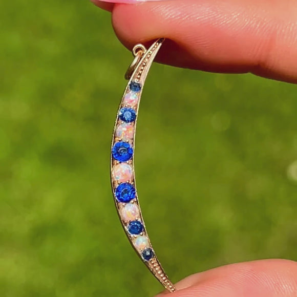 Victorian 9ct Gold Sapphire Opal Crescent Moon Pendant