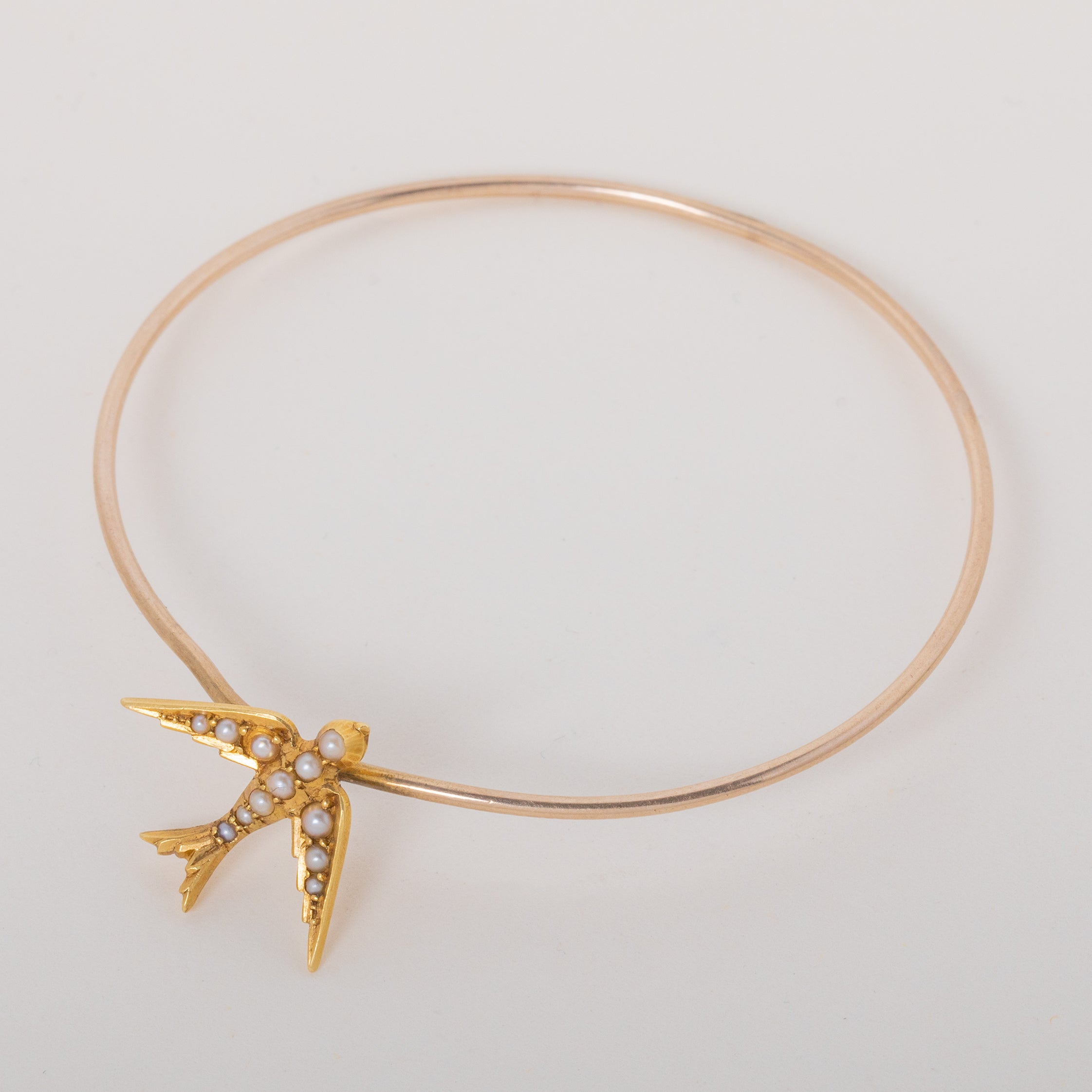 EXCELLENT. This Victorian 9ct Gold swallow Pearl bangle is in excellent condition throughout! The Gold is bright and buttery and the Pearls are all securely set. The swallow has retained its form well and is firmly soldered onto the band allowing you to wear this enchanting antique bangle confidently!