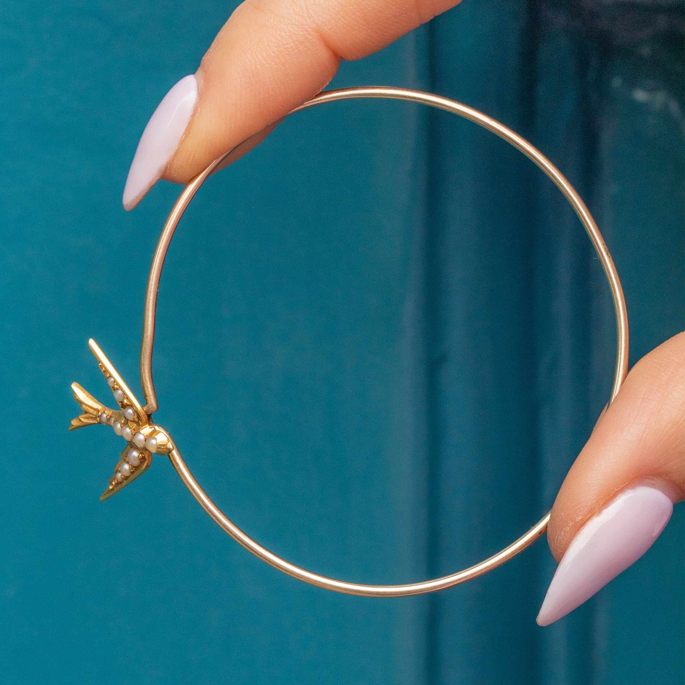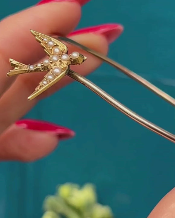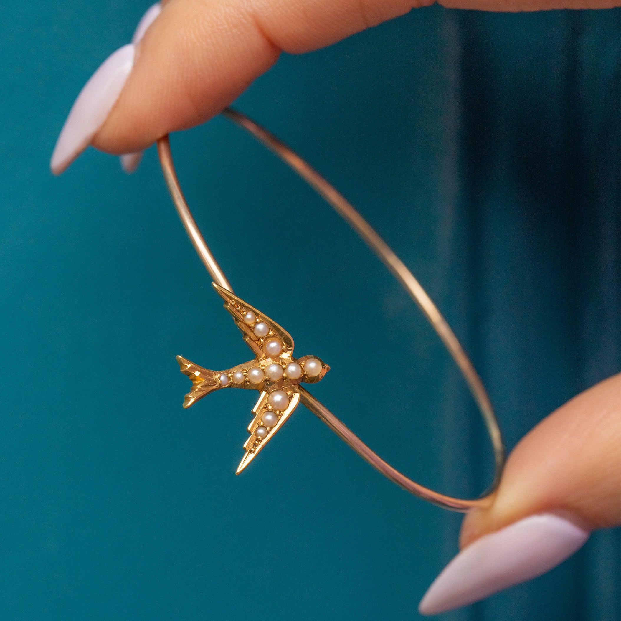 Symbolising faithfulness, this Victorian 9ct Gold swallow Pearl bangle is steeped in romantic sentiment and would make a wonderfully thoughtful gift for a loved one! Crafted from solid 9ct Gold and encrusted with shimmering seed Pearls, this antique bangle displays an intricate swallow-in-flight that appears to be perching upon your arm.