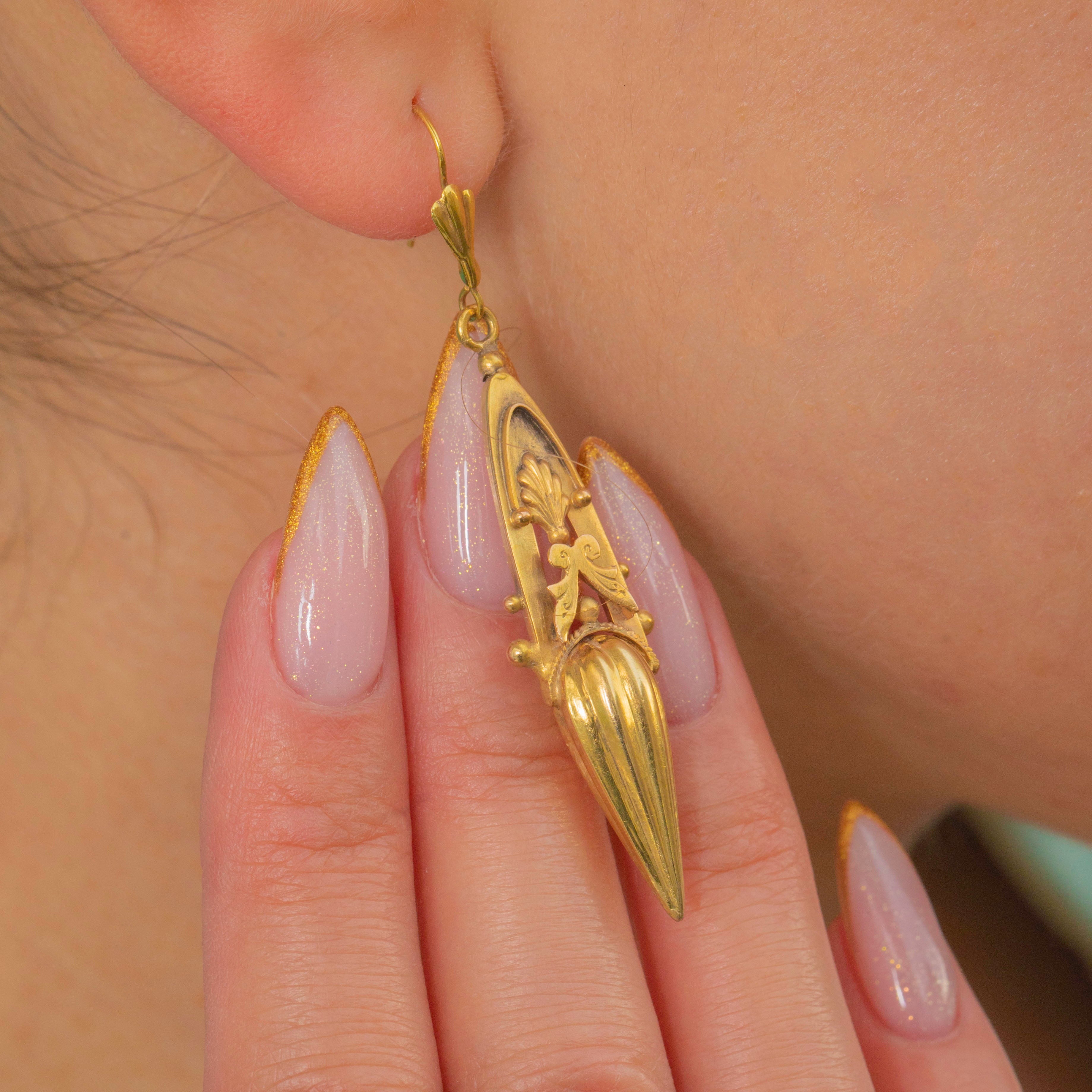 These striking Victorian torpedo earrings are a perfect example of the bold and sculptural style of the 19th century. Crafted entirely in rich 9ct Gold, their elongated drops feature classical motifs including shells, scrolls, and applied bead detailing, a true celebration of Victorian design.