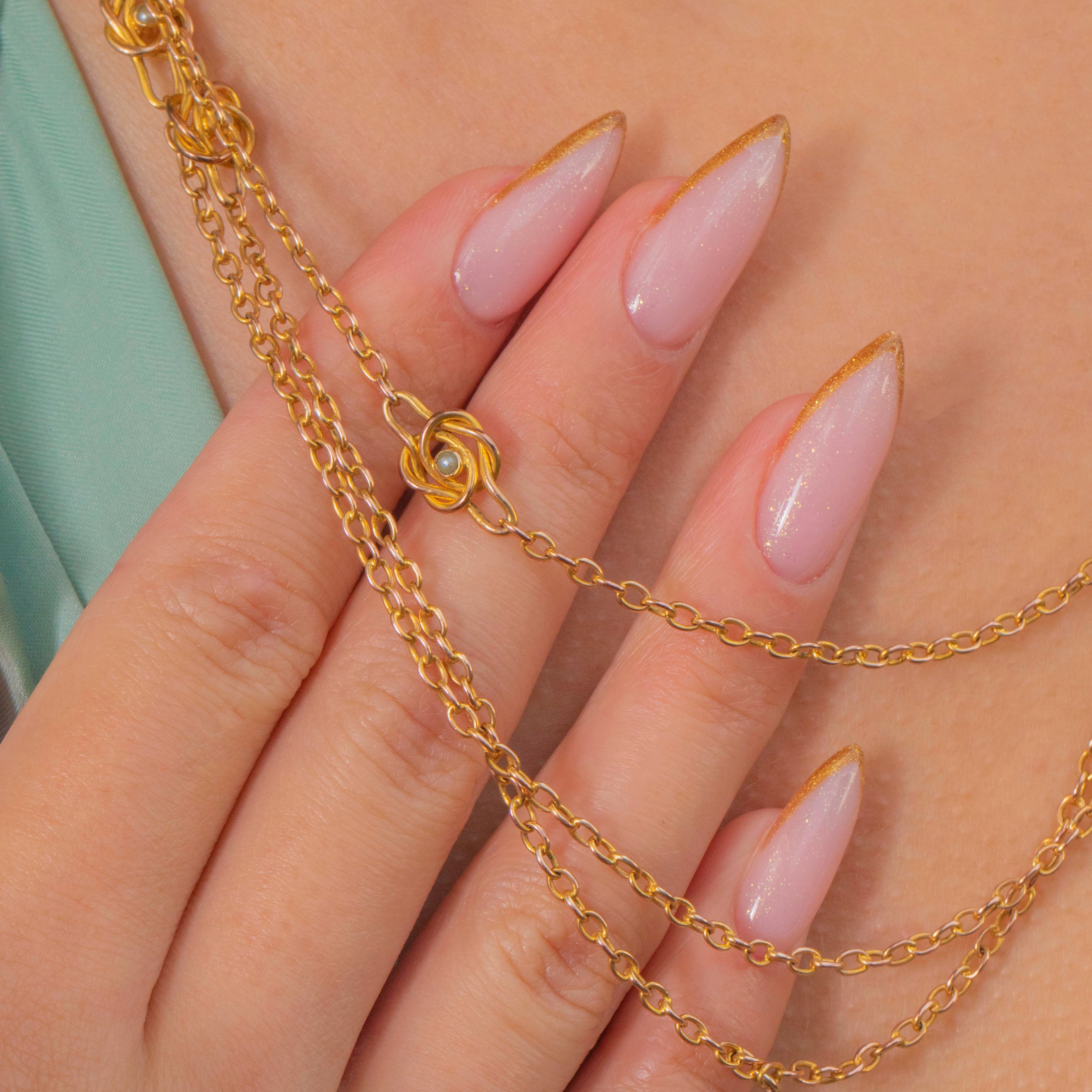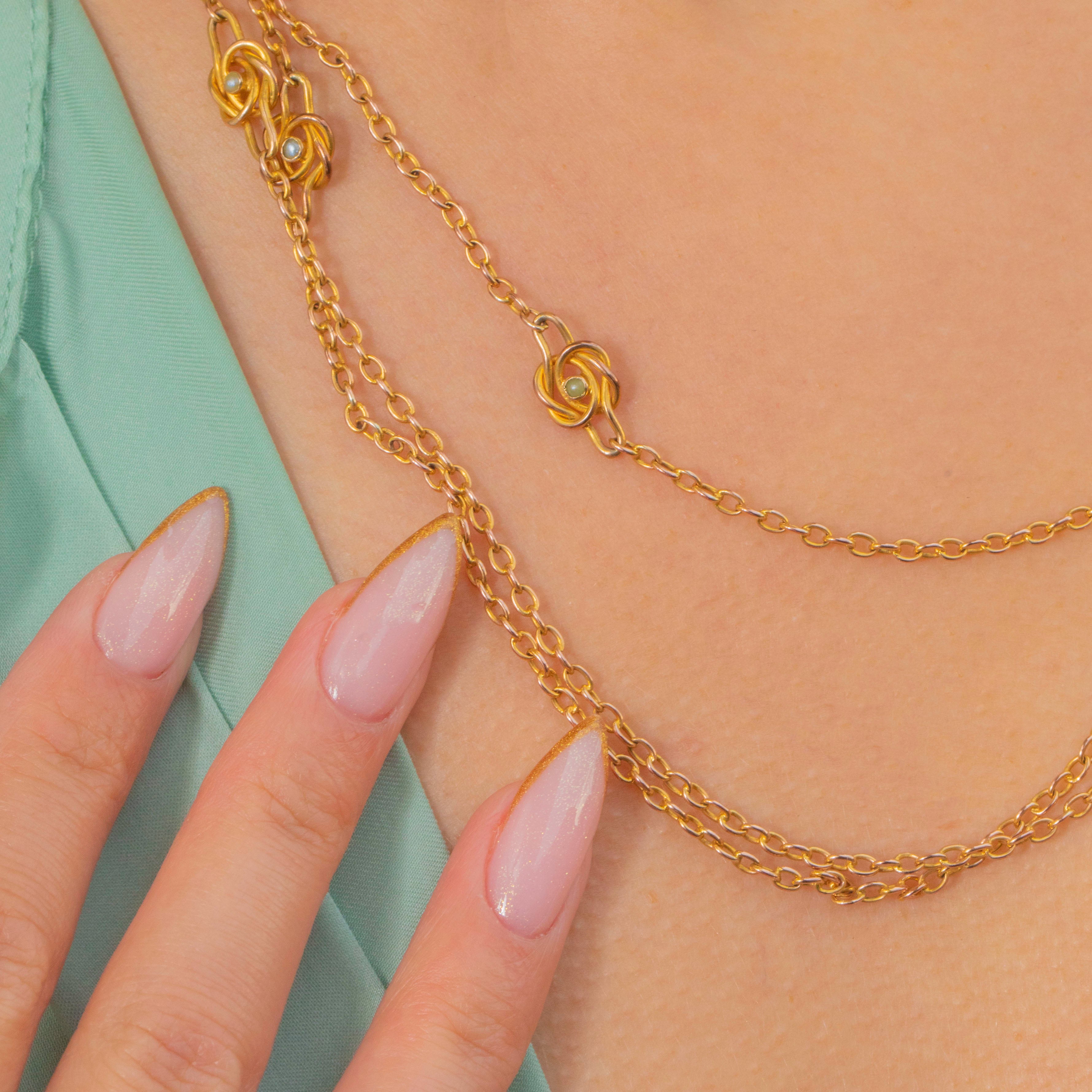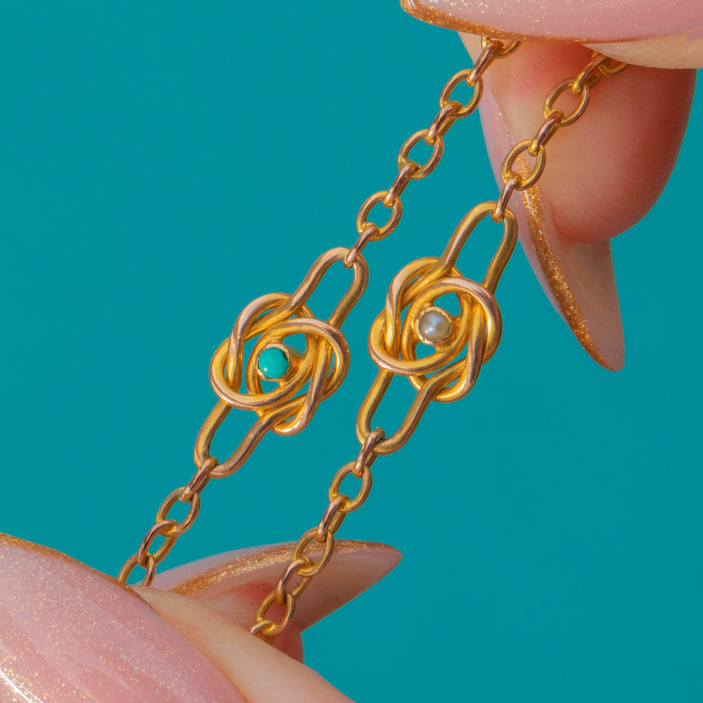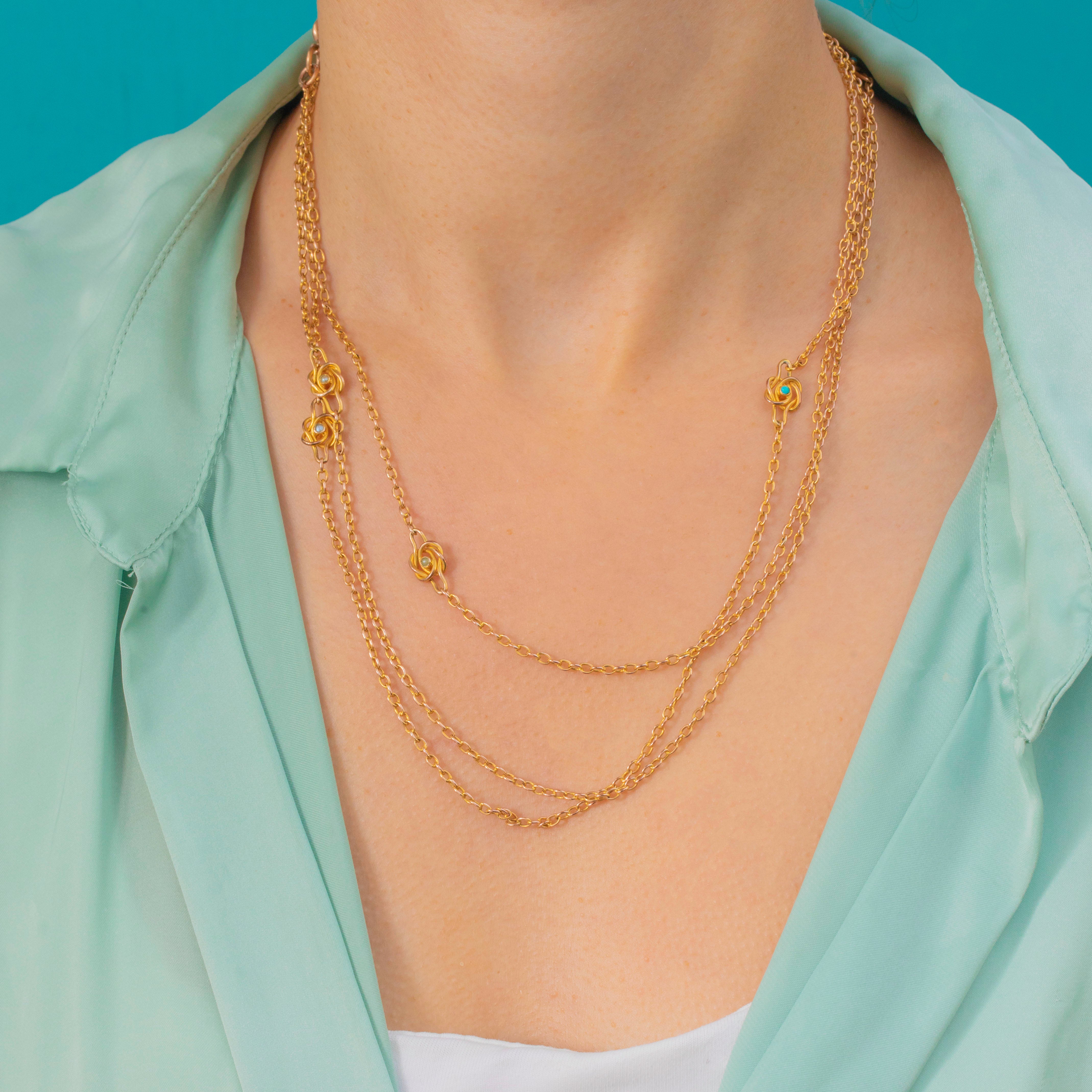 This charming late Victorian longuard chain is a beautiful example of 19th-century craftsmanship. Crafted in warm 9ct Gold, it features delicate open links punctuated by intricate knot motifs, each set with tiny natural Pearls and Turquoise cabochons. The combination of buttery Gold and vibrant blue-green Turquoise gives this piece that unmistakable antique romance.