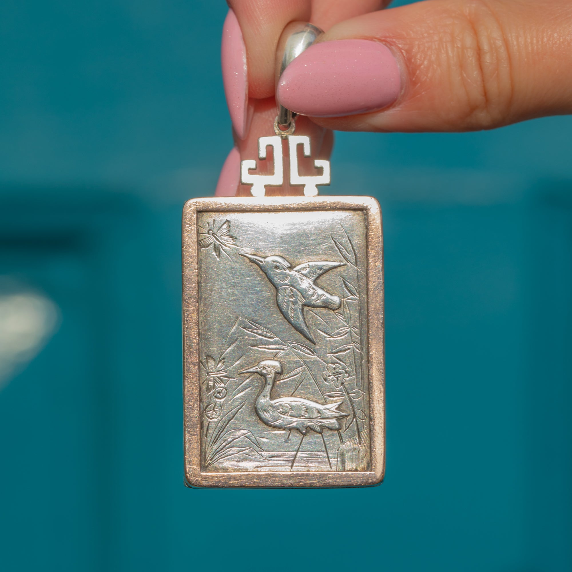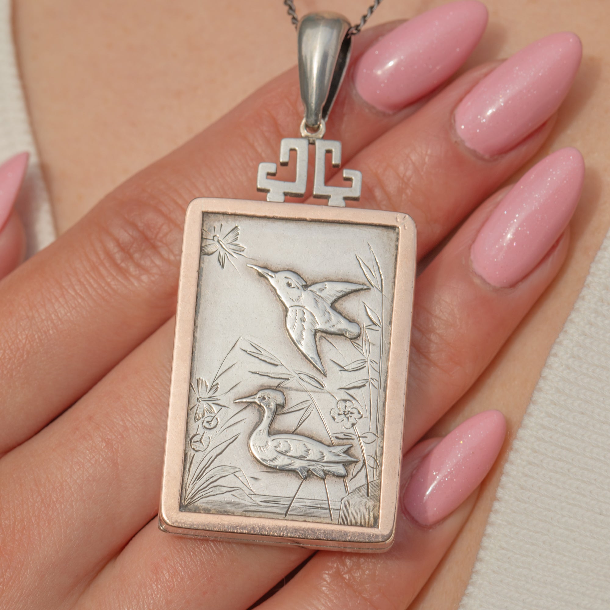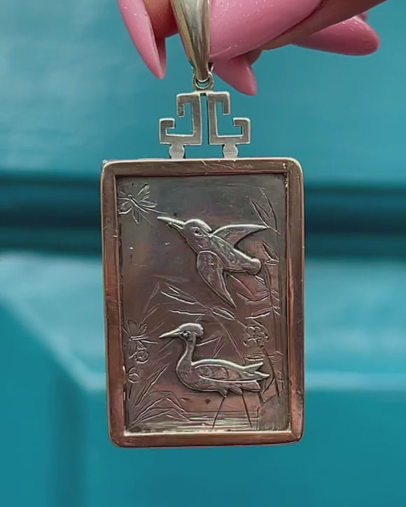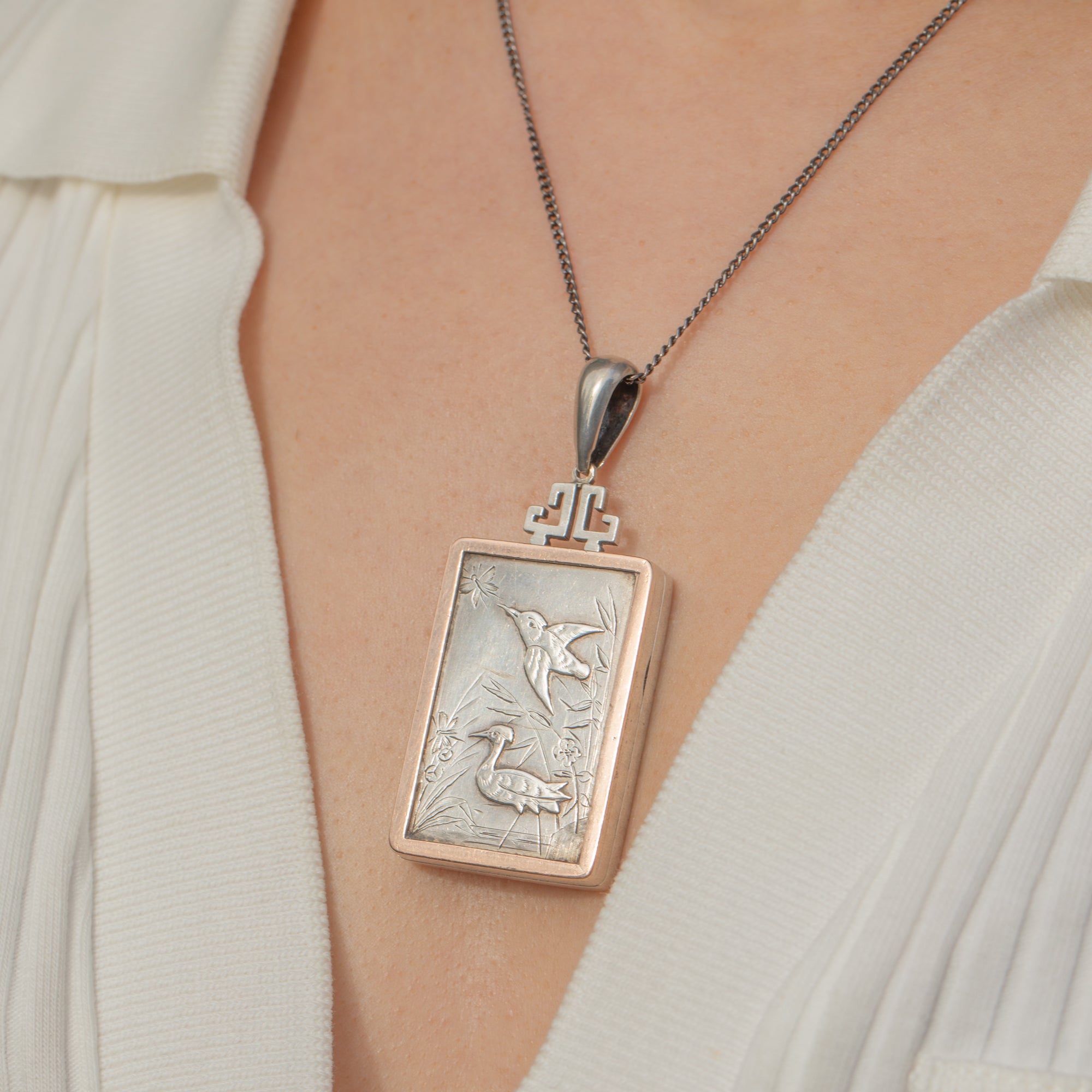 Victorian Aesthetic Silver & 9ct Gold Bird Motif Rectangular Locket
