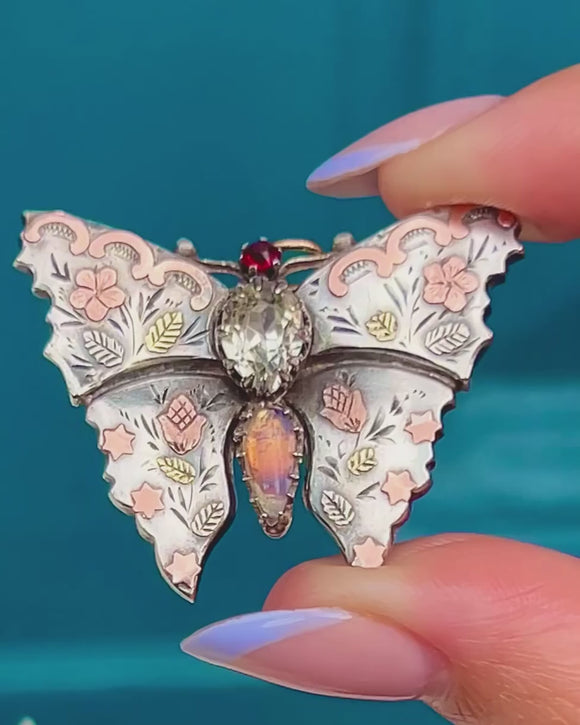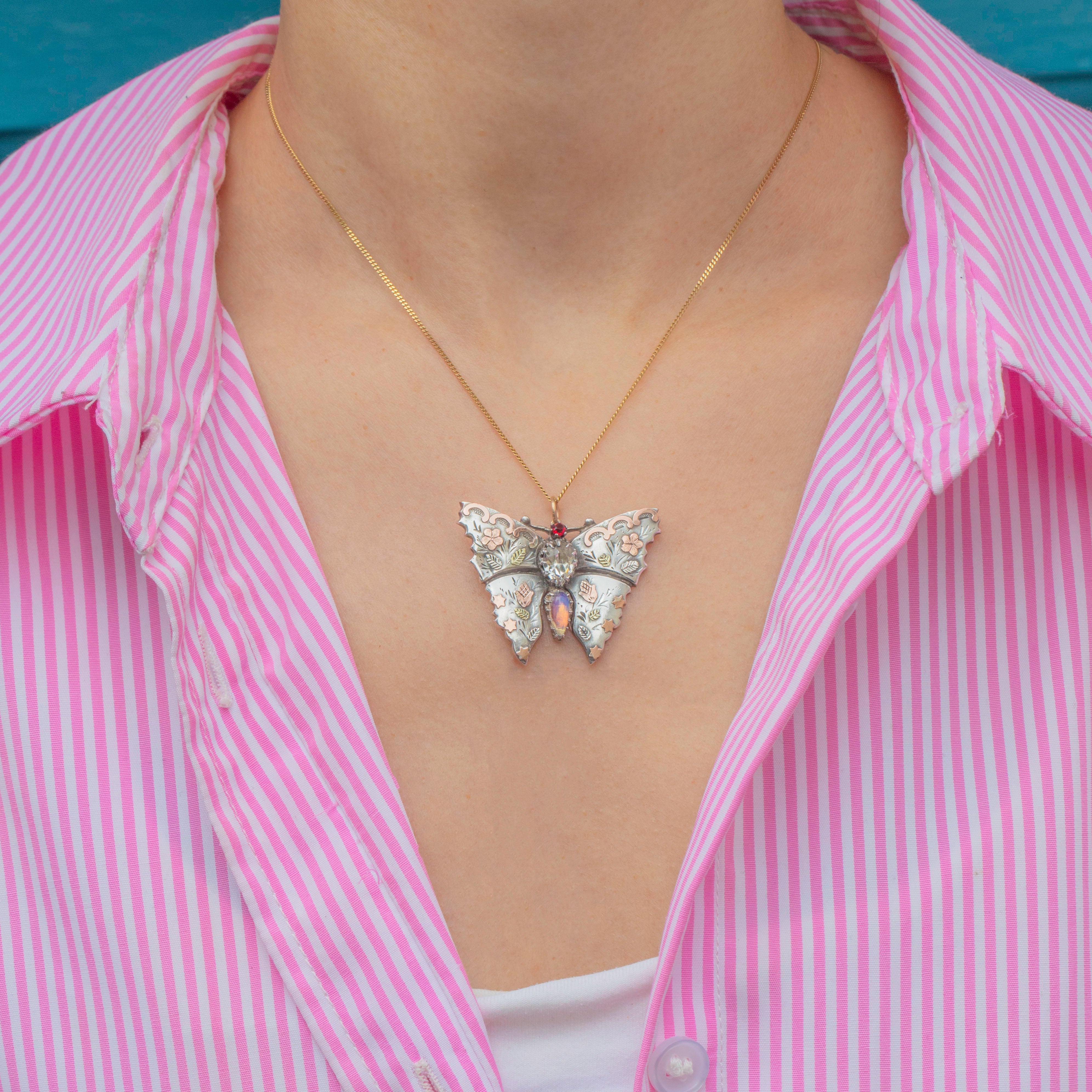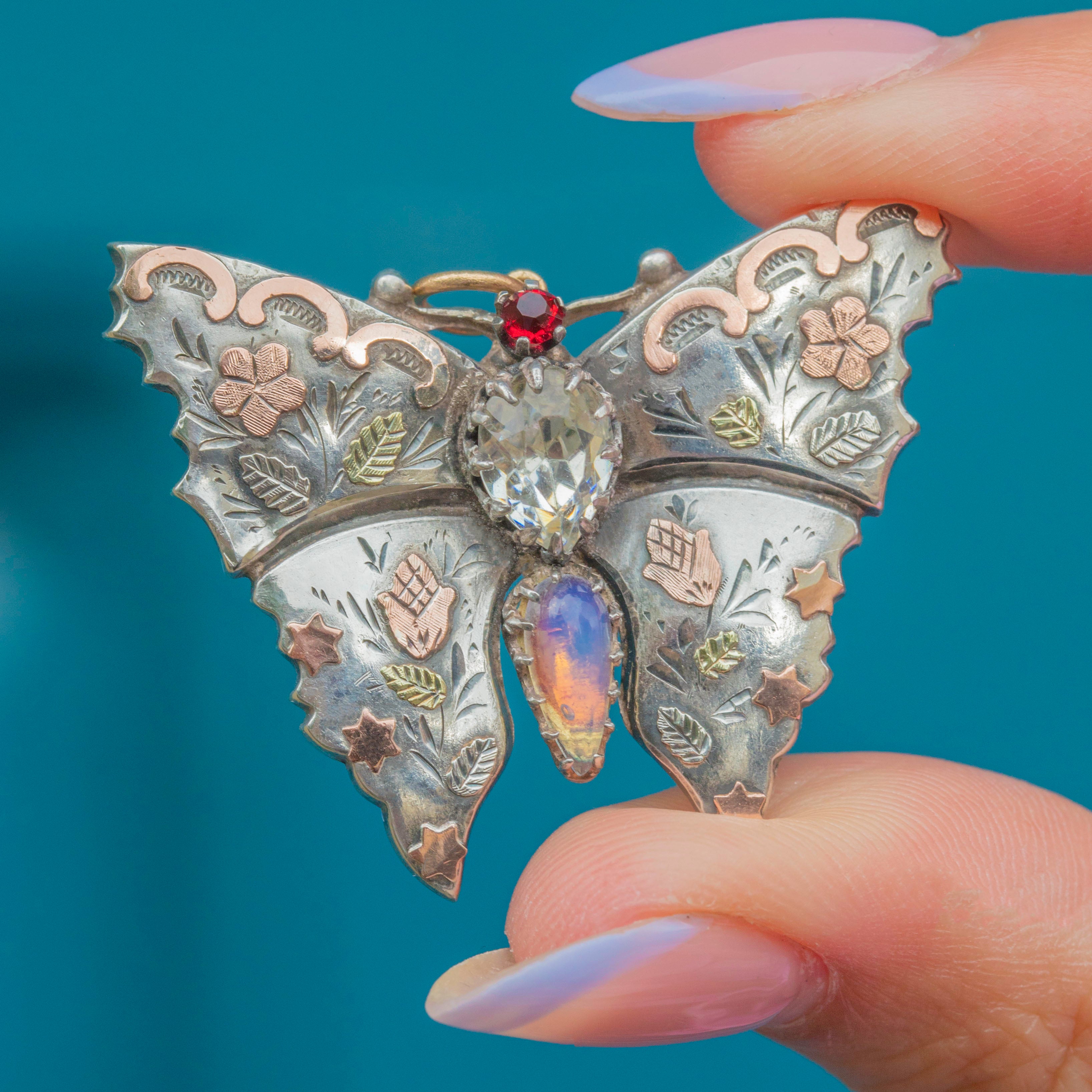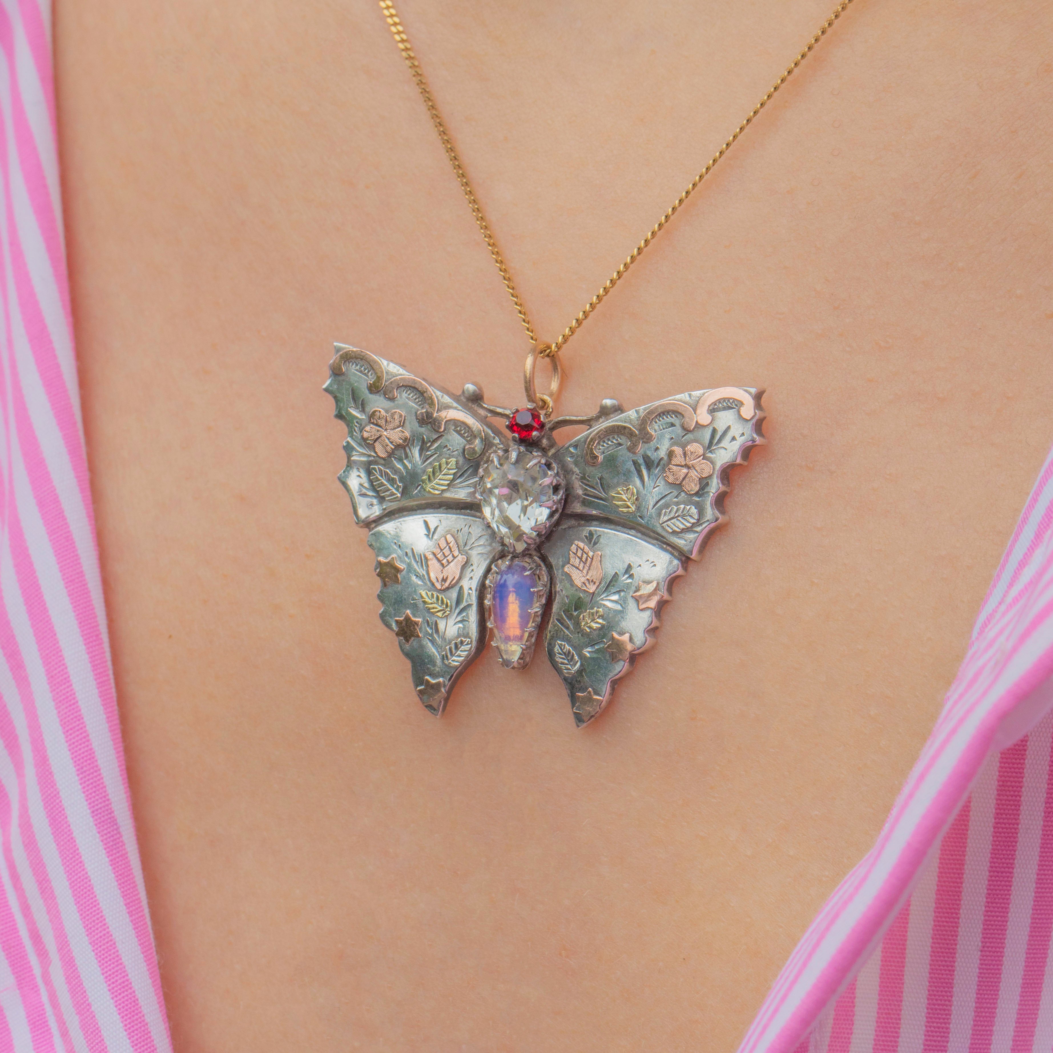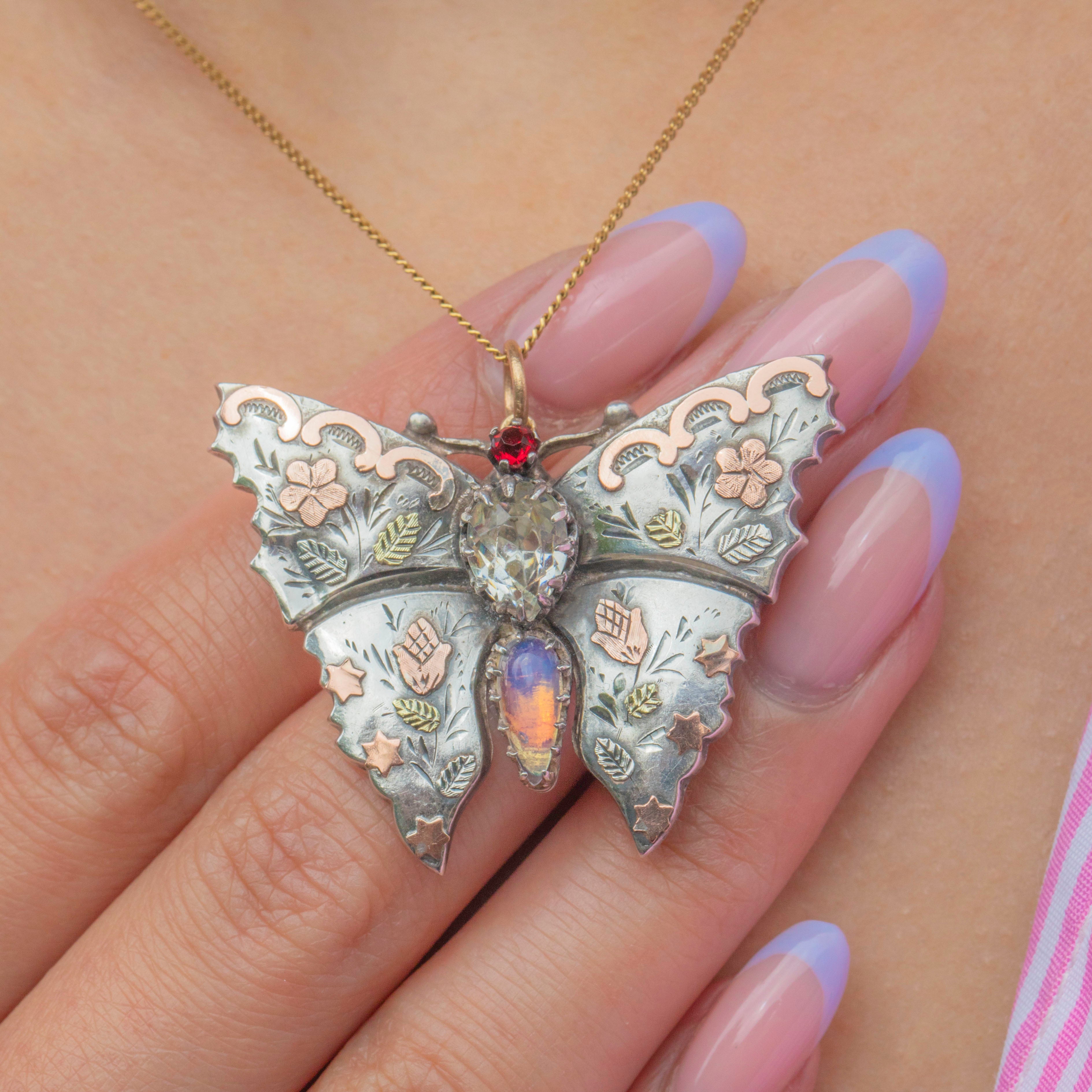 VERY GOOD: This Victorian Aesthetic Silver & 9ct Gold butterfly pendant is in very good condition. The front of the pendant has been wonderfully preserved, with crisp details and secure gemstones. Starting life as a brooch, there is evidence of a conversion on the back, but this is not noticeable from the front and cannot be seen while the pendant is worn. With a full set of hallmarks dating to 1889, this piece of Victorian Aesthetic jewellery will make a superb addition to your collection!