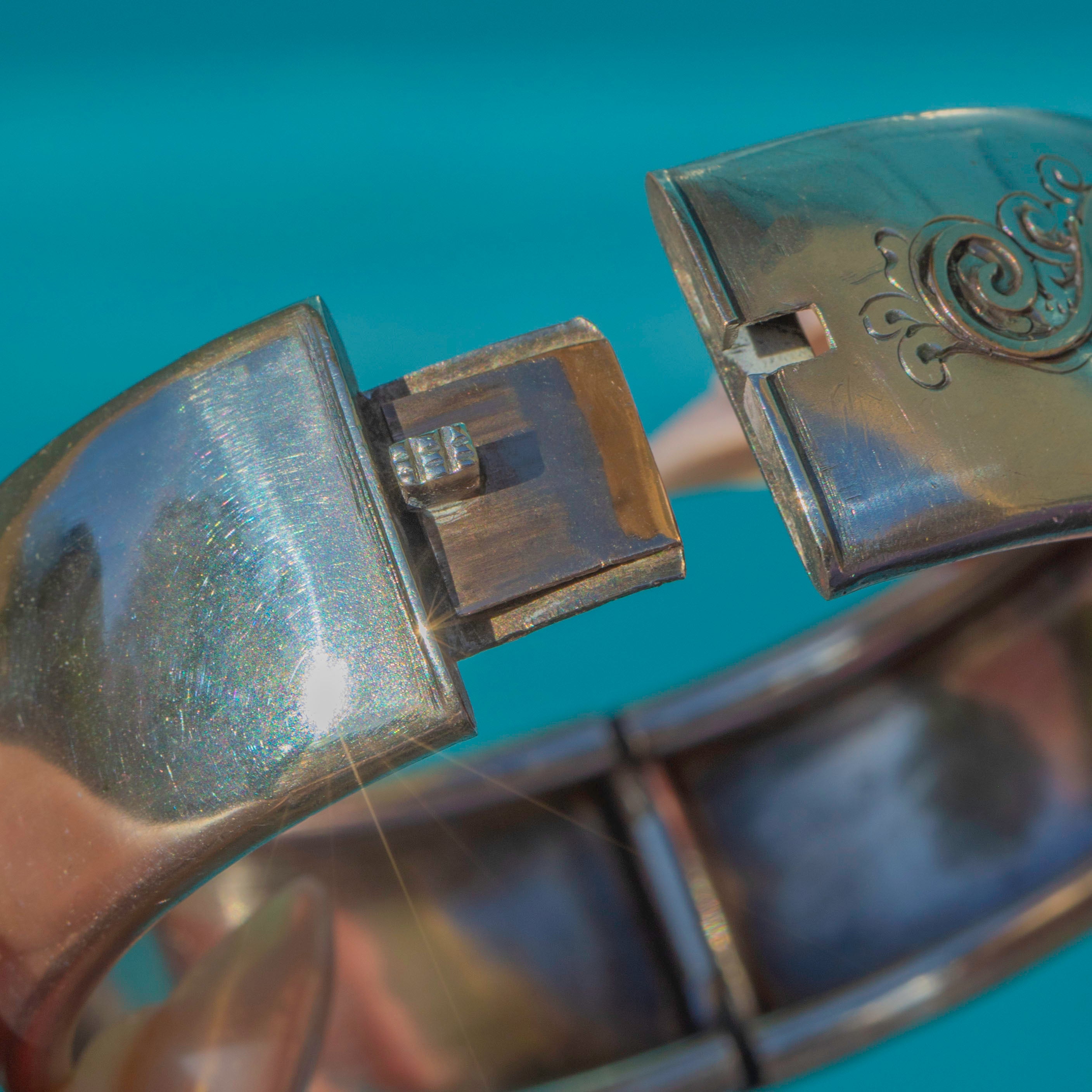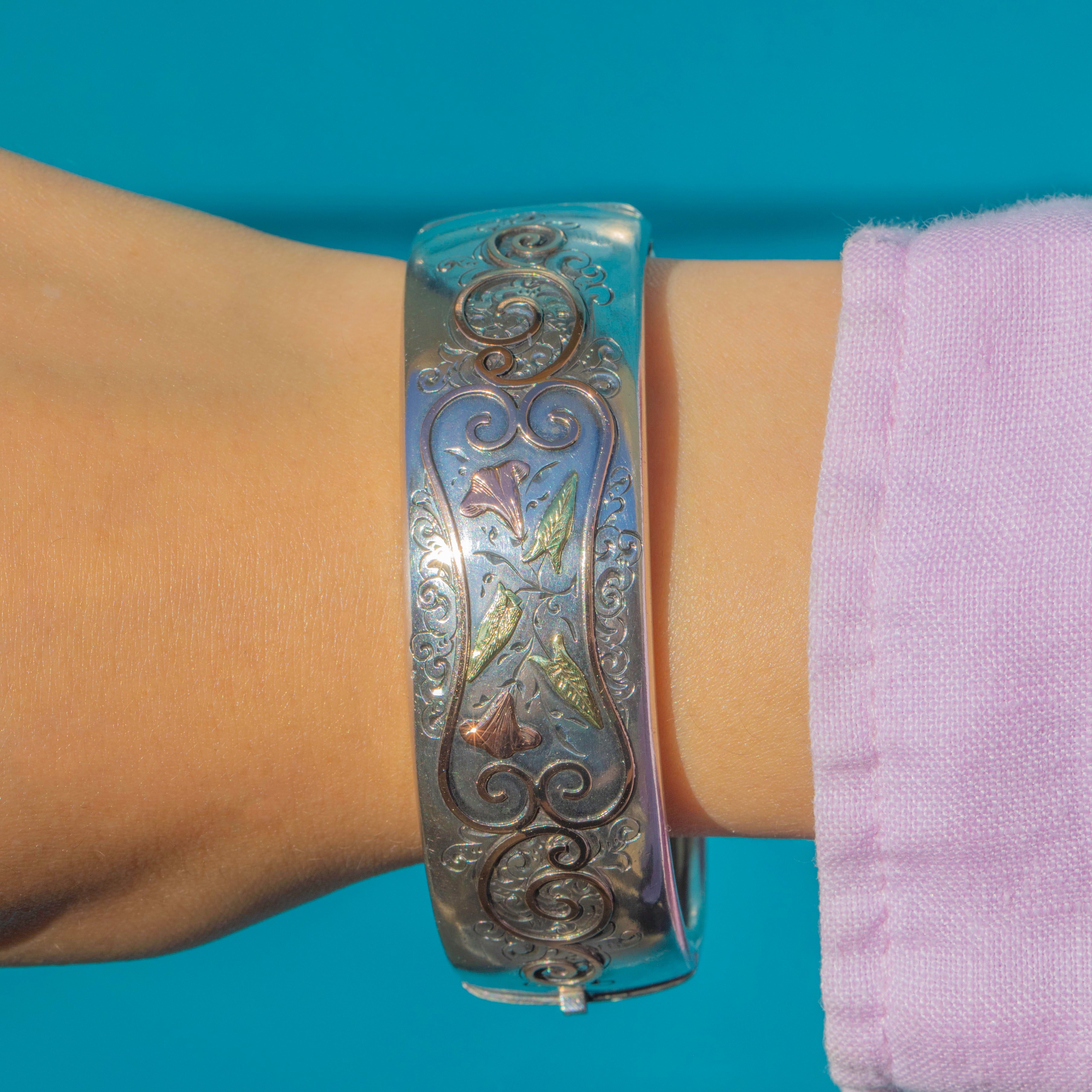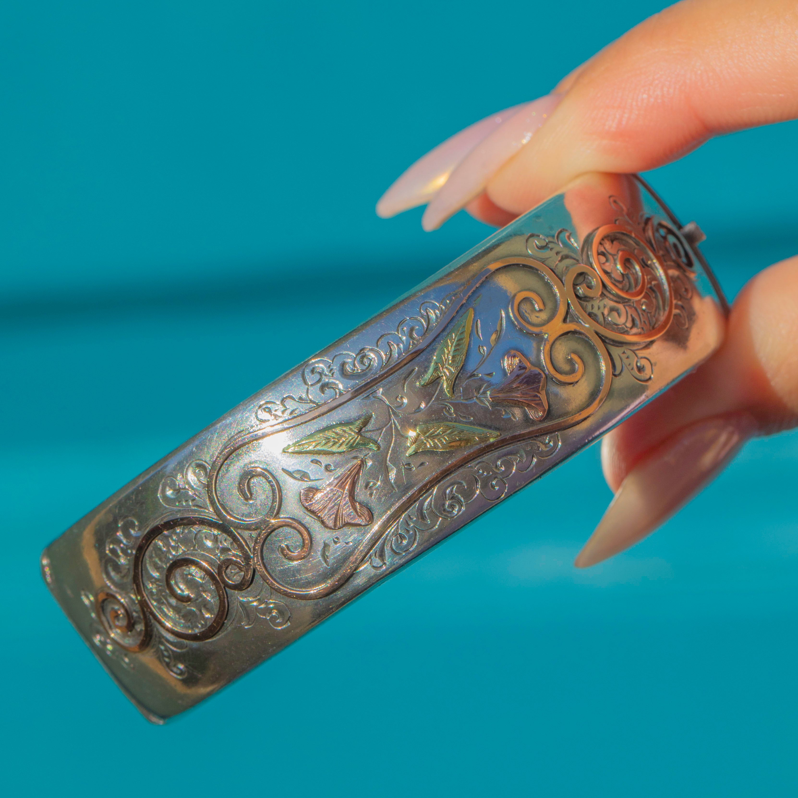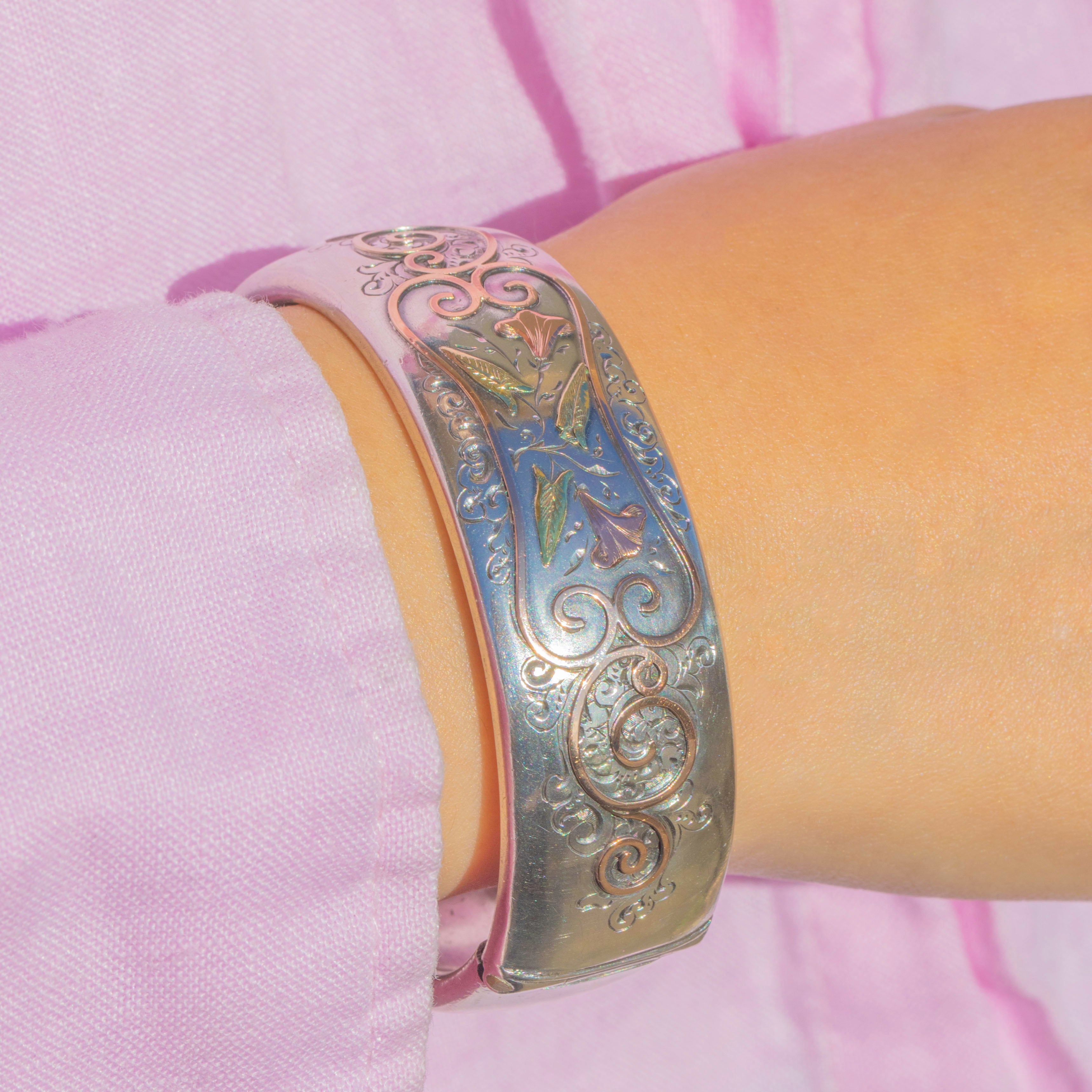 This antique Victorian bangle is crafted in Sterling Silver with beautiful Rose Gold and Green Gold highlights. The design features trumpet flowers, also known as “Easter Lilies”, framed by ornate scrolls — a symbol of purity, virtue, and rebirth in the Victorian era. The domed shape and subtle use of mixed metals create a striking, dimensional effect typical of the Aesthetic period.