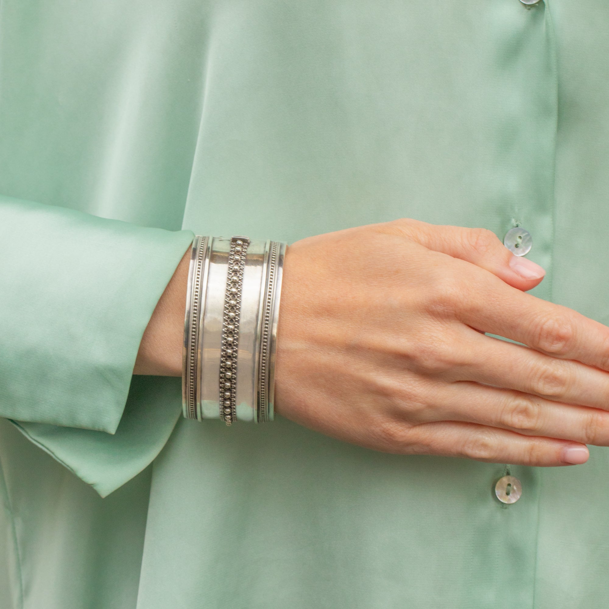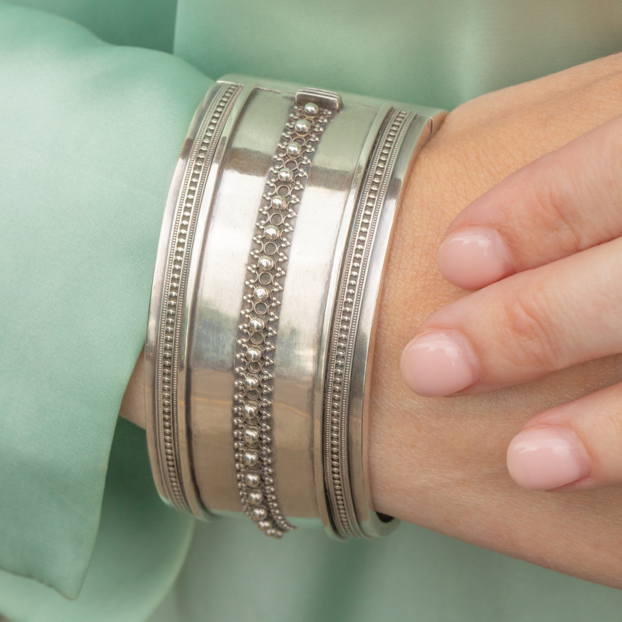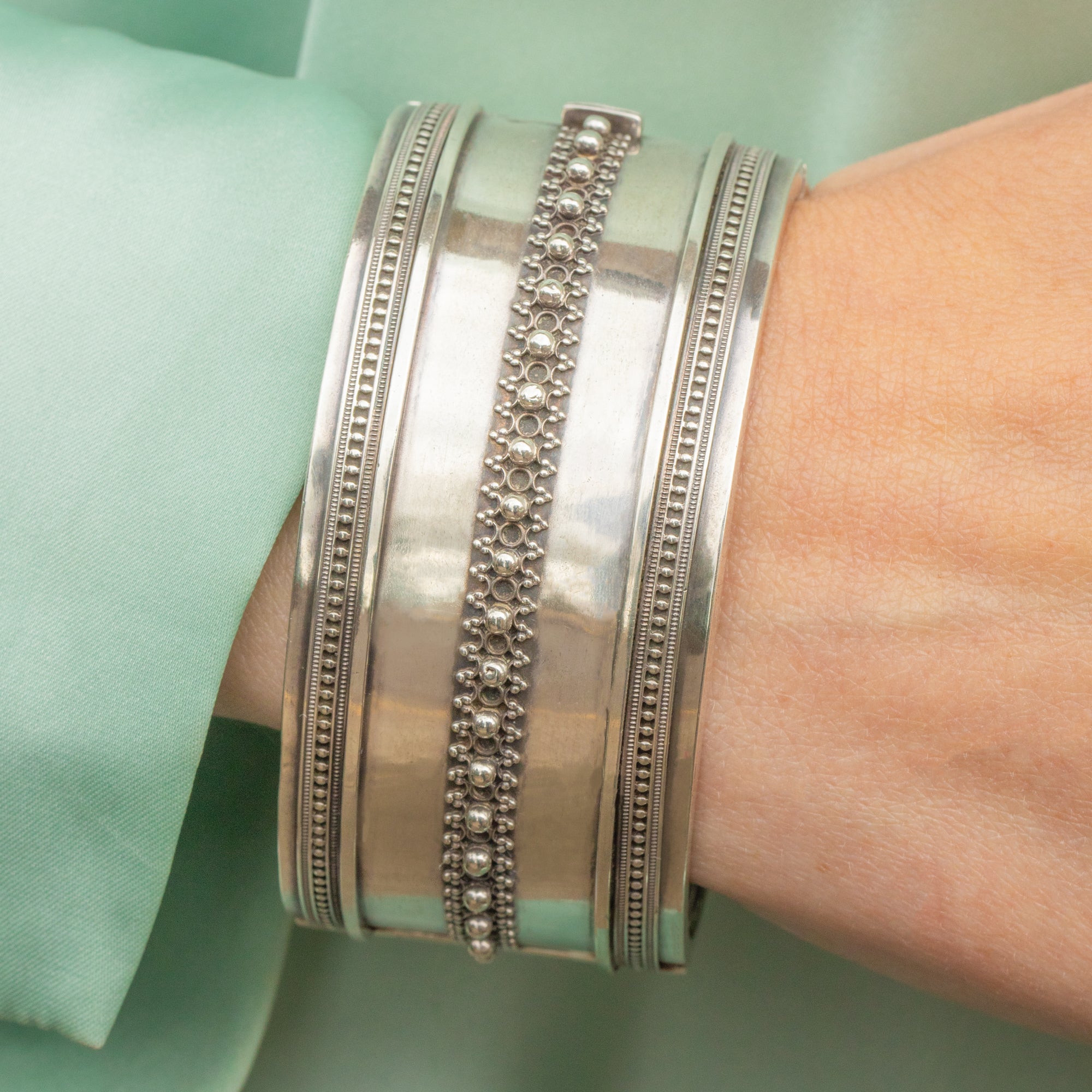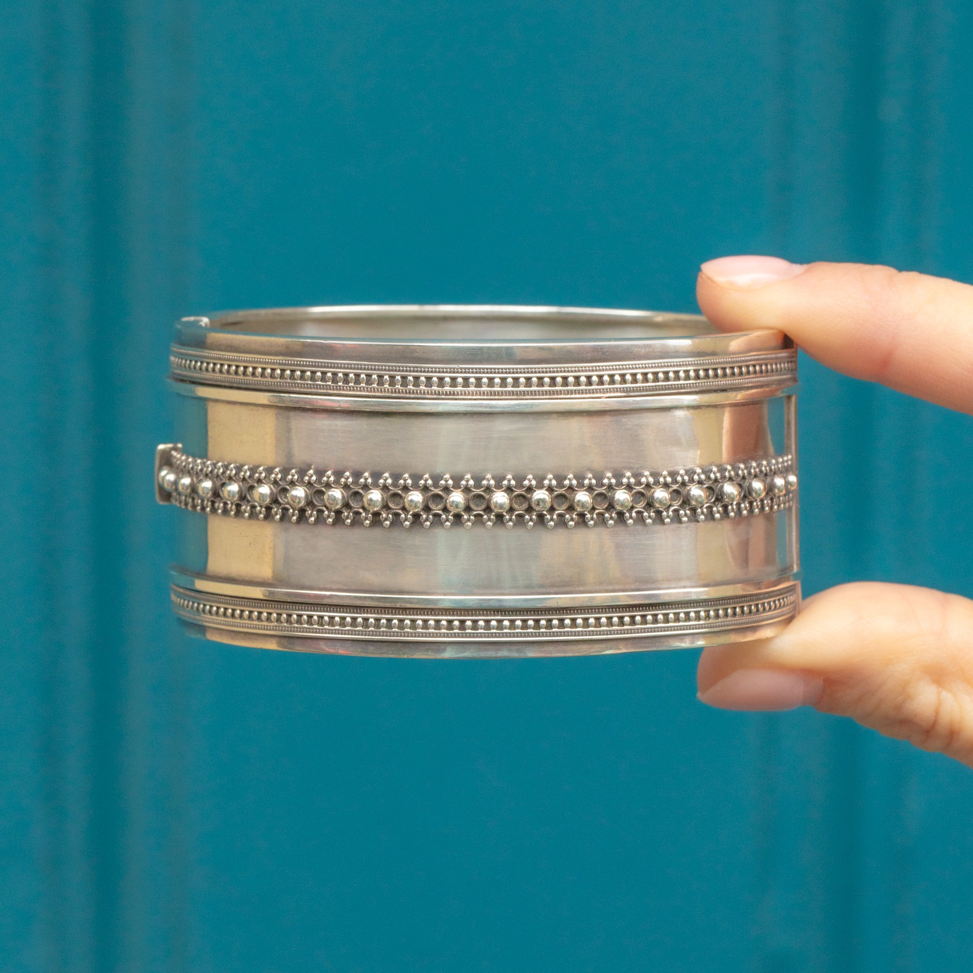Victorian Aesthetic Silver Cuff Bangle Beaded Detail 39g