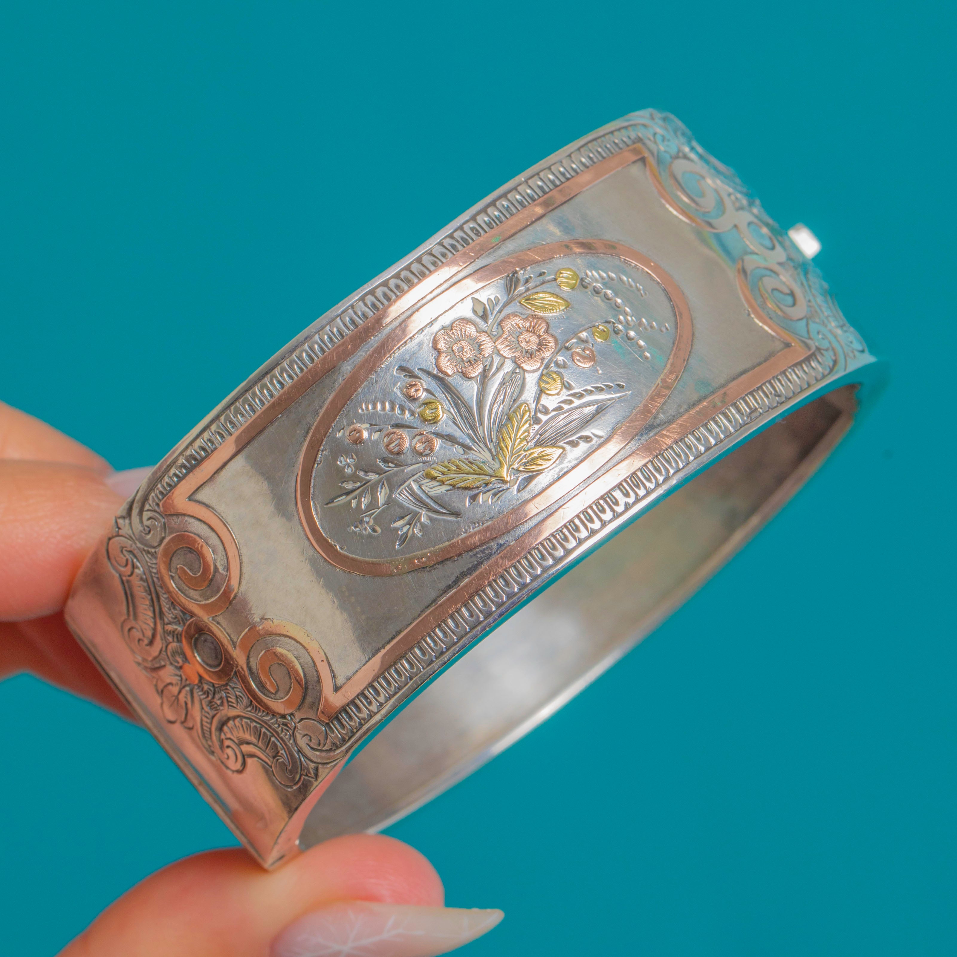 The wide, hinged cuff form is quintessentially late 19th century, with mixed-metal botanical motifs and fine scrollwork embodying the era’s love of nature and contrast.