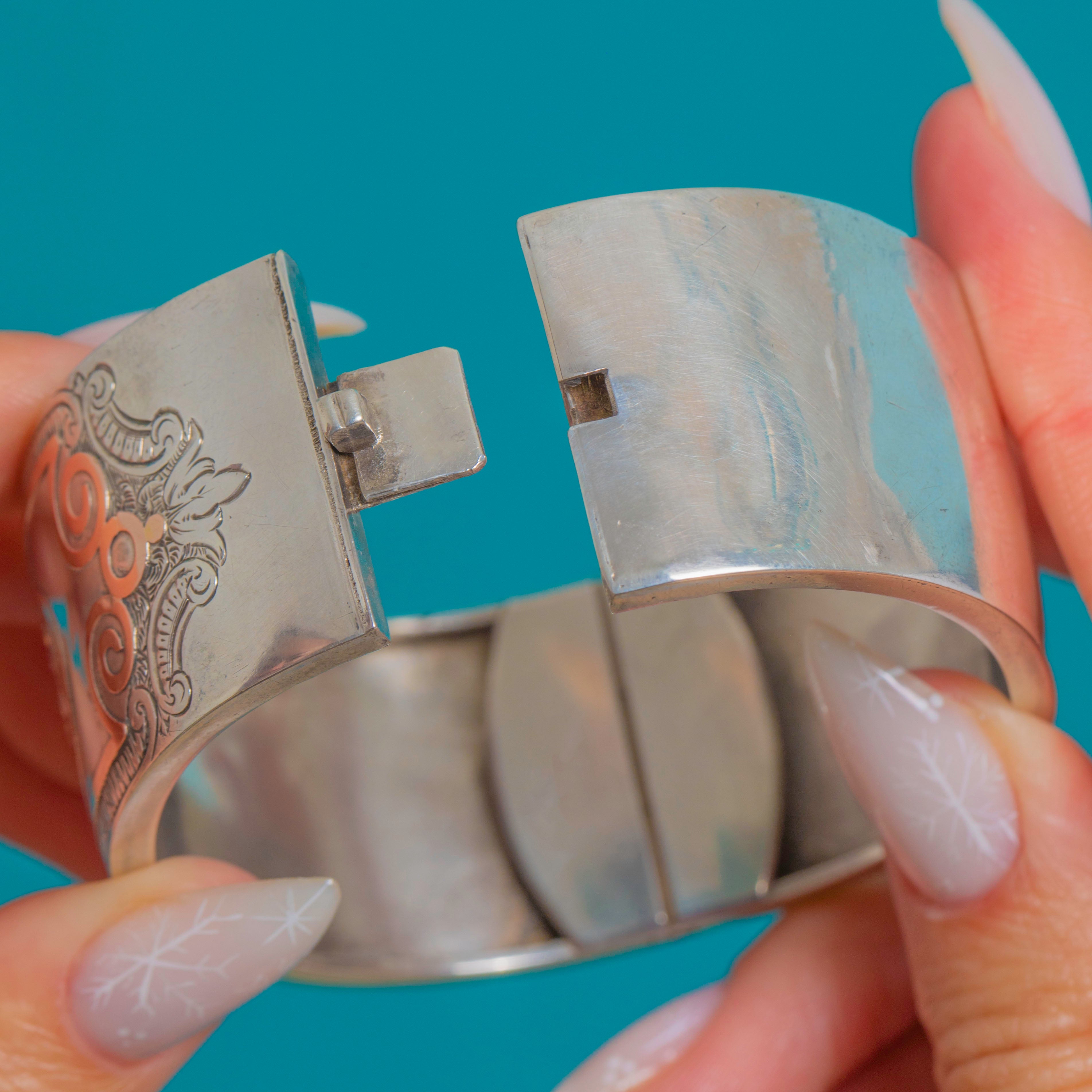 EXCELLENT: Crisp engravings with only light surface wear and a soft, even patina. The hollow-form cuff shows a few tiny pin-dents commensurate with age but no visible repairs. Hinge and box clasp are in perfect working order and close securely.