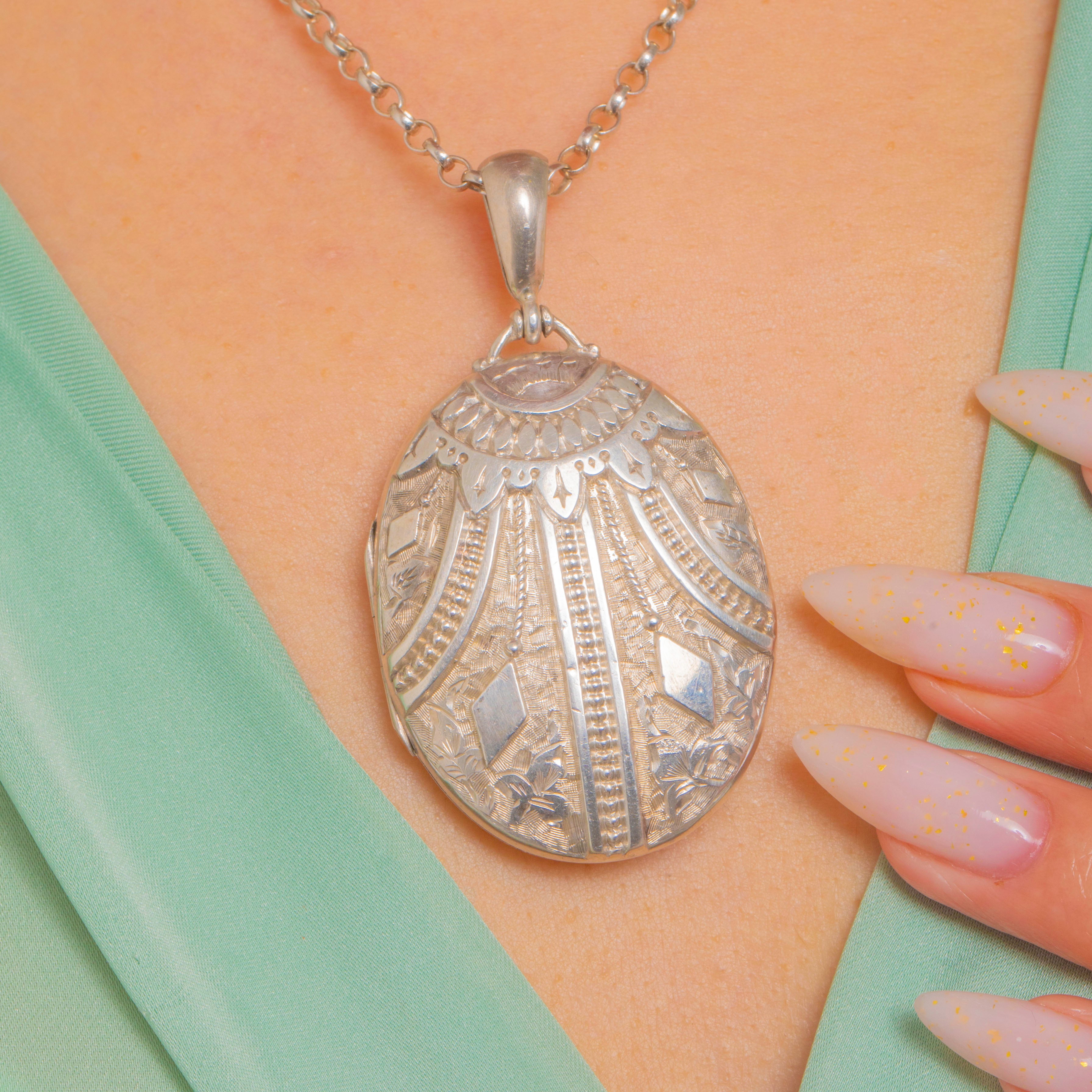 This striking Victorian Aesthetic locket is all about texture and detail, with beautifully engraved panels and beaded accents catching the light from every angle. It’s a wonderfully wearable piece of late-19th century Silver, finished with a classic Victorian bail for easy styling on your favourite chain.