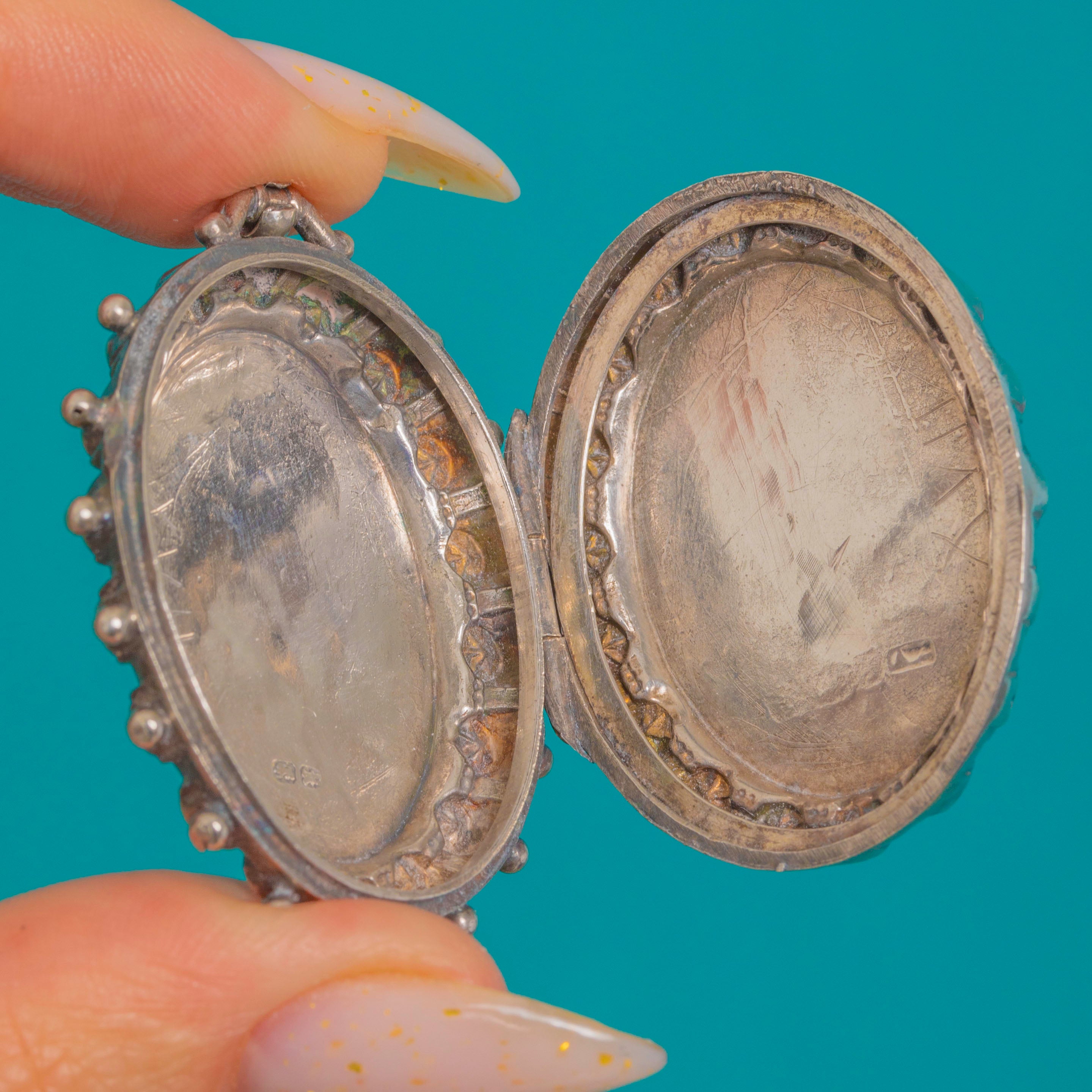 A beautifully characterful Victorian locket, crafted in Sterling Silver and finished with crisp Aesthetic-era star motifs, framed by a decorative beaded border. It’s the kind of piece that feels instantly collectible—ornate without being fussy, and perfect for everyday layering.