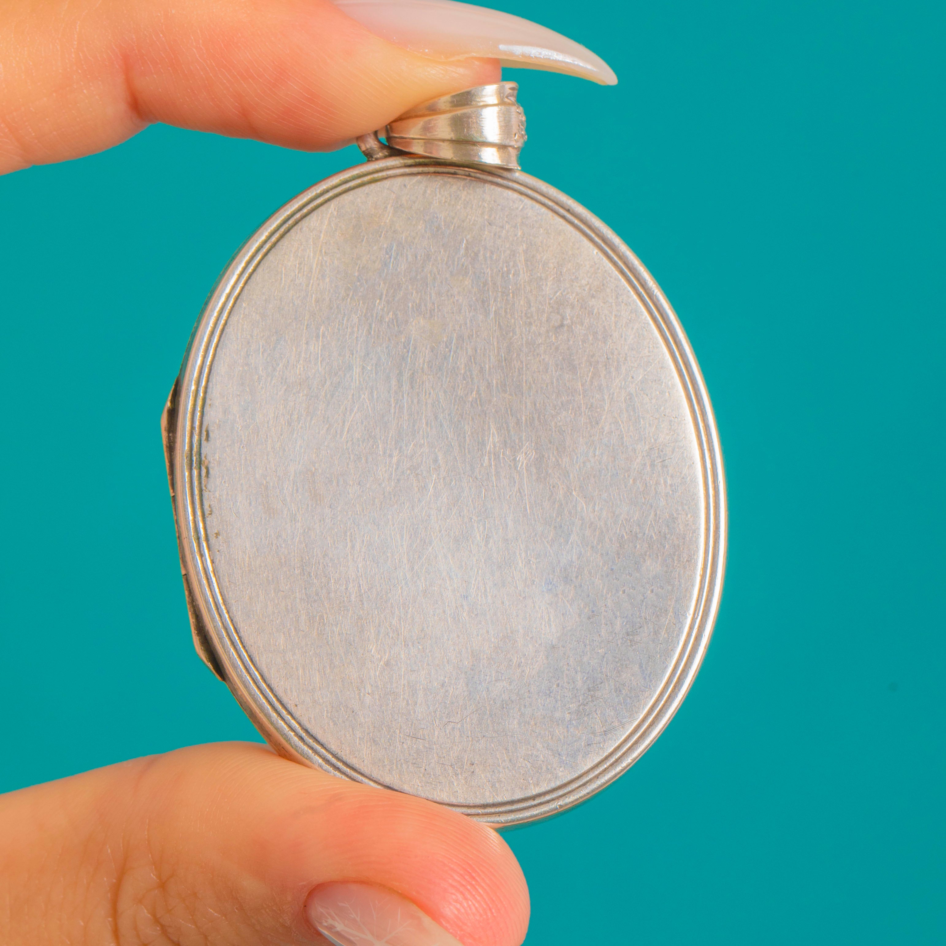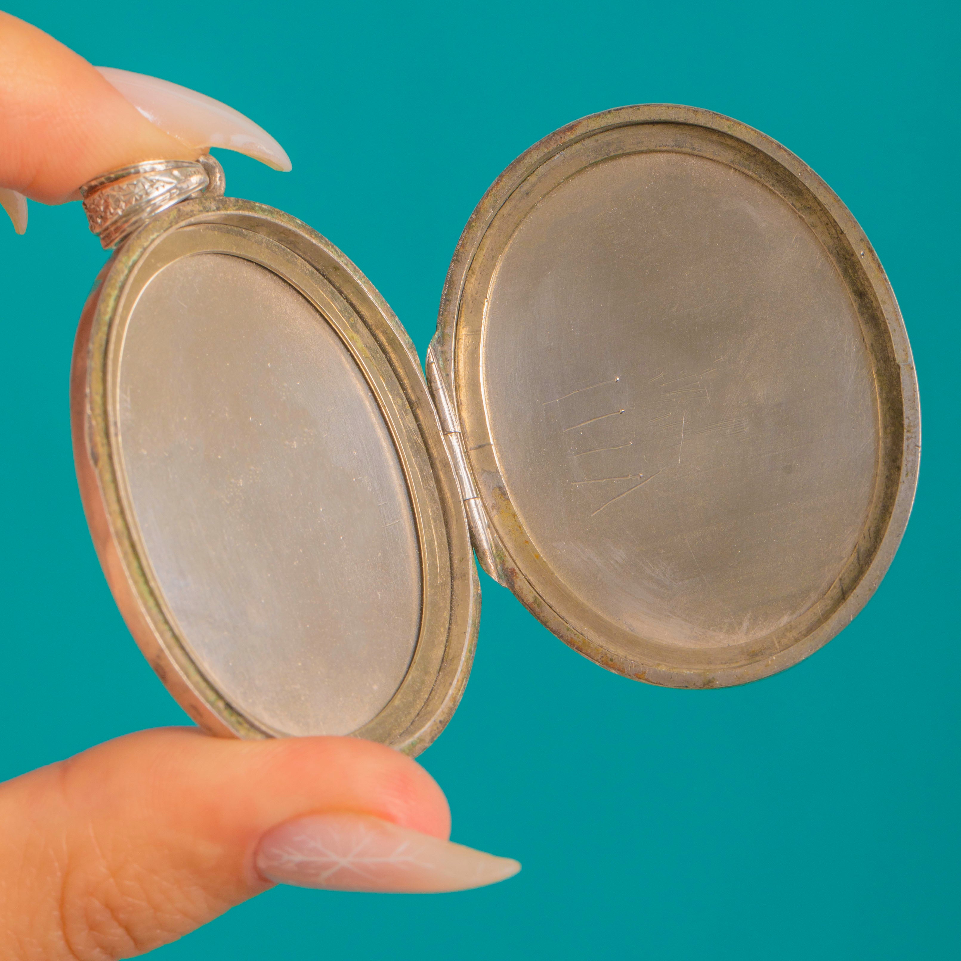 VERY GOOD: The engravings are crisp with light surface wear and a gentle antique patina; a few shallow dings and minor marks commensurate with age. Hinge and bail are secure, and the locket closes firmly though without an audible click. Interior retains both frames with light wear.