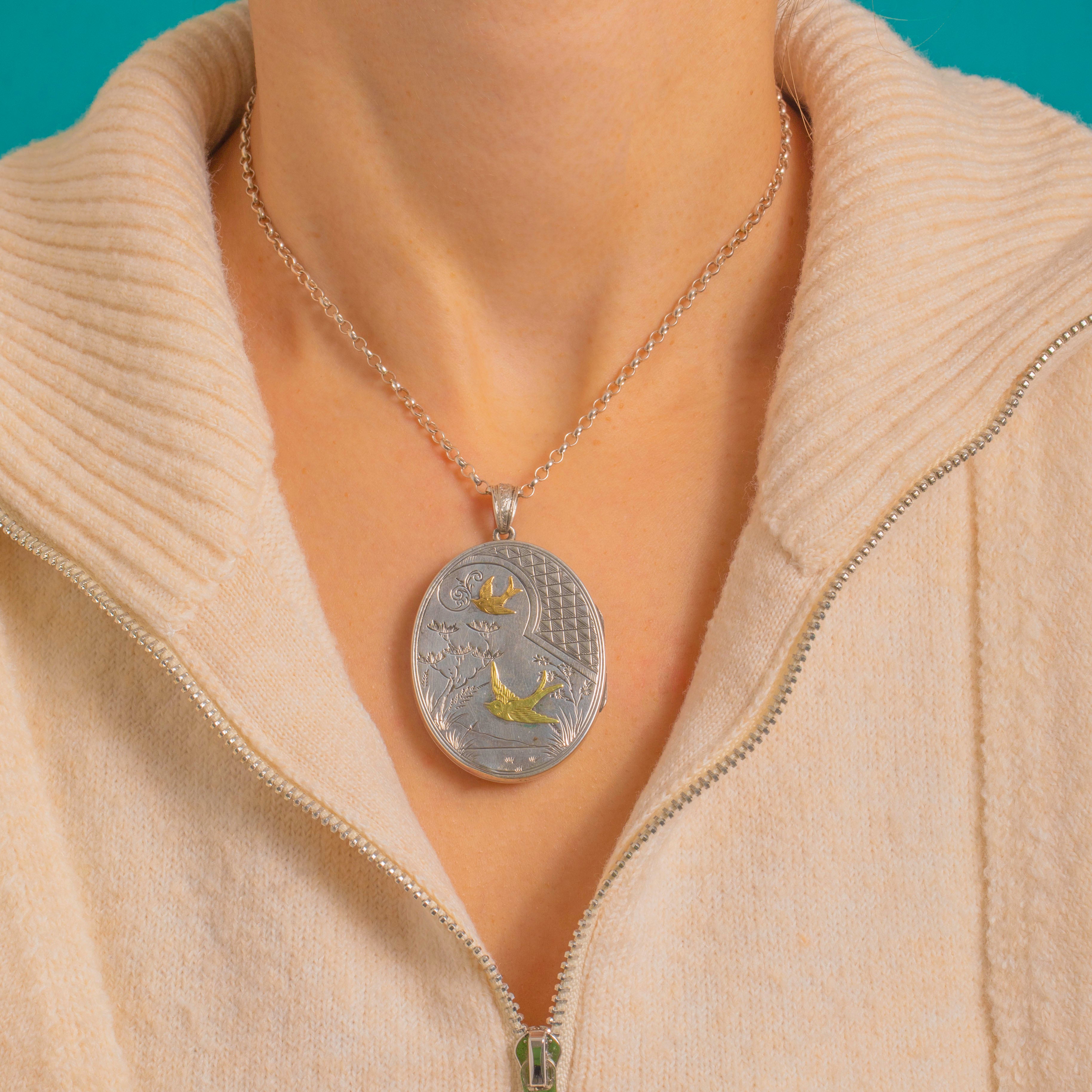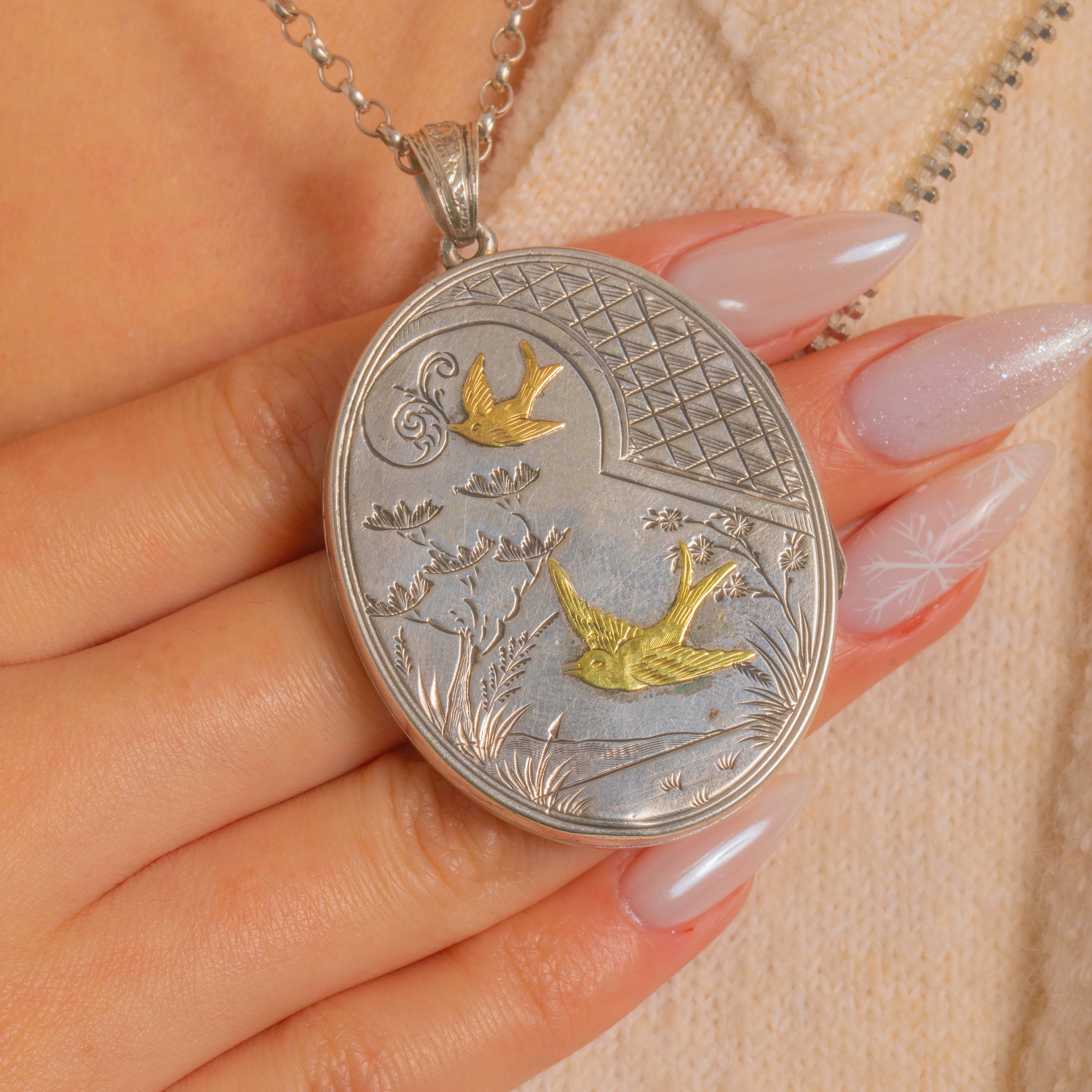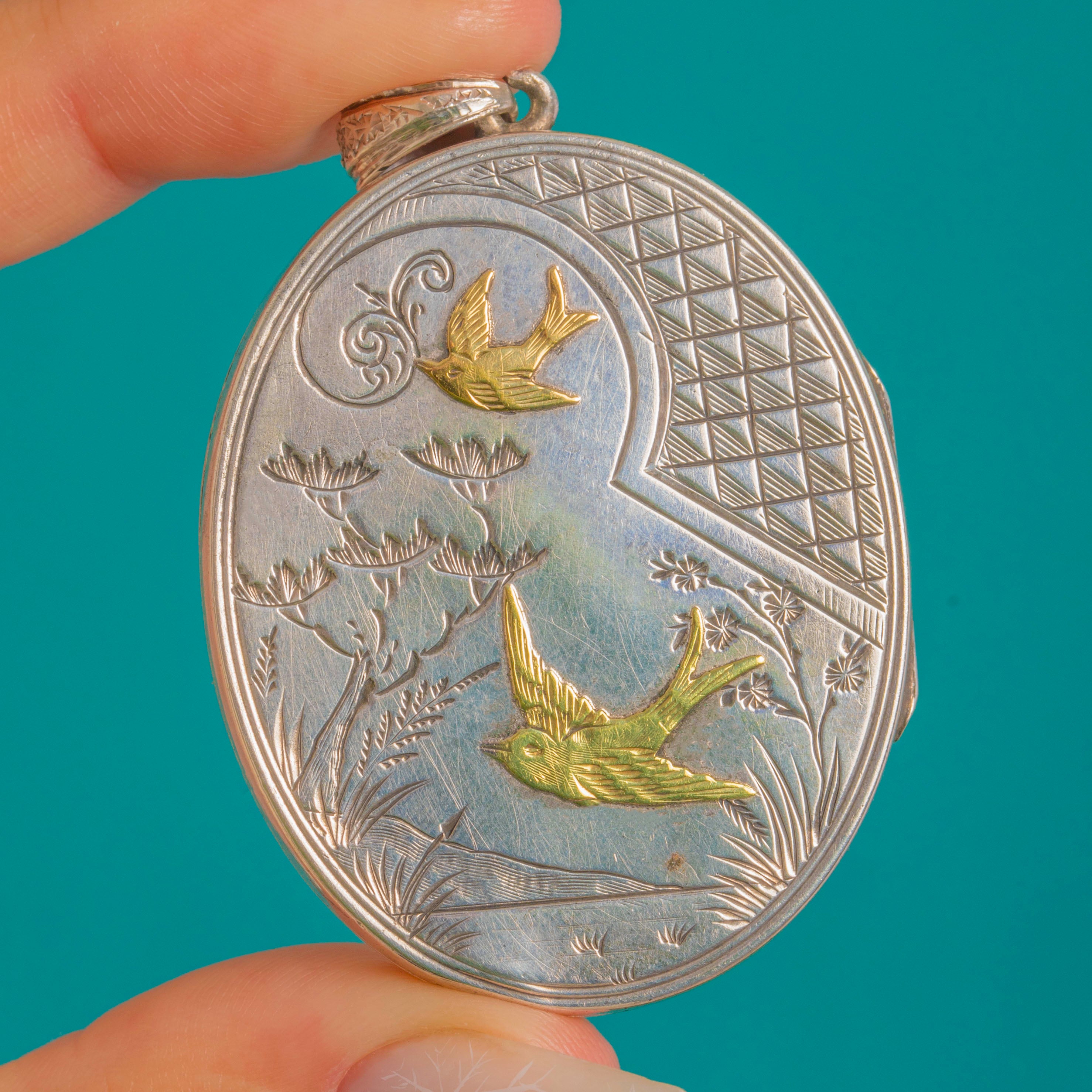A striking Victorian Aesthetic locket, crafted in cool Silver with bright 9ct Gold detailing. The large oval front is exquisitely hand-engraved with swallows in flight, delicate grasses and blossoms, and a geometric trellis panel. The two-tone contrast is beautifully judged, the golden birds poised against the silvery ground for a refined, nature-led tableau with a distinctly Japanese-influenced design.