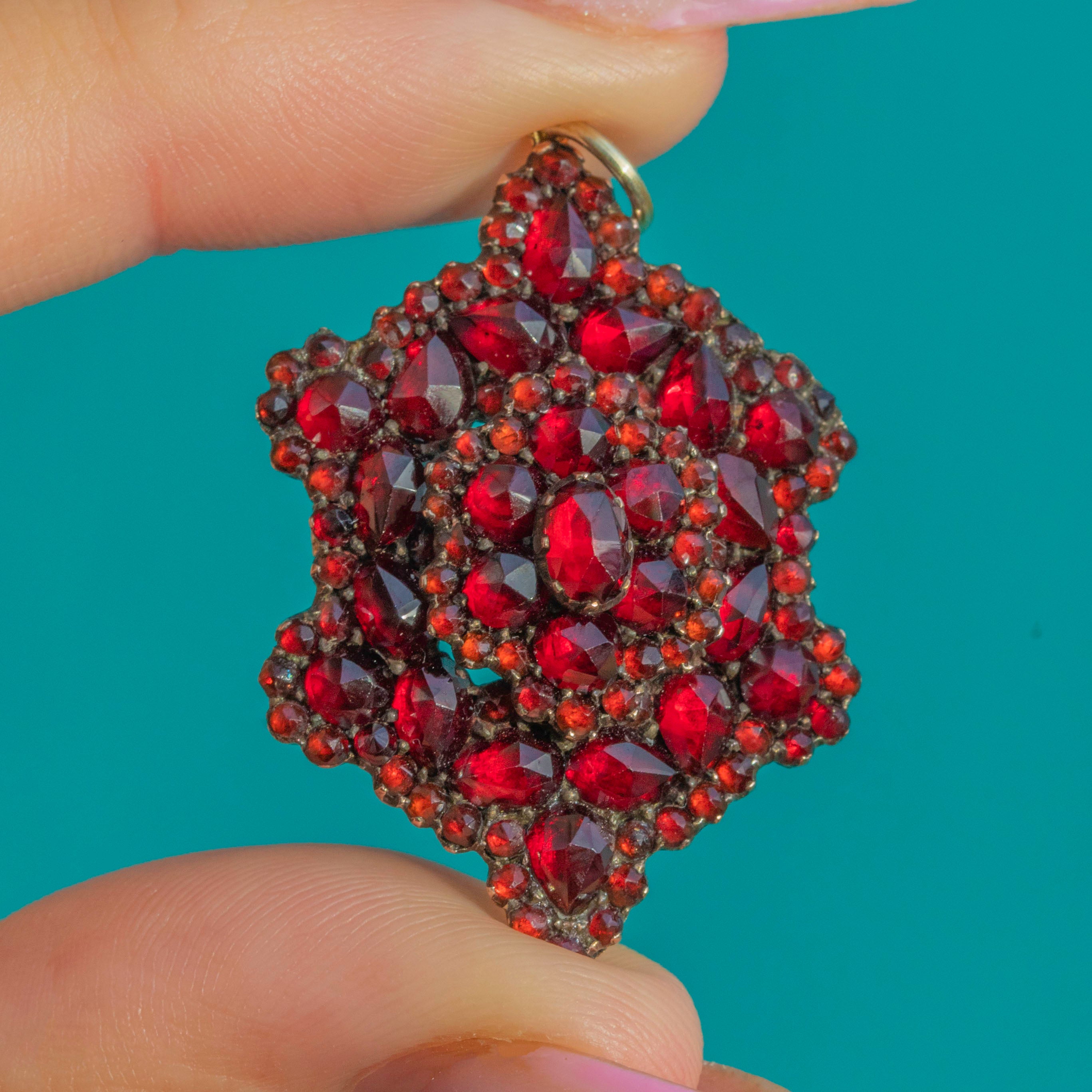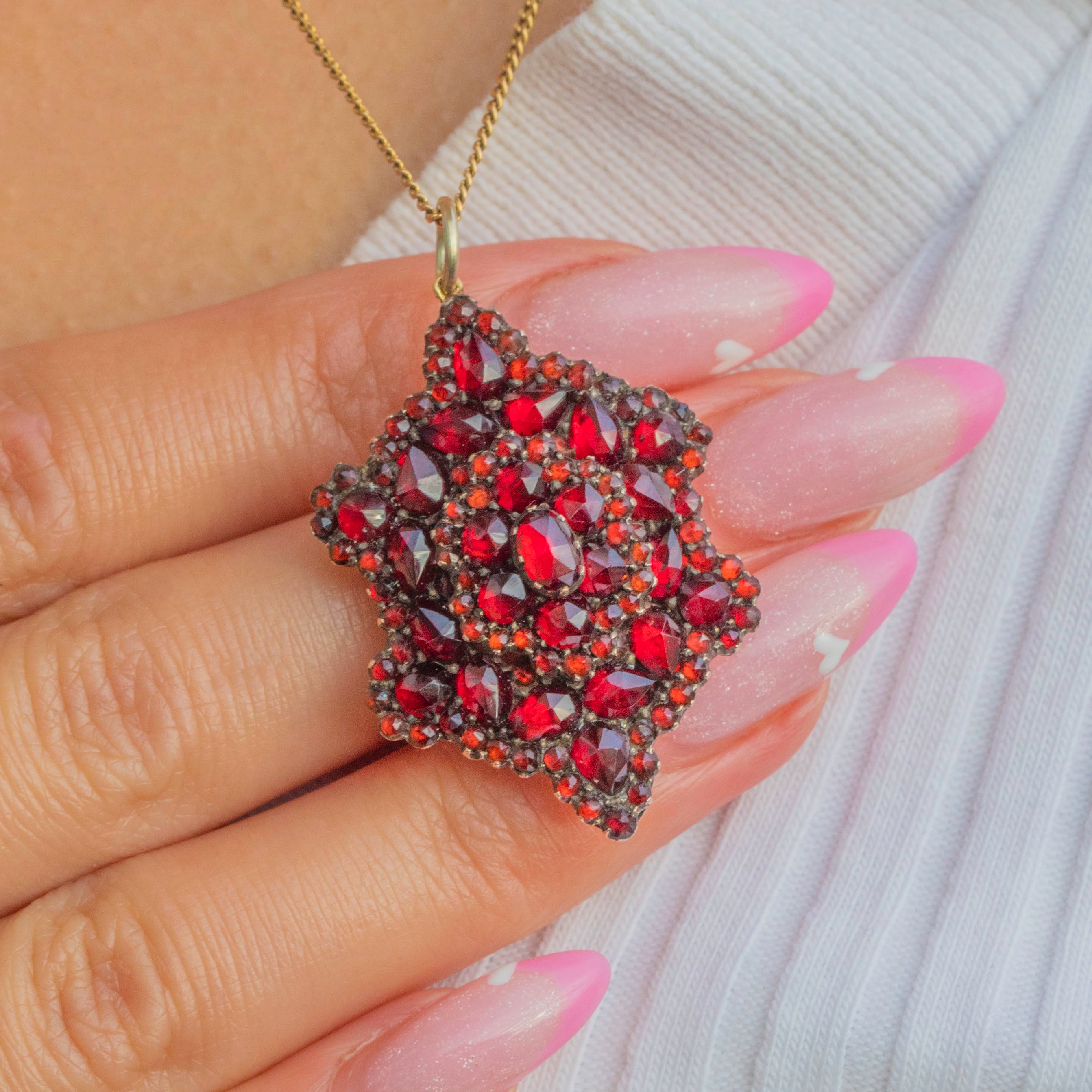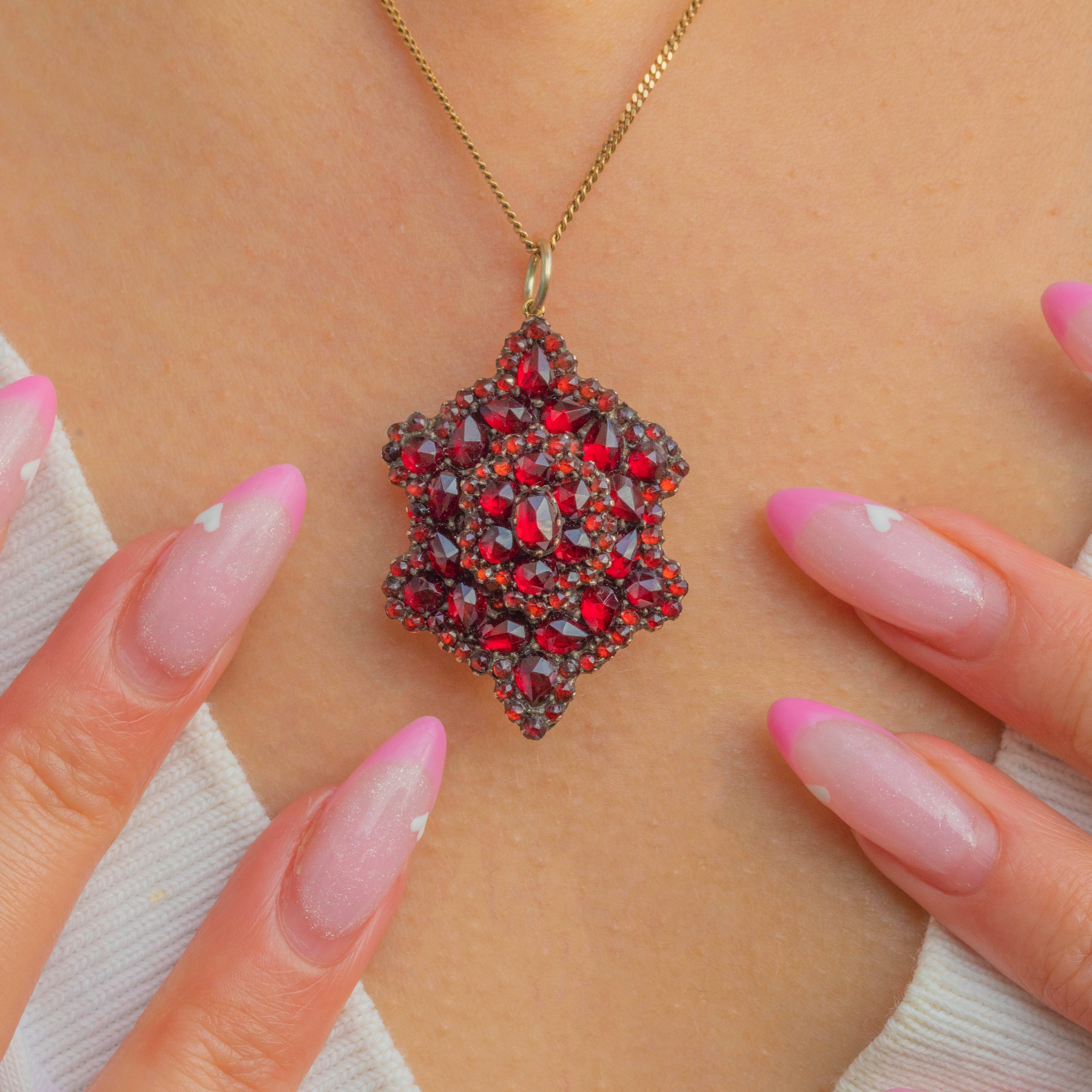 The fiery inner glow of the Garnets contrasts beautifully against the antique Gold-toned metal, creating a dramatic play of light and depth that Victorian jewellery is celebrated for.