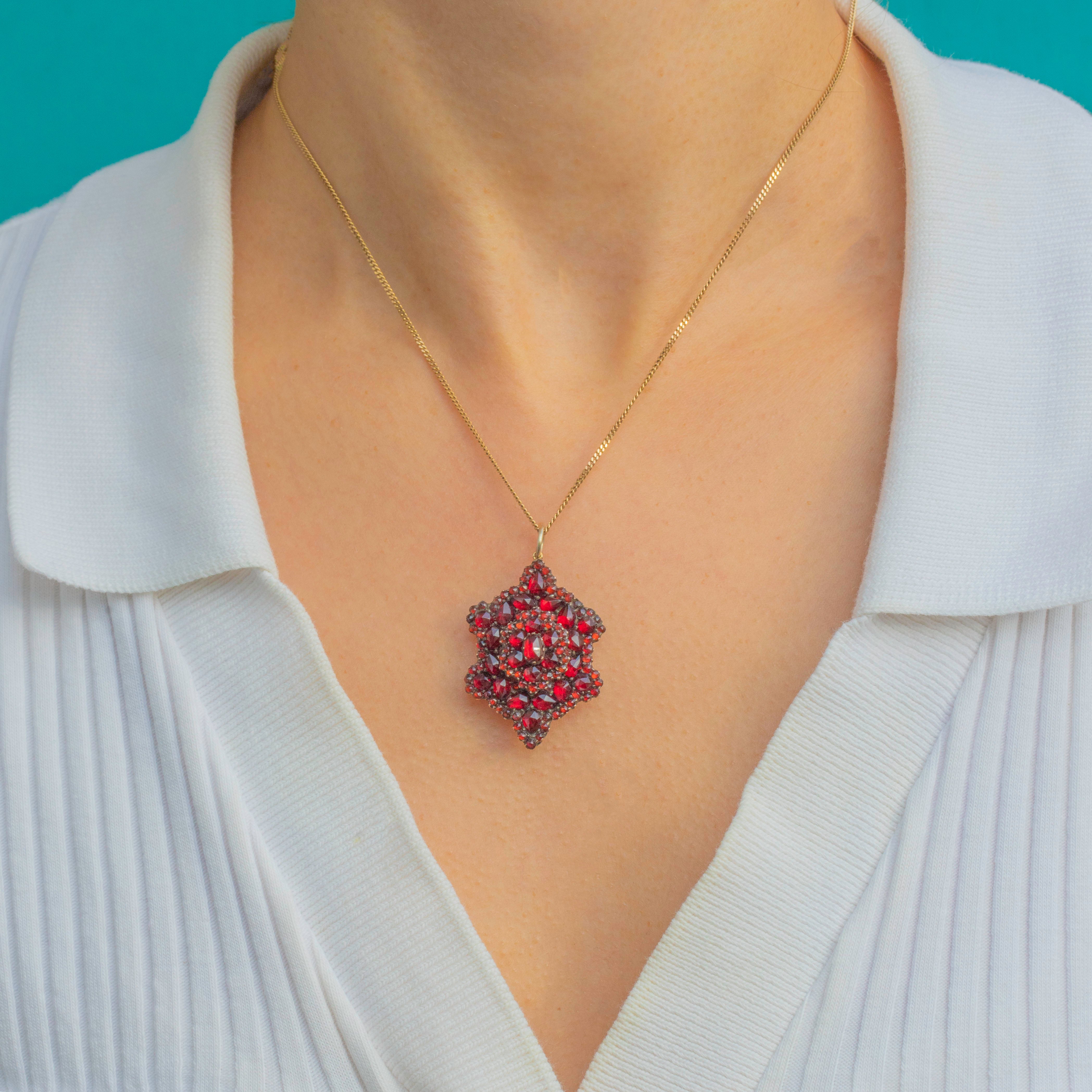 This sumptuous Victorian Bohemian Garnet pendant captures all the opulent beauty of the mid-19th century. A cluster of deep red Garnets forms a radiant bloom, each gem hand-set in richly toned “Garnet Gold” metal with a locket back for a sentimental photograph or token.