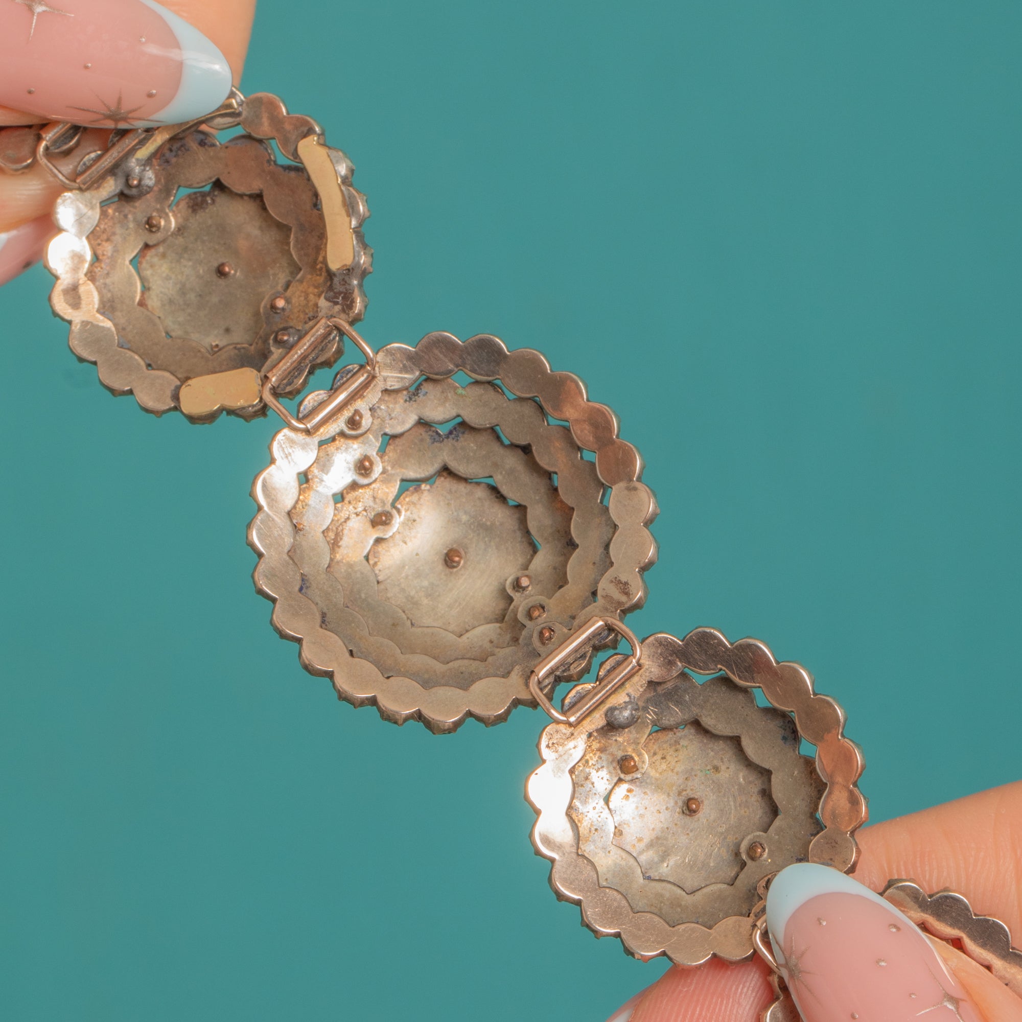A sumptuous Victorian Bohemian rose-cut Garnet bracelet composed of graduated, domed rosette panels, each packed with glowing Garnets arranged in concentric halos. The rich crimson sparkle dances across the wrist, enhanced by closed-back cluster settings and the warm hue of Garnet Gold. Articulated links lend graceful movement and comfort, while an integrated rosette box clasp with a neat side safety keeps everything secure.