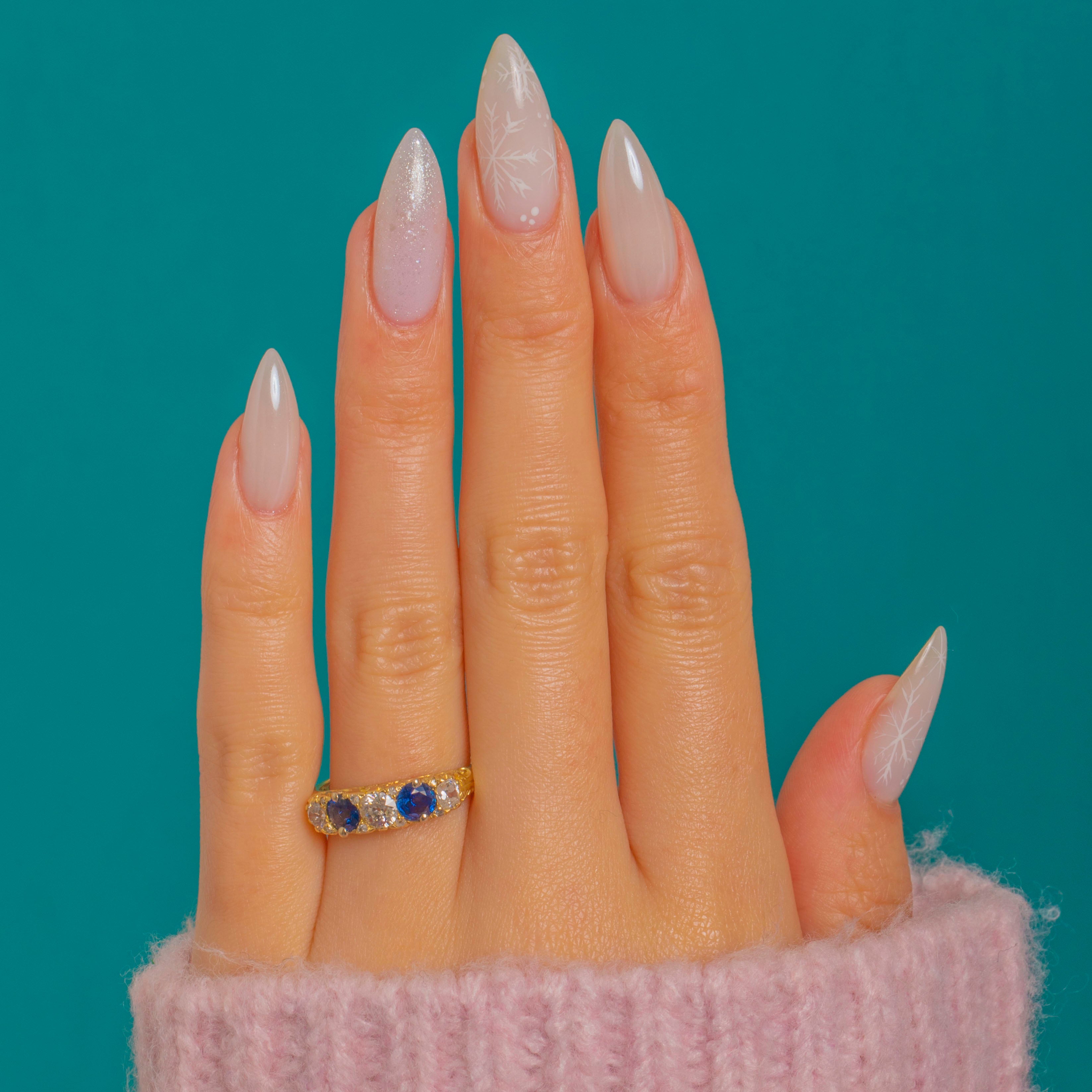 A classic Victorian five-stone half-hoop, this ring marries rich 18ct Gold with a timeless rhythm of deep blue Sapphire and sparkling Old Mine Cut Diamond. The stones are arranged in a subtle graduation with the central Diamond slightly larger, bead/claw set across the finger with open backs to invite light. Delicate colourless accents nestled between each principal stone add a fine, continuous shimmer.