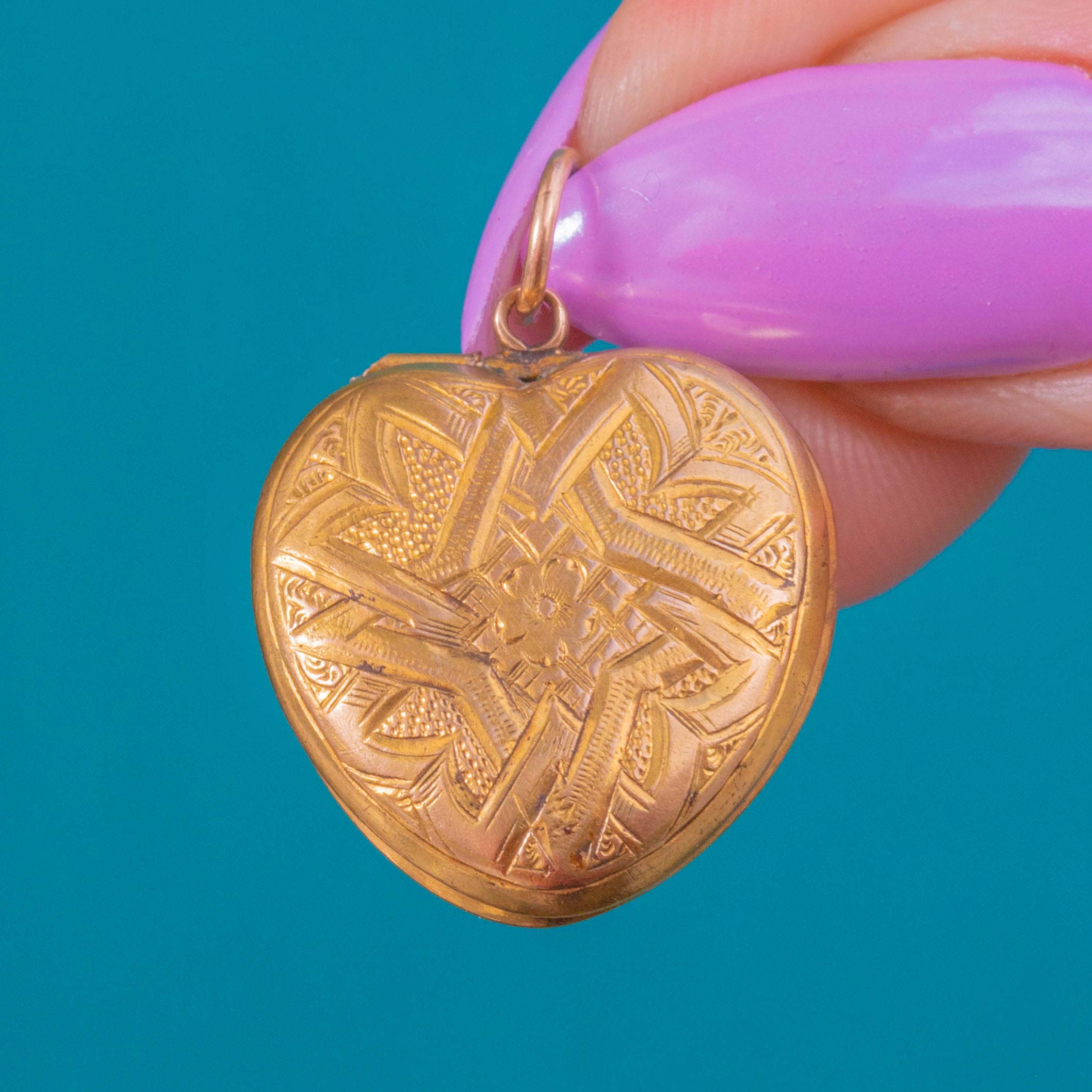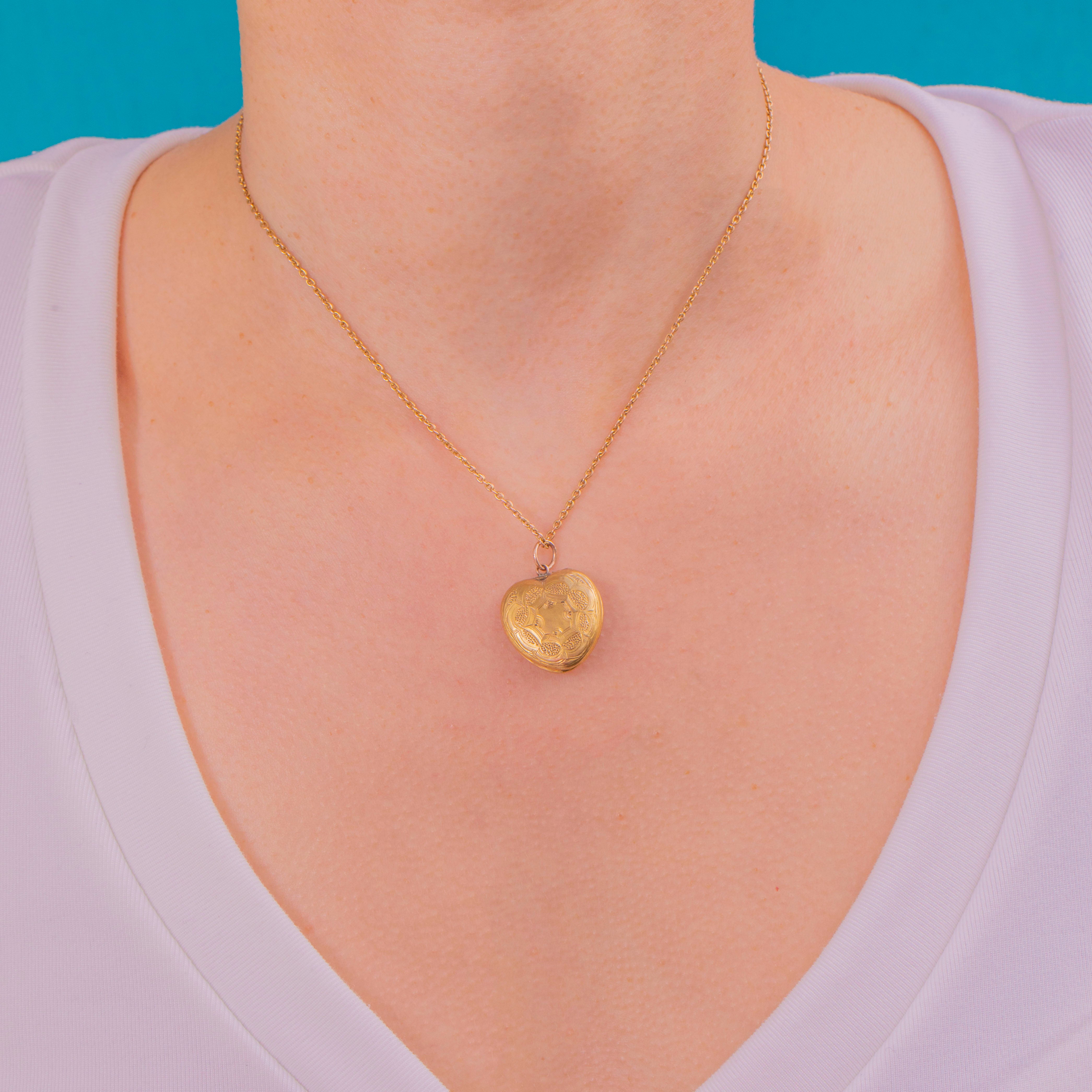 A tender token of Victorian romance, this petite heart locket is crafted in glowing 15ct Gold and finished with beautiful hand-engravings. At the centre, a delicate star/rosette radiates across softly stippled and panelled textures, catching the light with every movement. Elegant and timeless, it’s a charming keepsake to wear close to the heart.