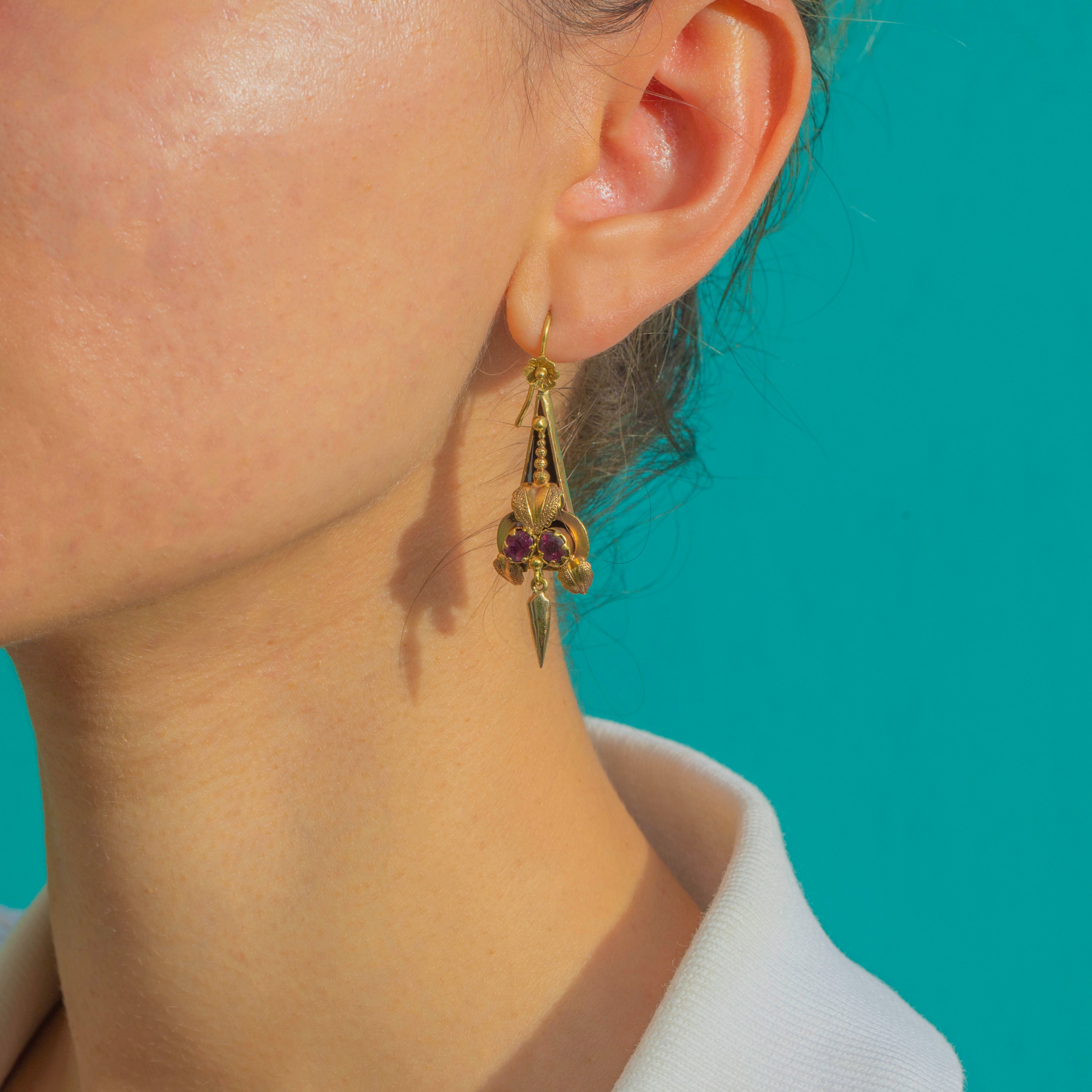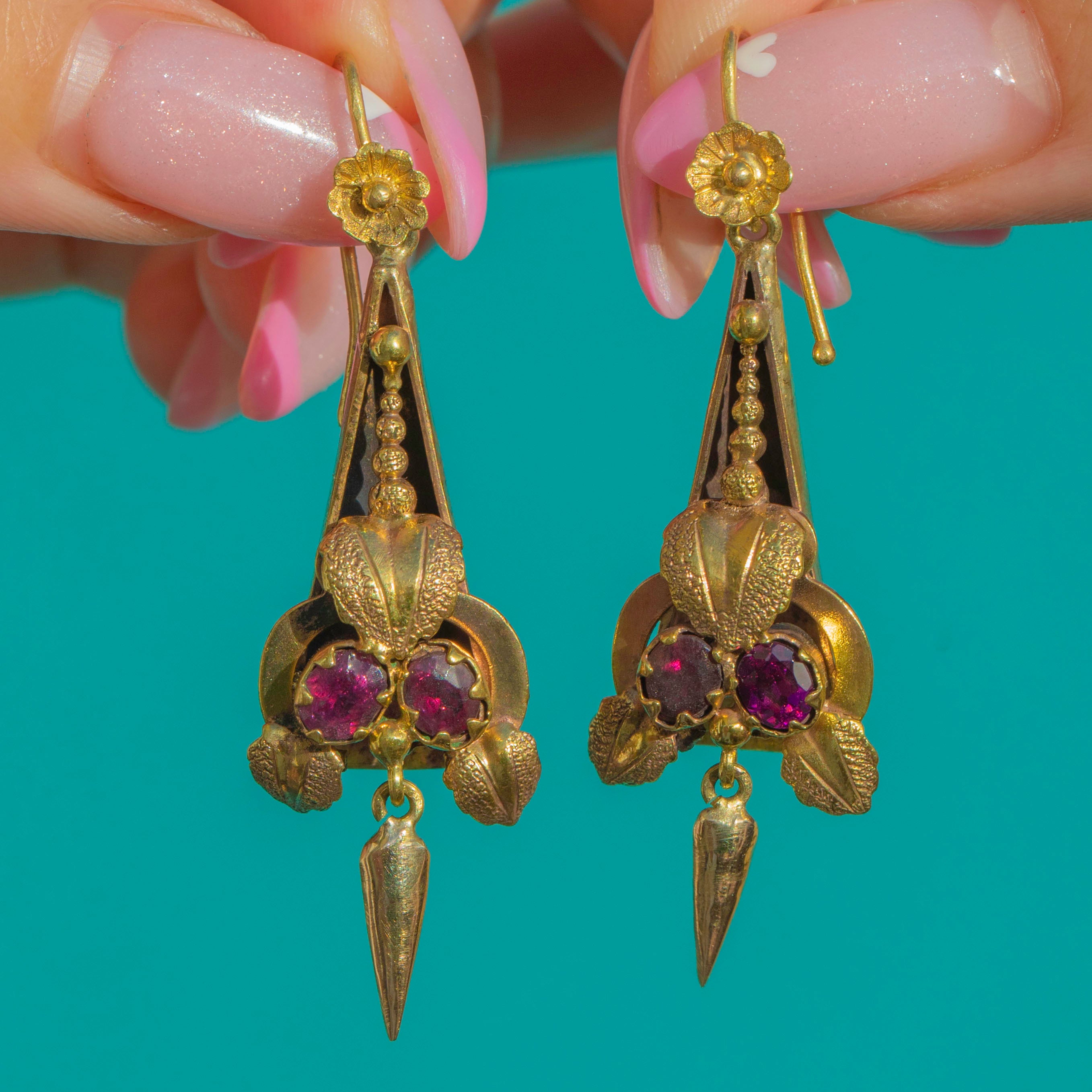 Victorian Etruscan Revival 15ct Gold Garnet Drop Earrings, c.1870–1885
