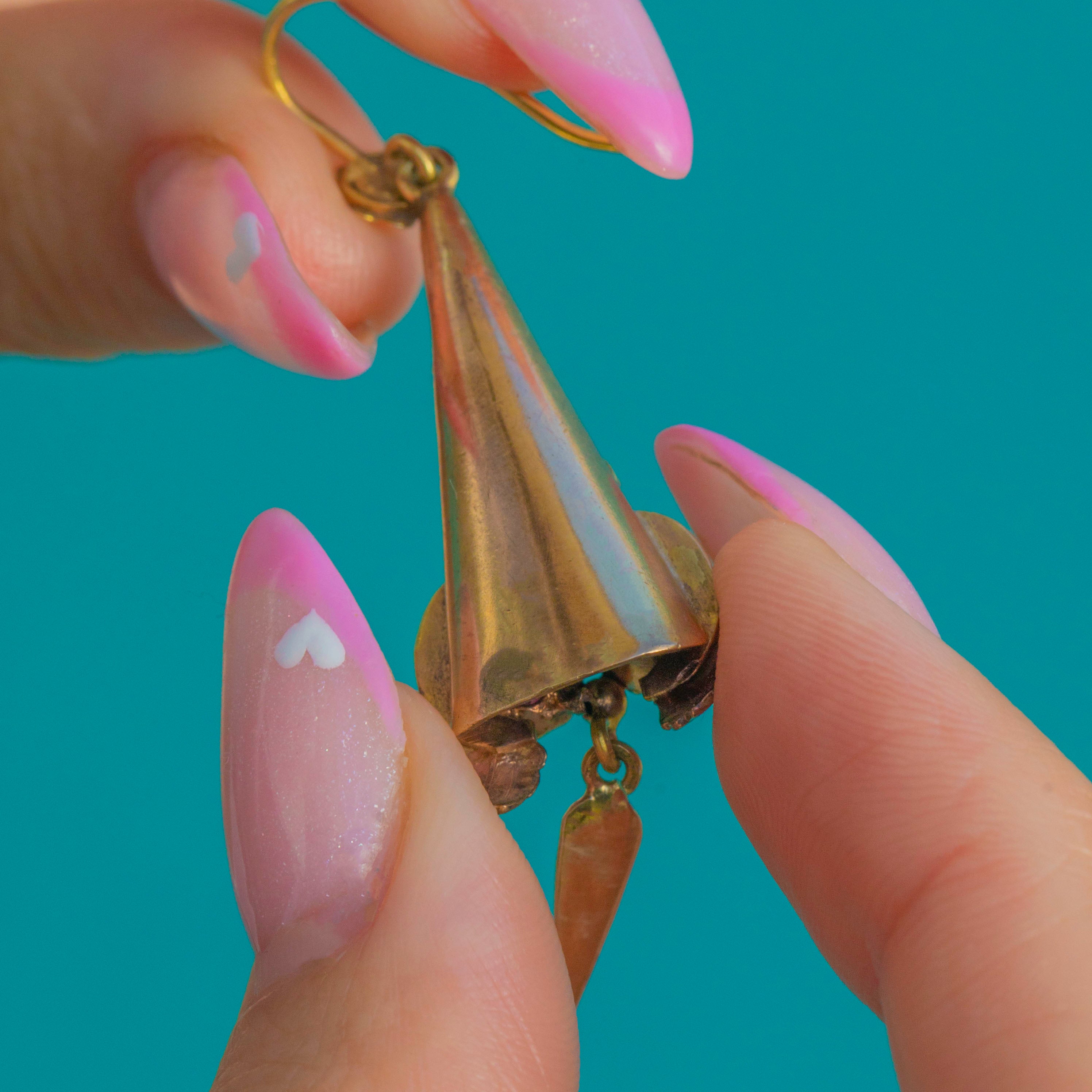 The richly detailed design and elongated drop shape embody the opulence and craftsmanship of the Etruscan Revival era. Elegant, sculptural and full of history, these earrings are a wonderful example of high Victorian style, luxurious yet timelessly wearable.