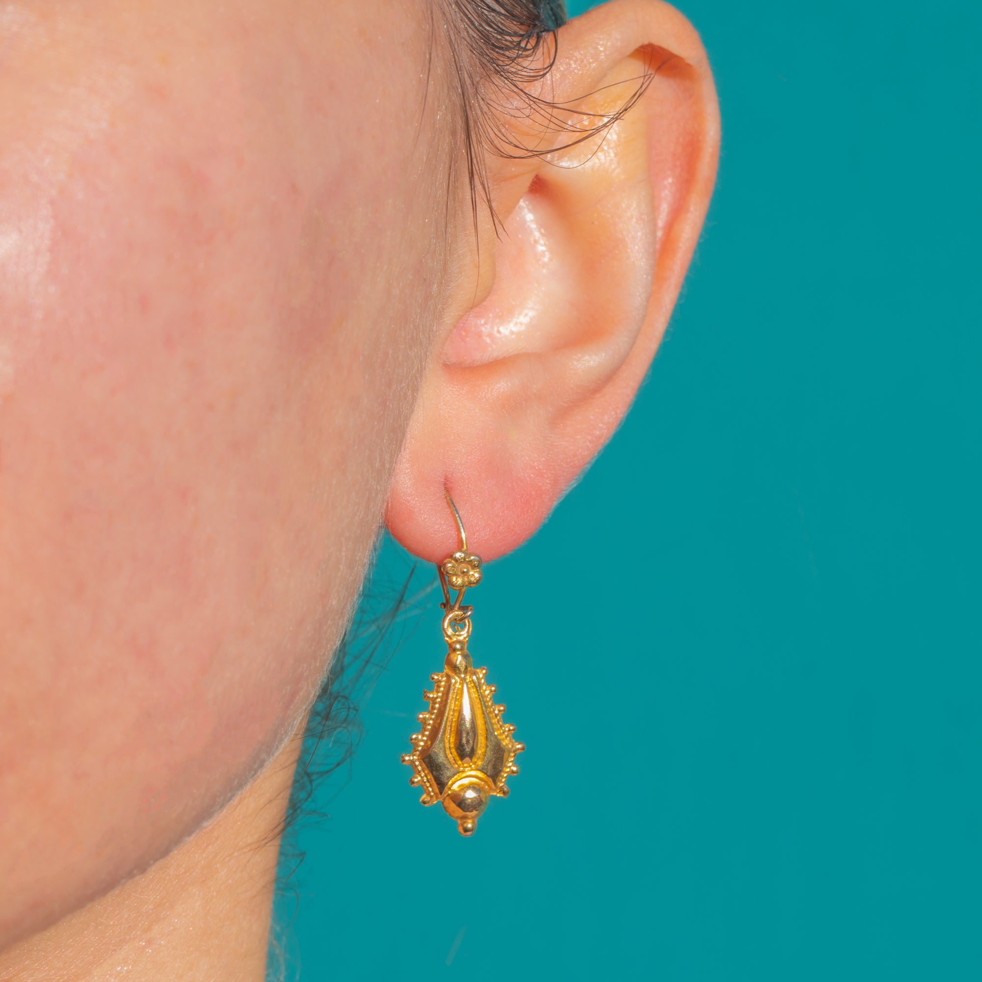 Crafted with traditional hollow, die-stamped elements and fitted with shepherd hooks, they embody the ornate yet refined taste of the 19th century. Timeless, graceful and endlessly versatile, they add a touch of antique romance to any look.
