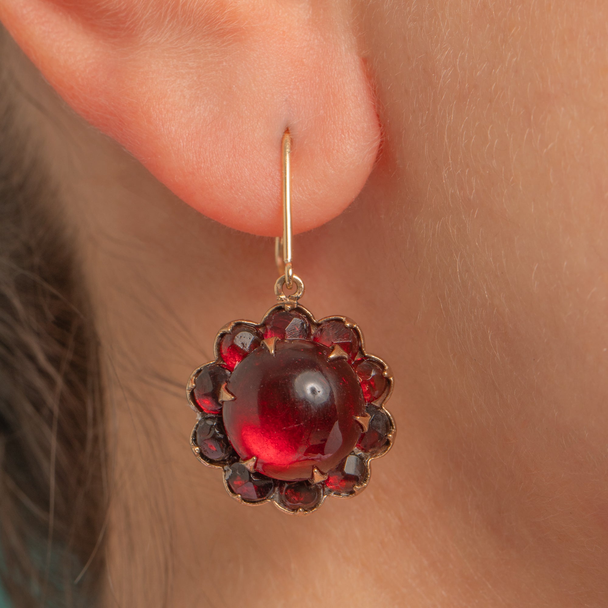 Deliciously romantic and richly hued, these Victorian rosette earrings centre on high-domed Garnet glass cabochons, each encircled by a halo of matching faceted stones in scalloped settings. The warm gold-tone settings amplify the deep wine-red glow, while the compact floral silhouette brings a timeless, antique elegance.