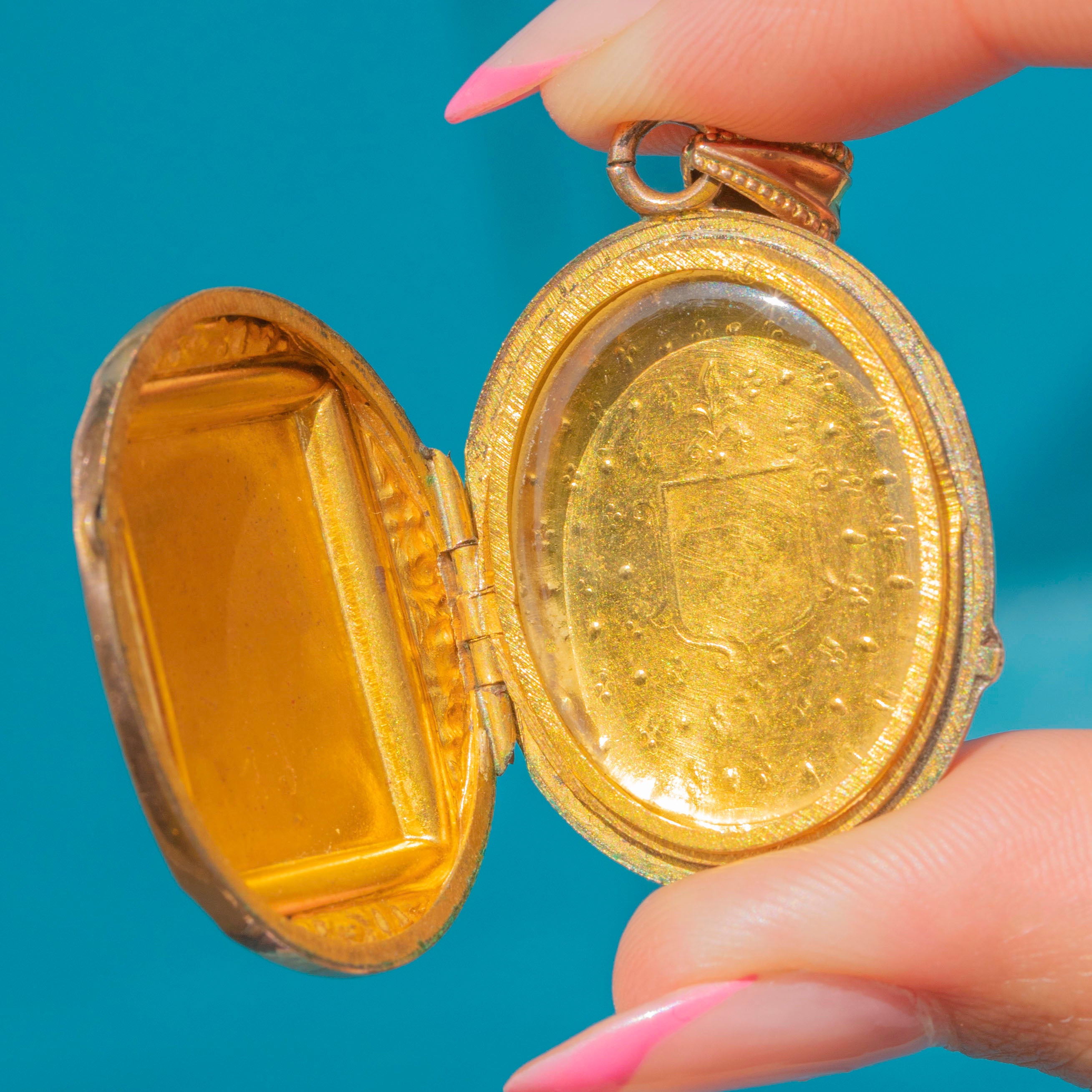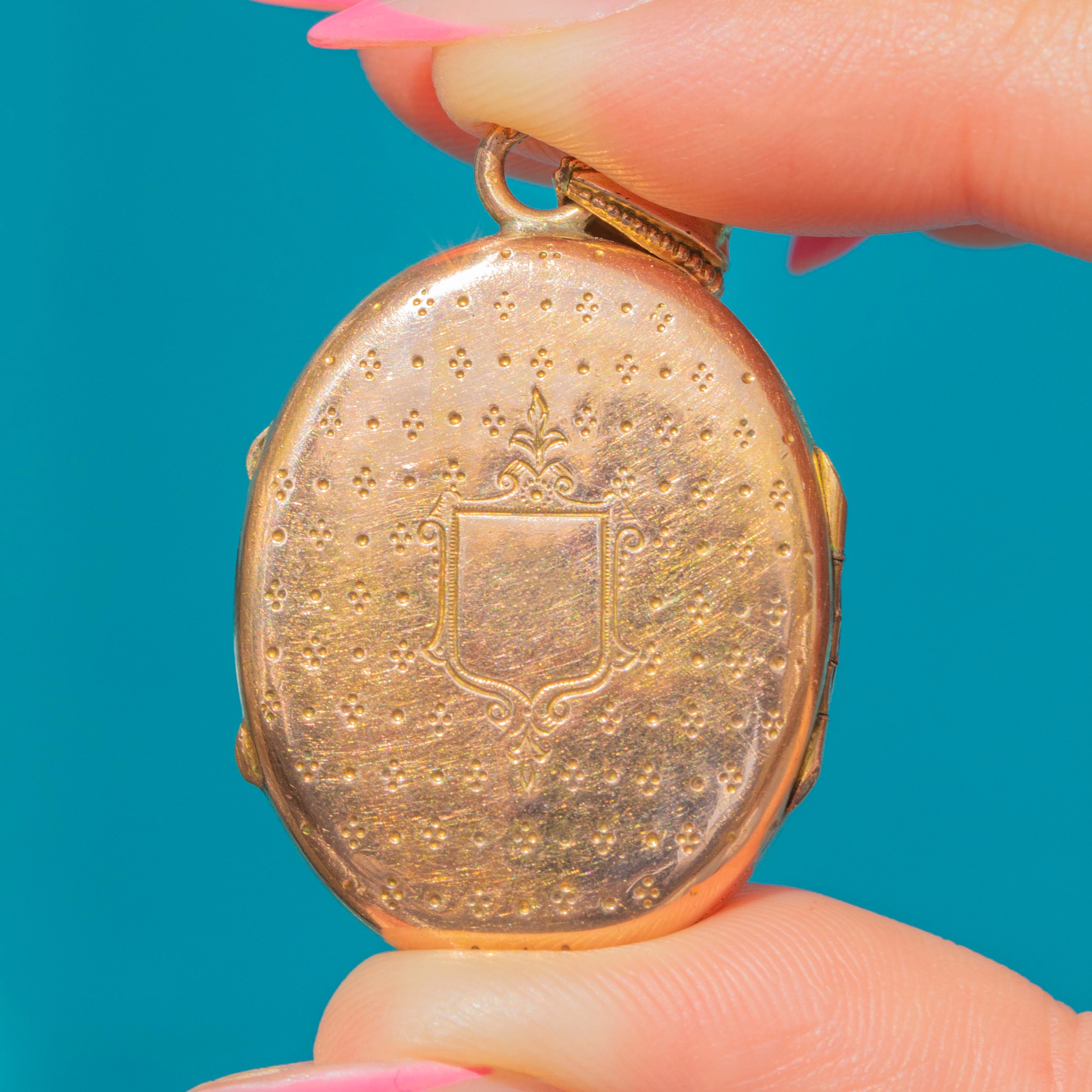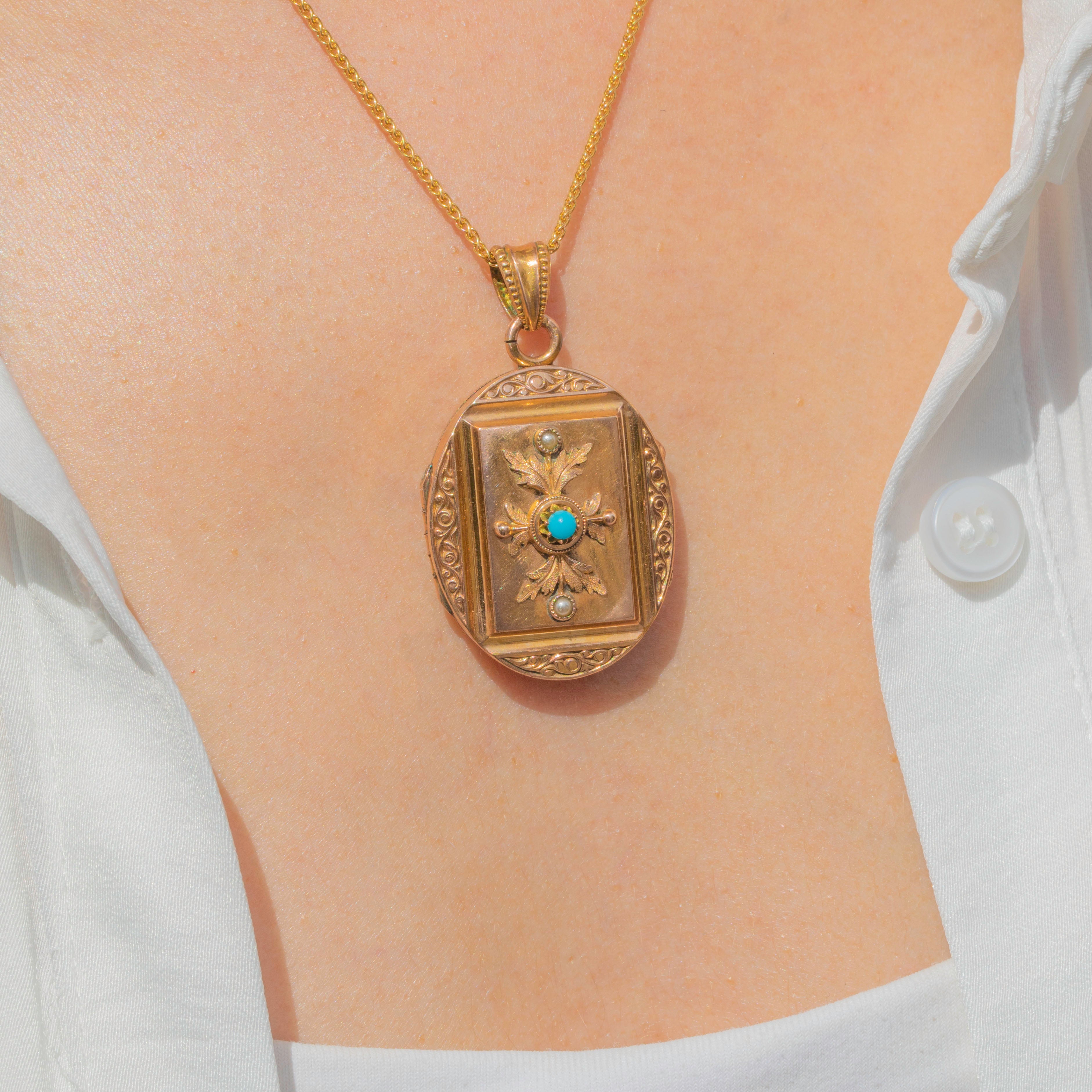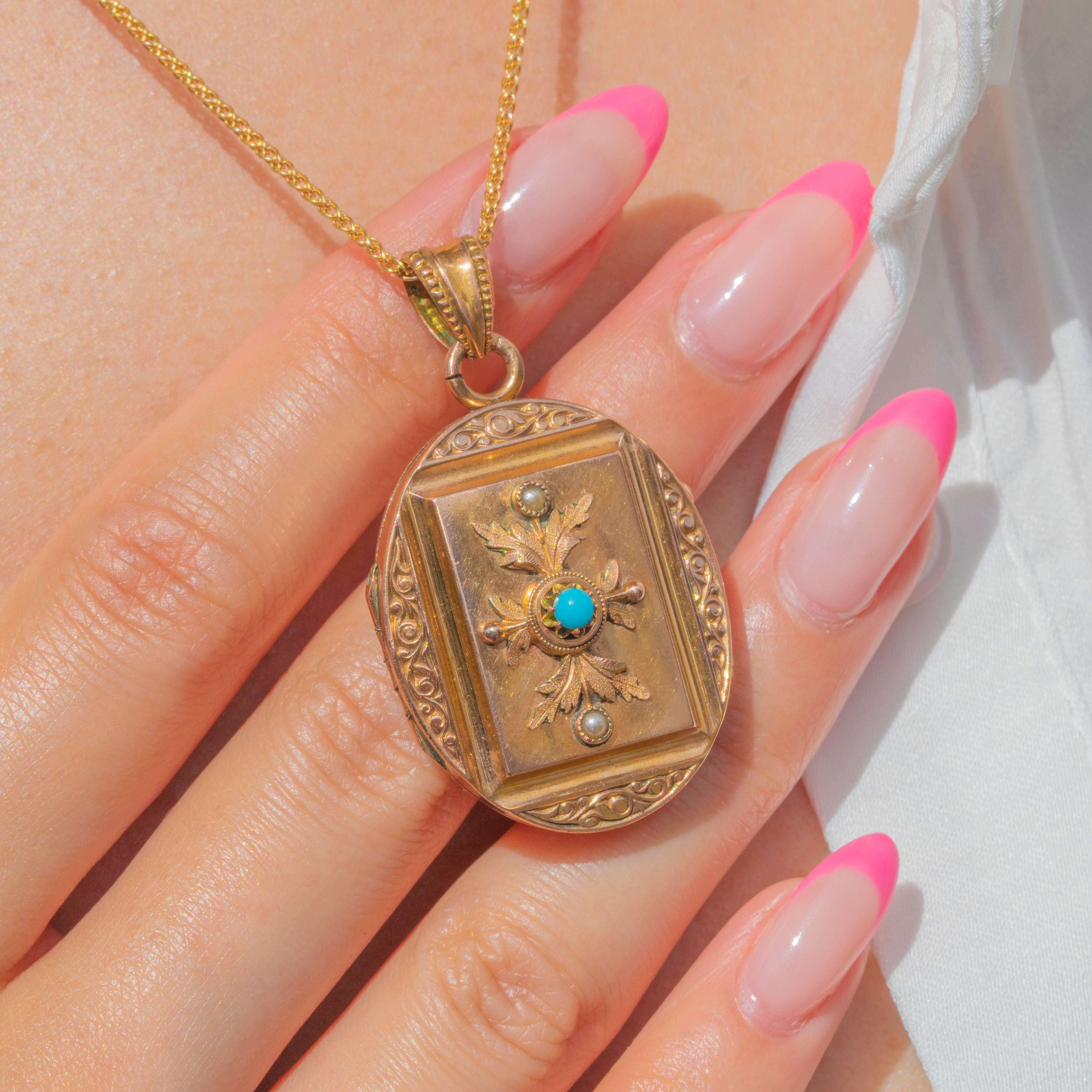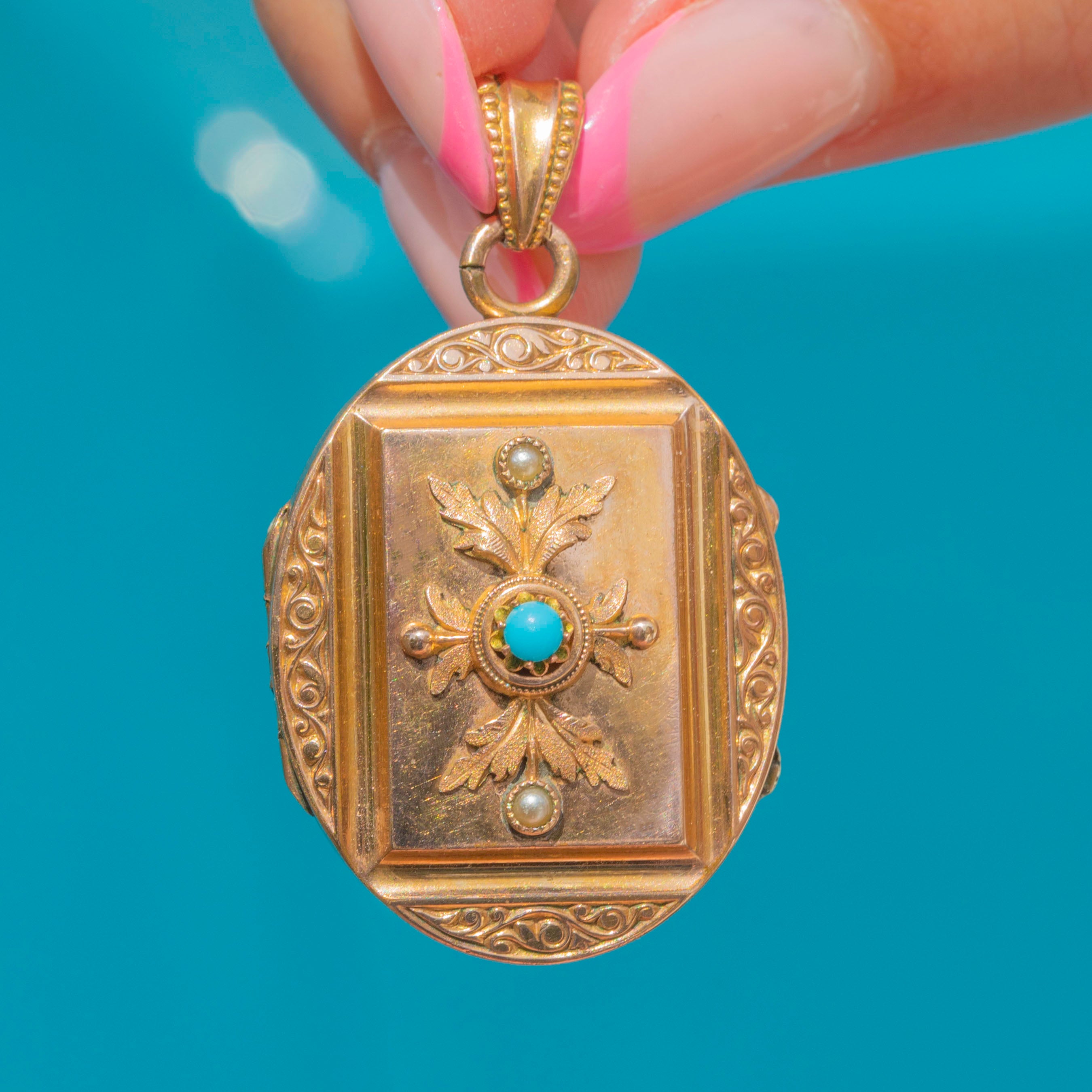 VERY GOOD: This Victorian 9ct Gold Turquoise Pearl locket is in very good condition. The Gold has a gorgeous satin hue and the details have all remained defined. There is some general age-related wear throughout, including some discolouration around the gemstone settings and light scratches, but the locket has held its form well with no dents visible. The gemstones are secure and the locket closes securely, so you can enjoy wearing this antique Gold locket with utmost confidence!